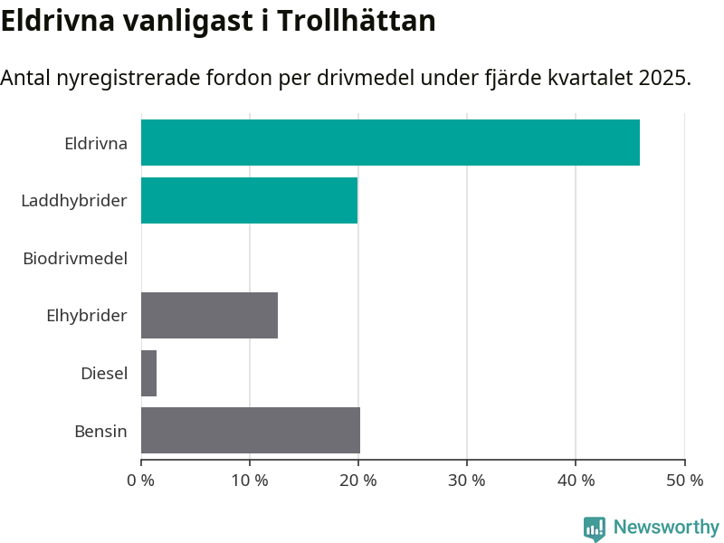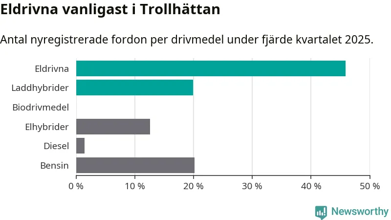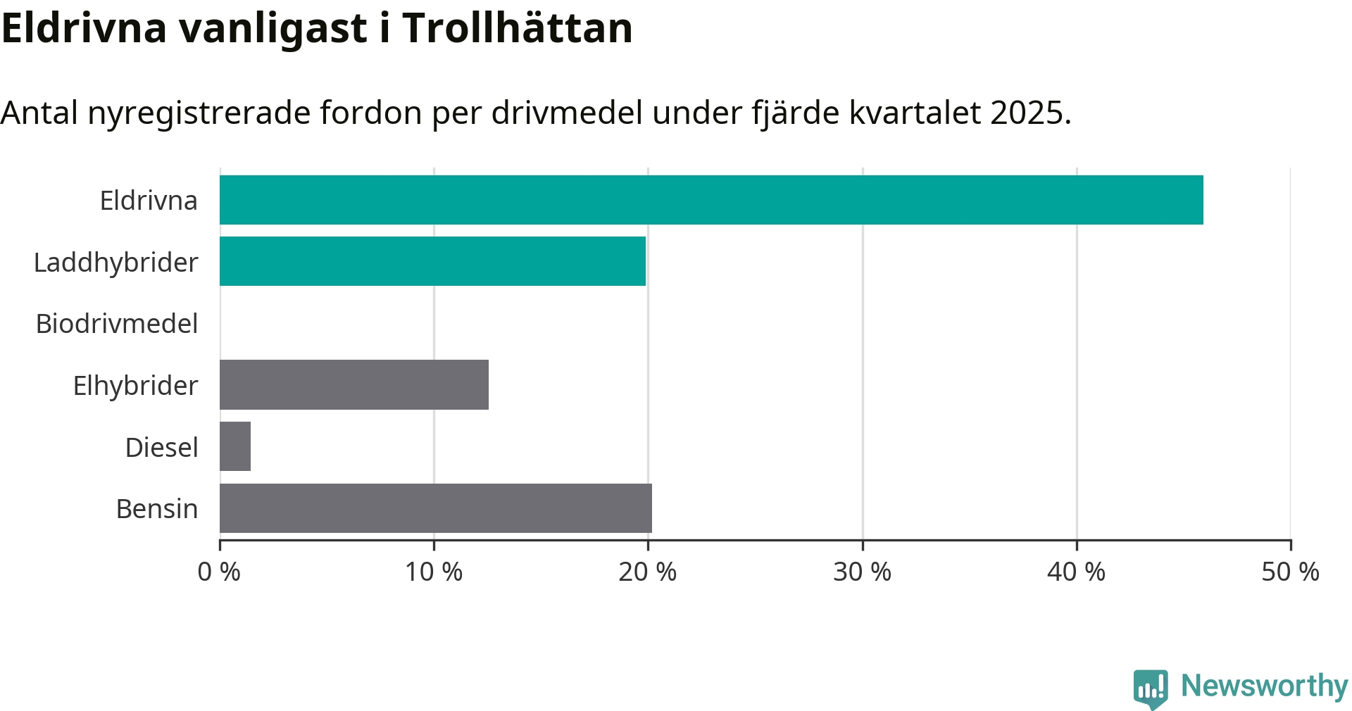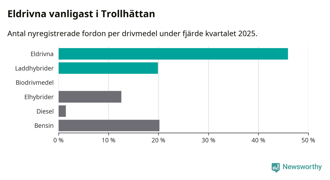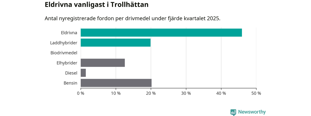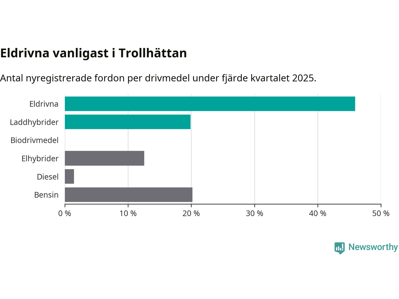 Under fjärde kvartalet 2025 var 66 procent av alla nyregistrerade personbilar i Trollhättan laddbara (sammanlagt registrerades 342 nya bilar). Merparten av de laddbara bilarna var rena elbilar (46 procent av alla).