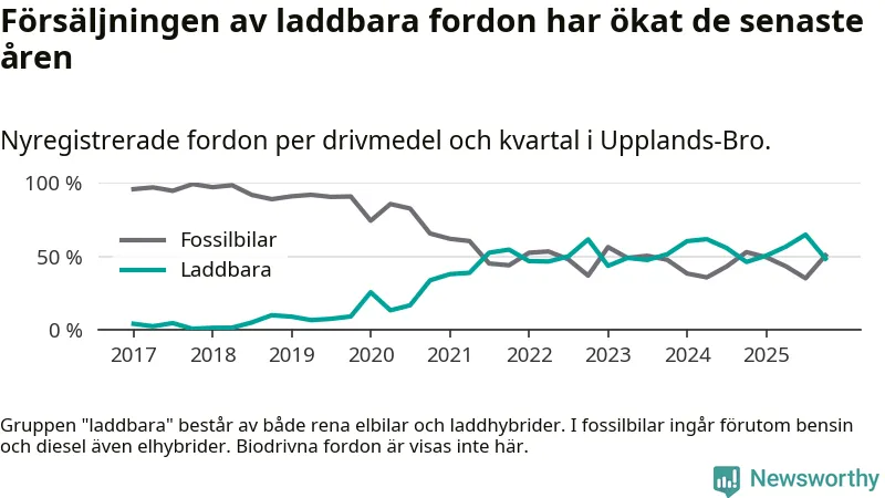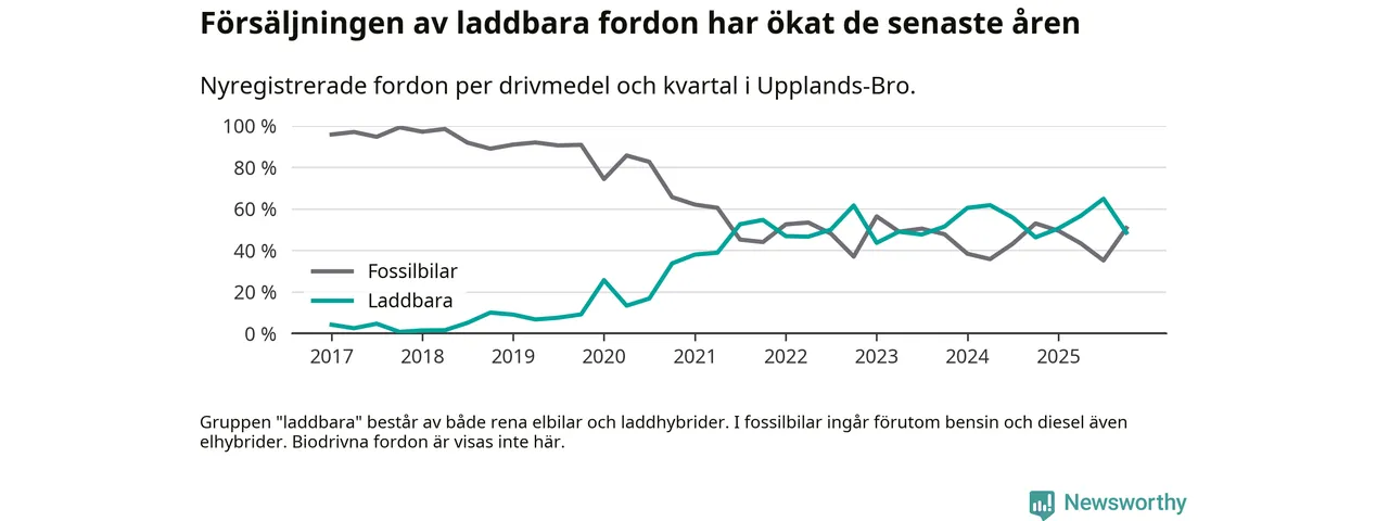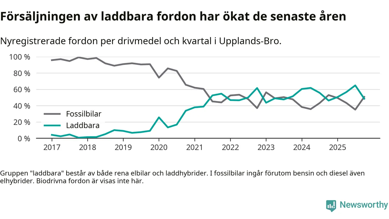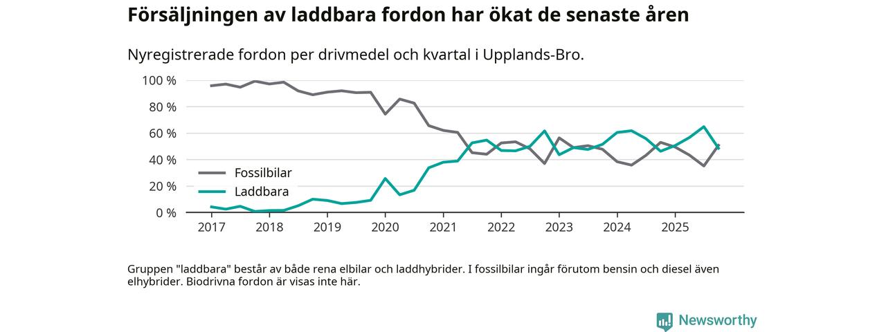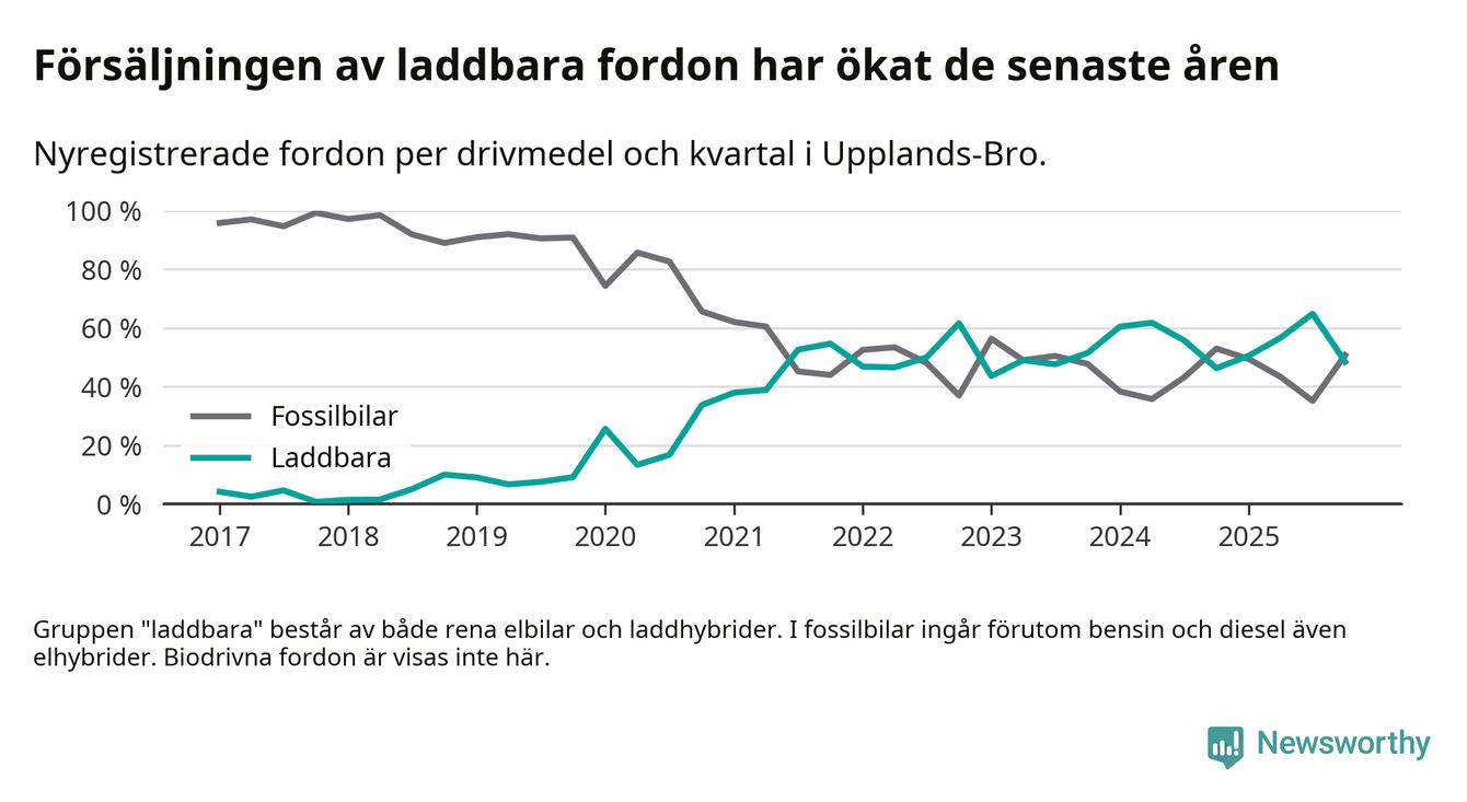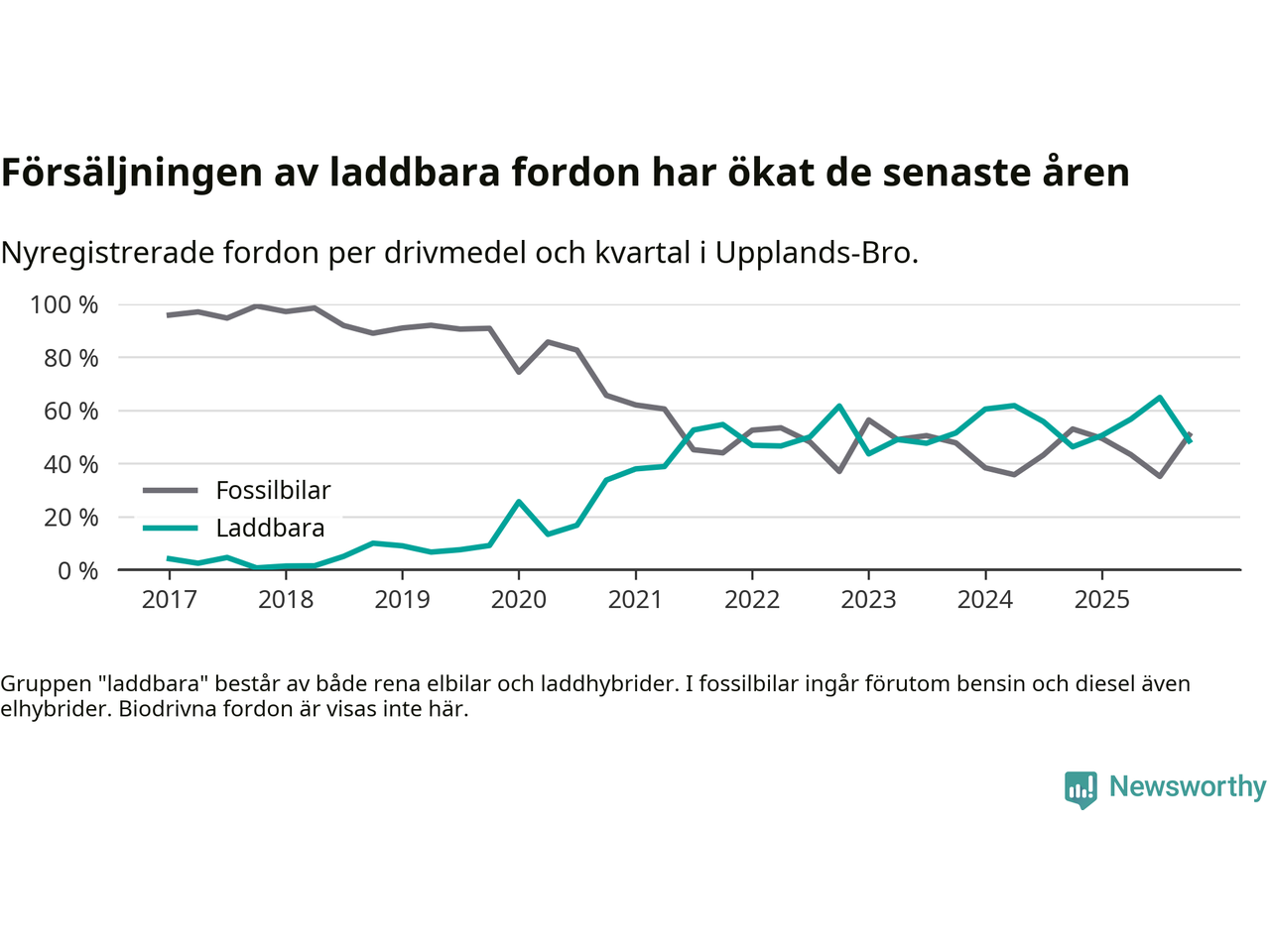 Under fjärde kvartalet 2025 var 49 procent av alla nyregistrerade personbilar i Upplands-Bro laddbara (sammanlagt registrerades 136 nya bilar). Merparten av de laddbara bilarna var rena elbilar (27 procent av alla).