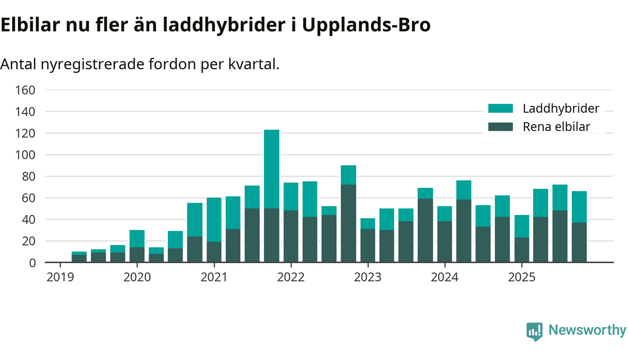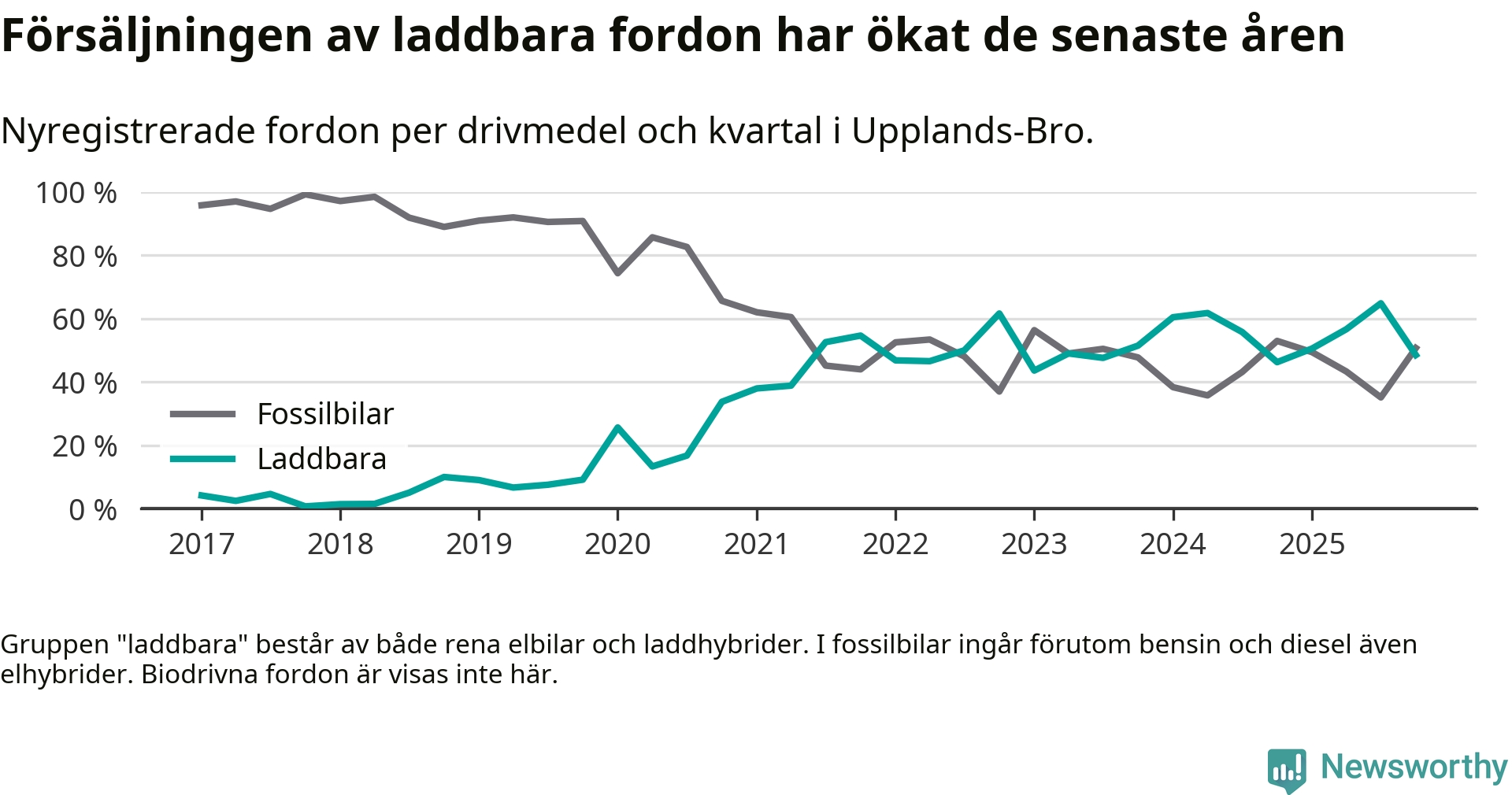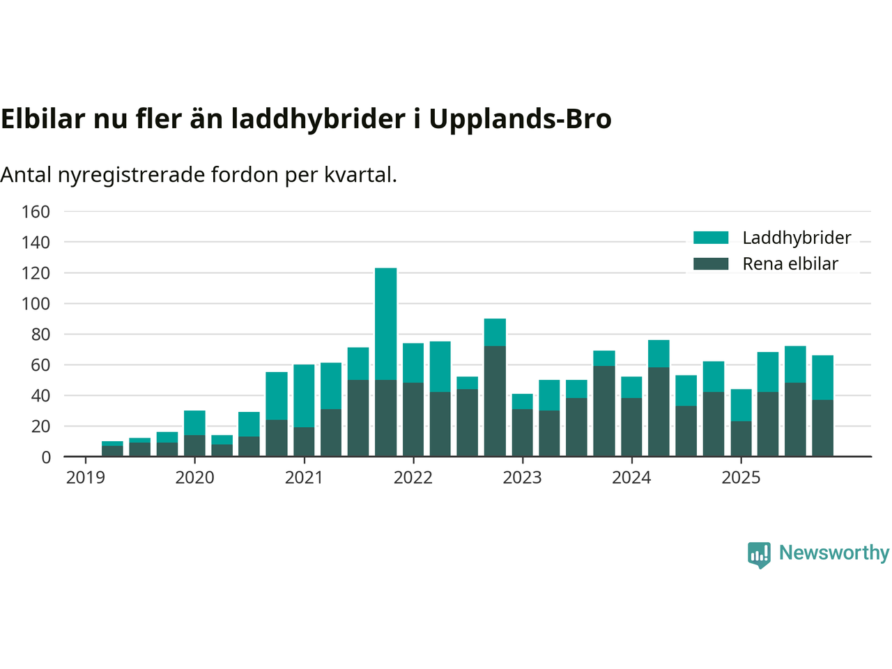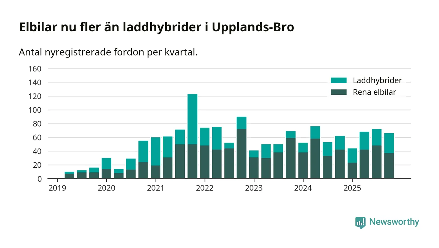 Under fjärde kvartalet 2025 var 49 procent av alla nyregistrerade personbilar i Upplands-Bro laddbara (sammanlagt registrerades 136 nya bilar). Merparten av de laddbara bilarna var rena elbilar (27 procent av alla).
