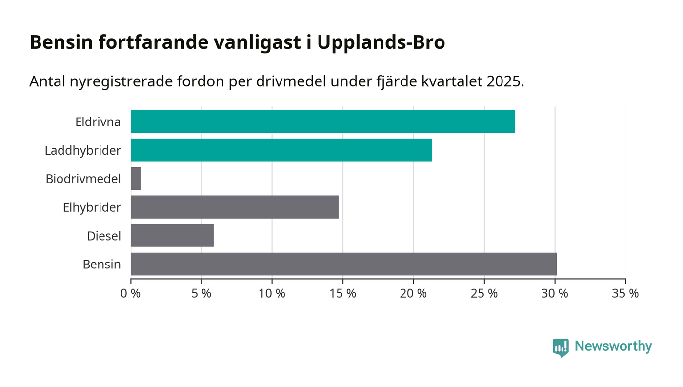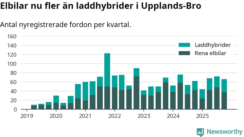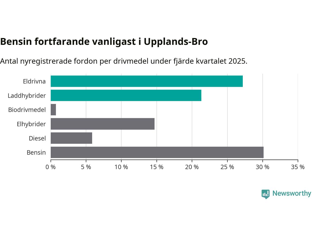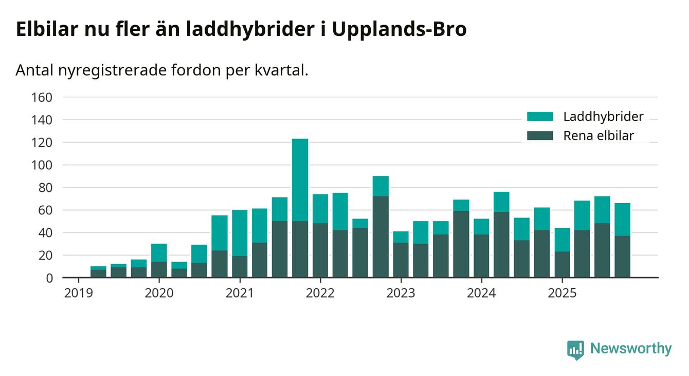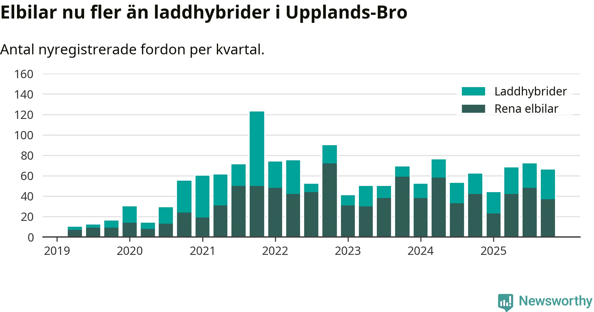 Under fjärde kvartalet 2025 var 49 procent av alla nyregistrerade personbilar i Upplands-Bro laddbara (sammanlagt registrerades 136 nya bilar). Merparten av de laddbara bilarna var rena elbilar (27 procent av alla).