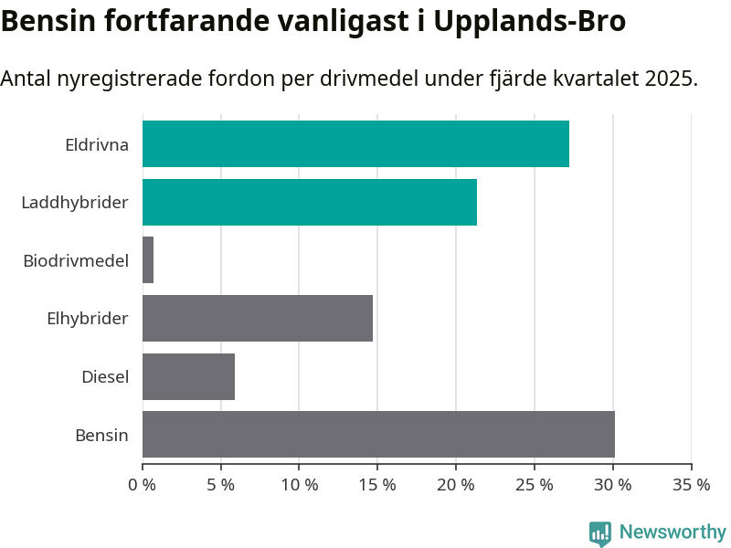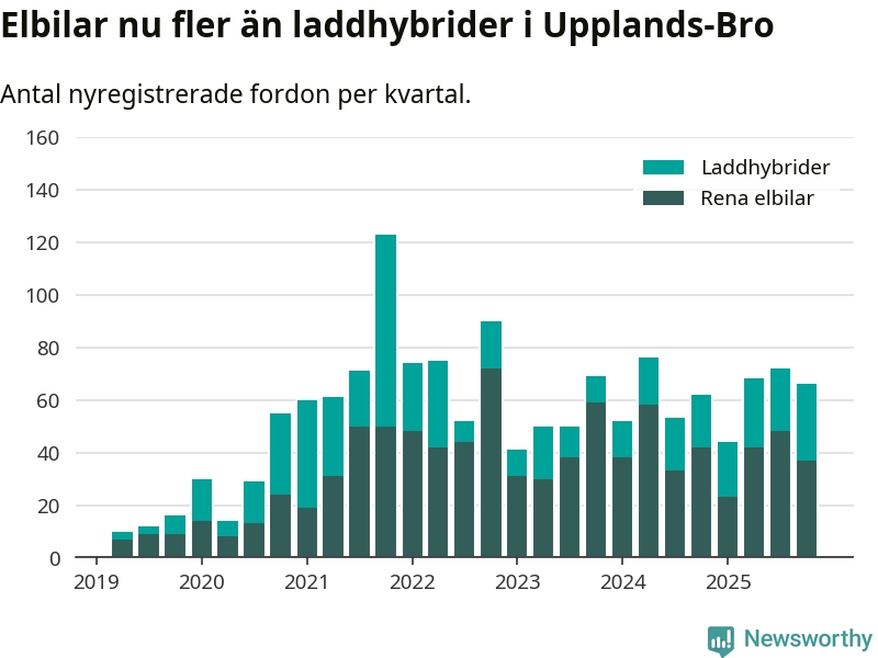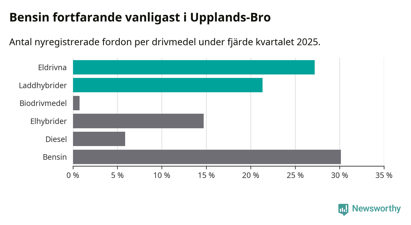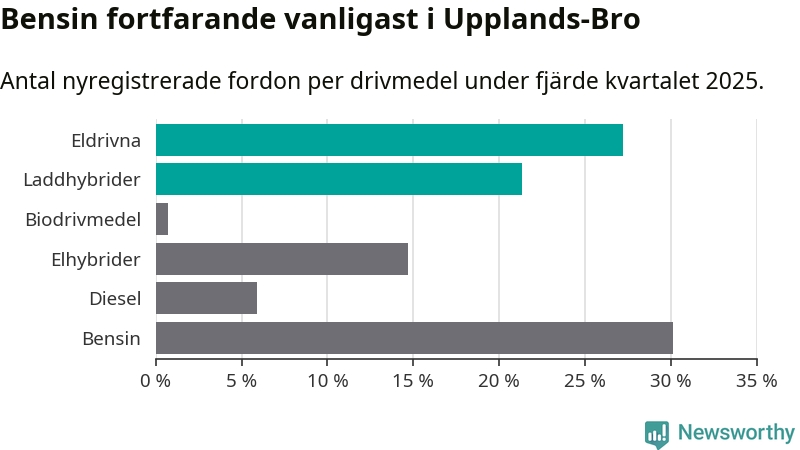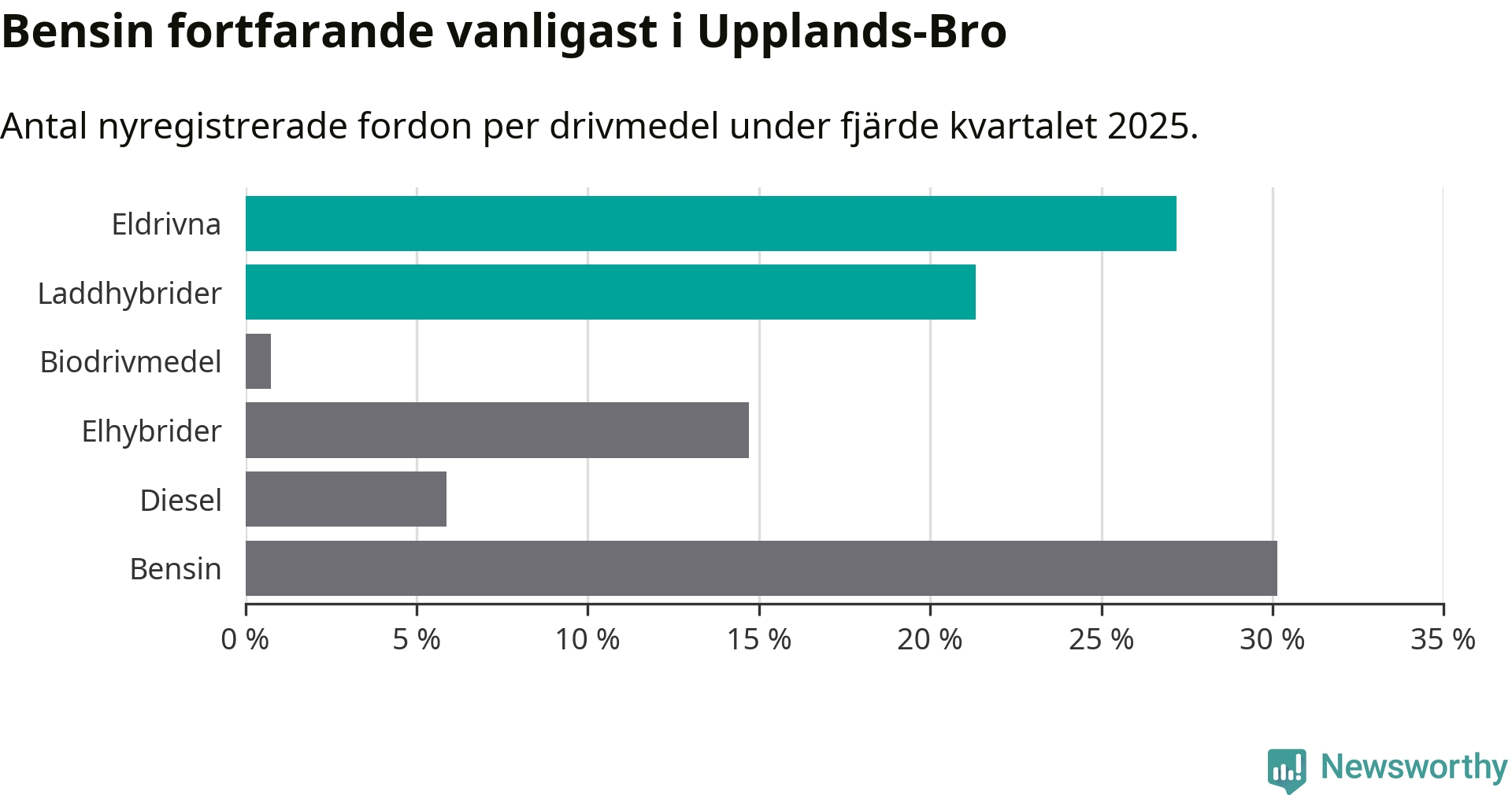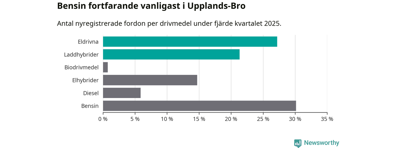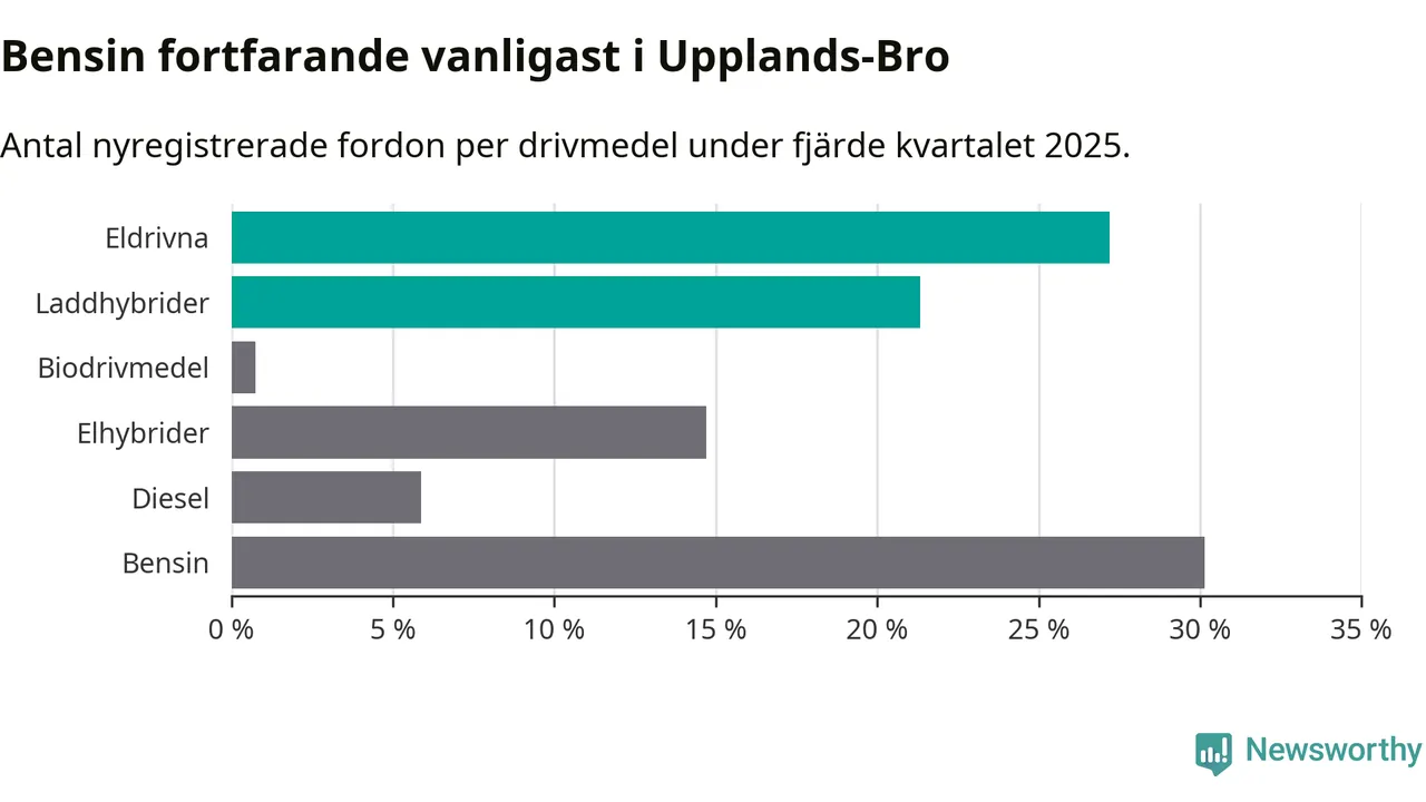 Under fjärde kvartalet 2025 var 49 procent av alla nyregistrerade personbilar i Upplands-Bro laddbara (sammanlagt registrerades 136 nya bilar). Merparten av de laddbara bilarna var rena elbilar (27 procent av alla).