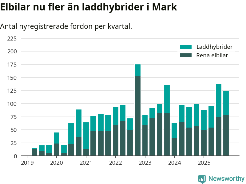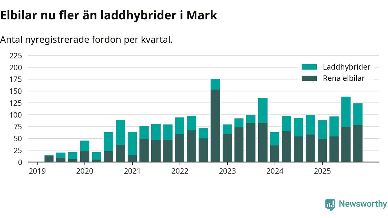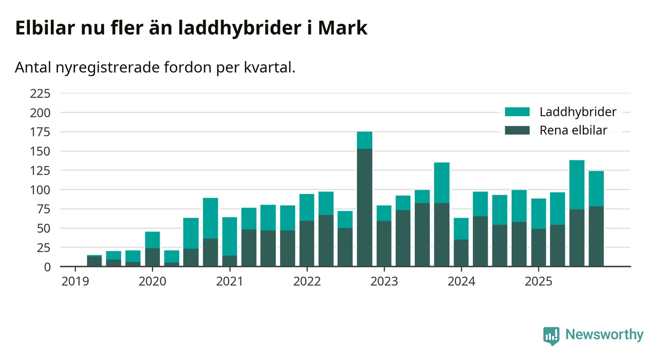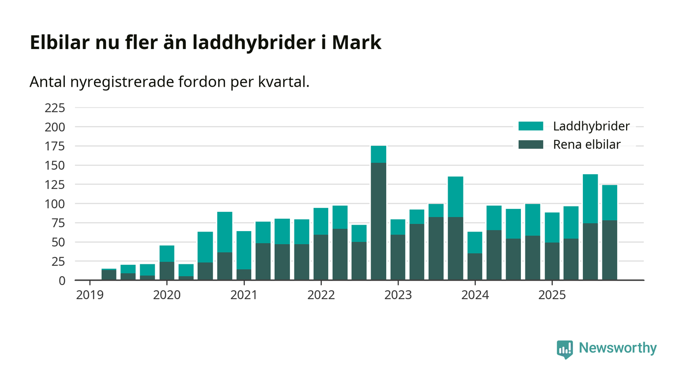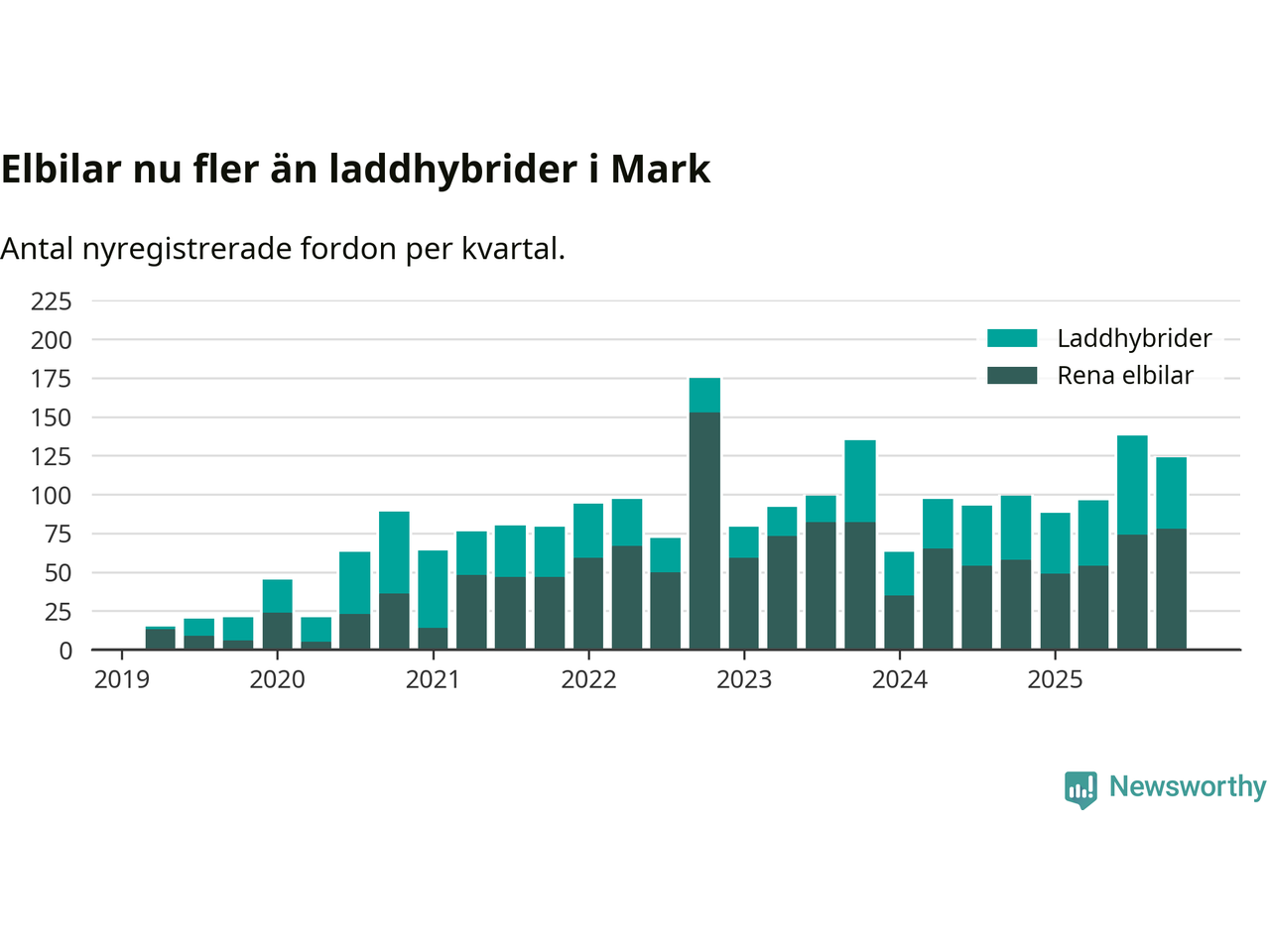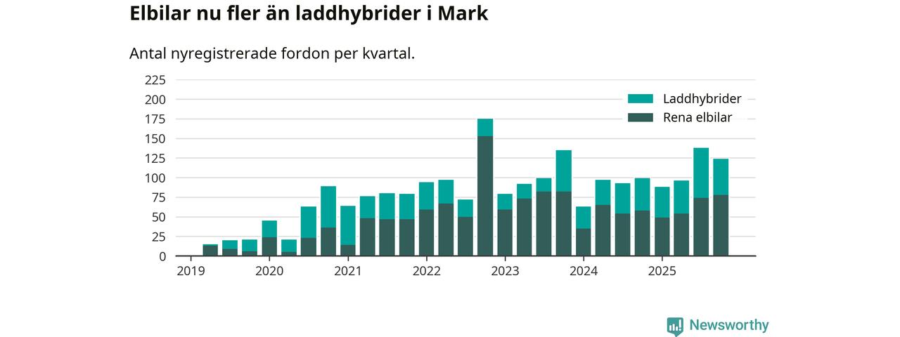 Under fjärde kvartalet 2025 var 47 procent av alla nyregistrerade personbilar i Mark laddbara (sammanlagt registrerades 265 nya bilar). Merparten av de laddbara bilarna var rena elbilar (29 procent av alla).