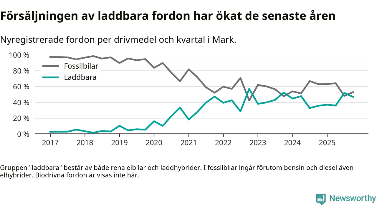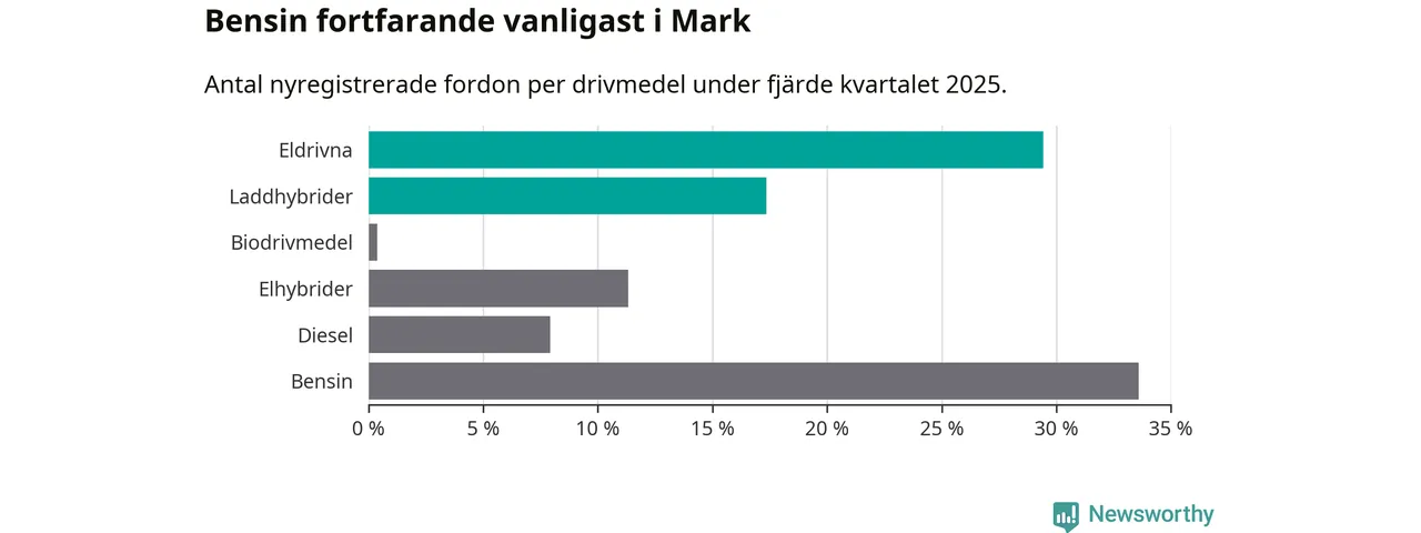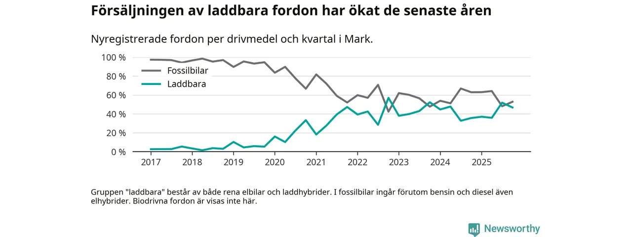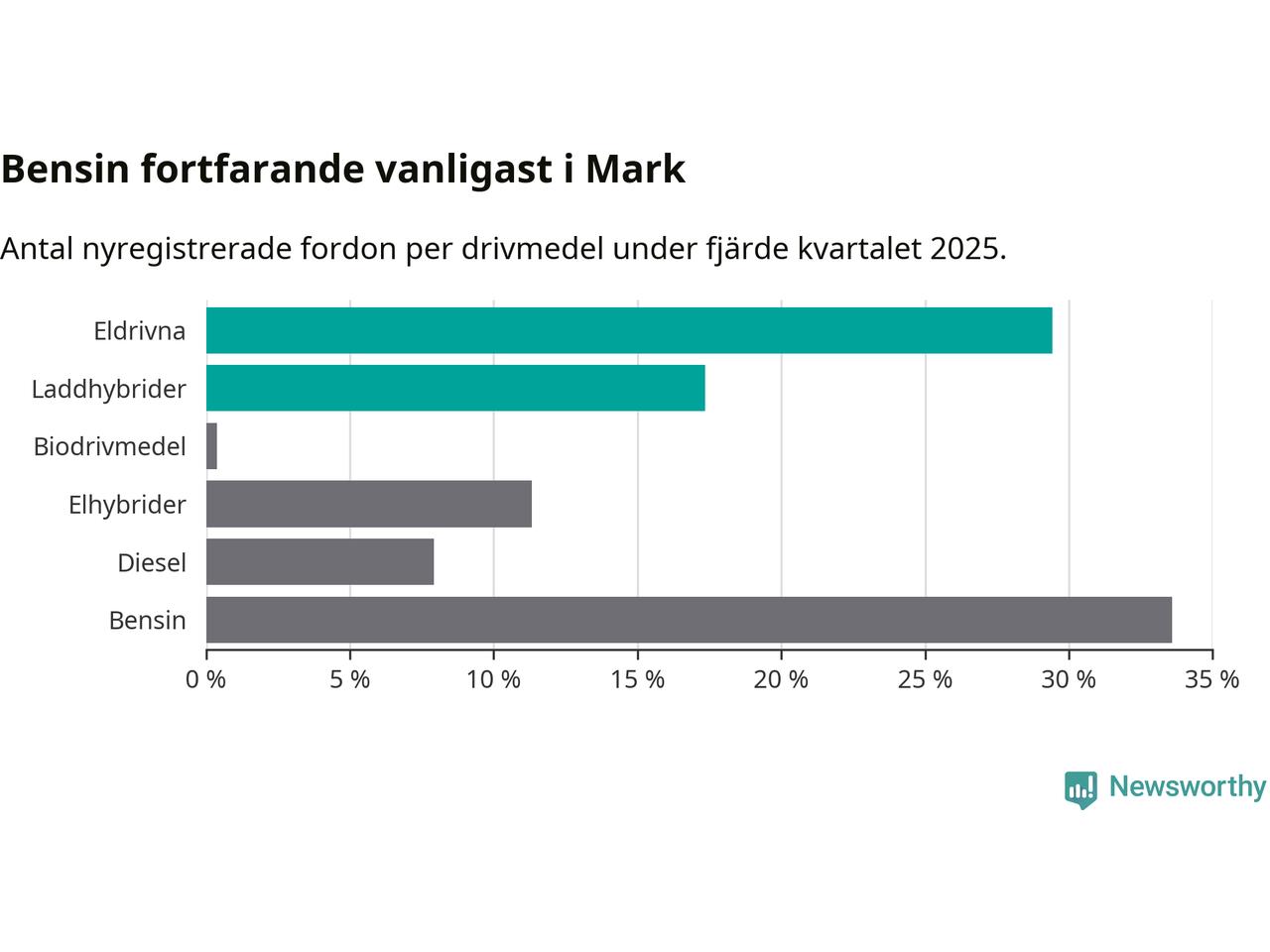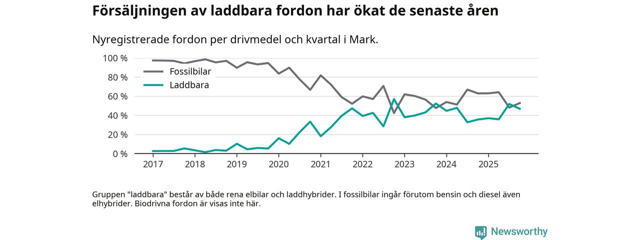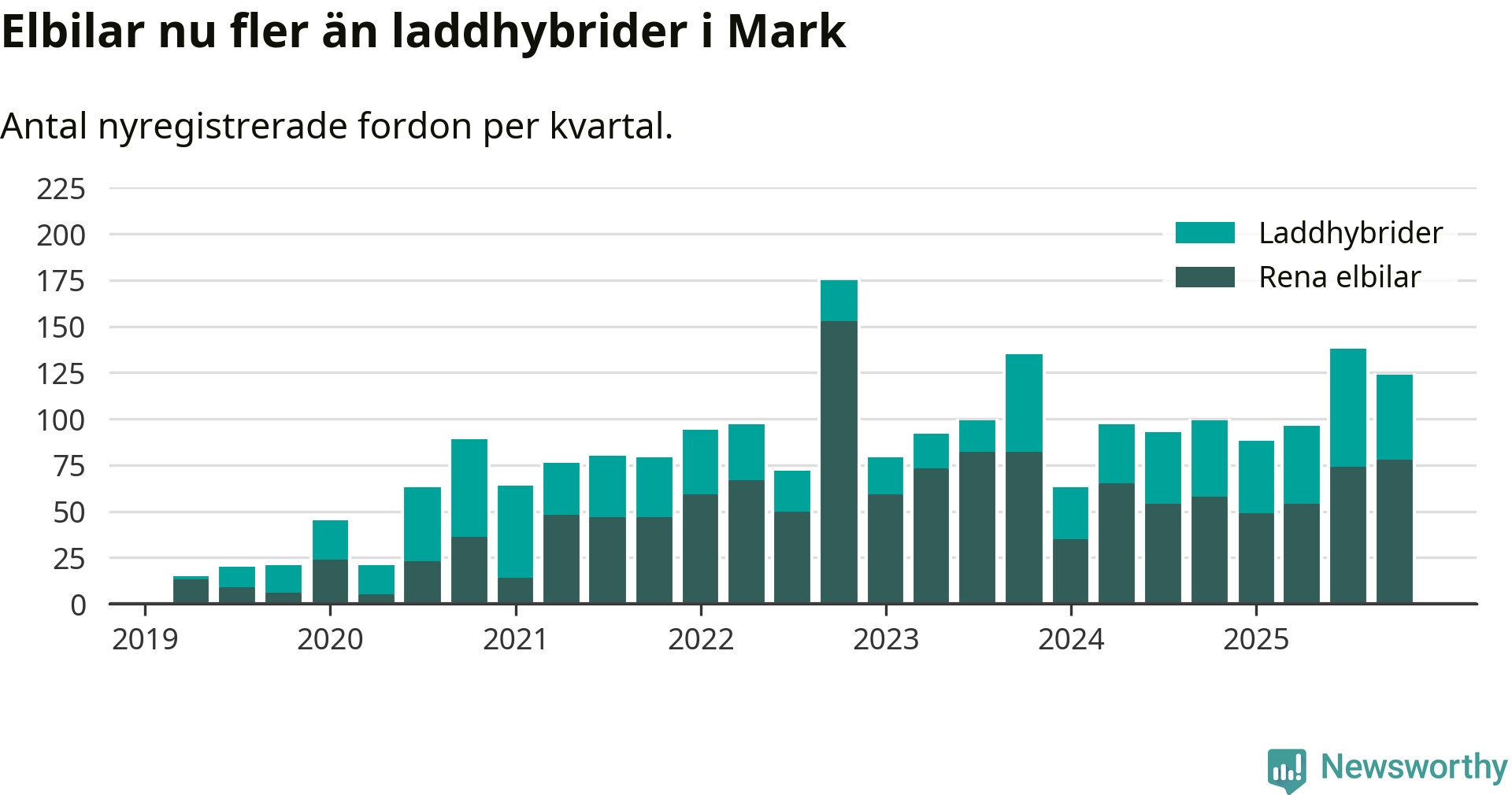 Under fjärde kvartalet 2025 var 47 procent av alla nyregistrerade personbilar i Mark laddbara (sammanlagt registrerades 265 nya bilar). Merparten av de laddbara bilarna var rena elbilar (29 procent av alla).