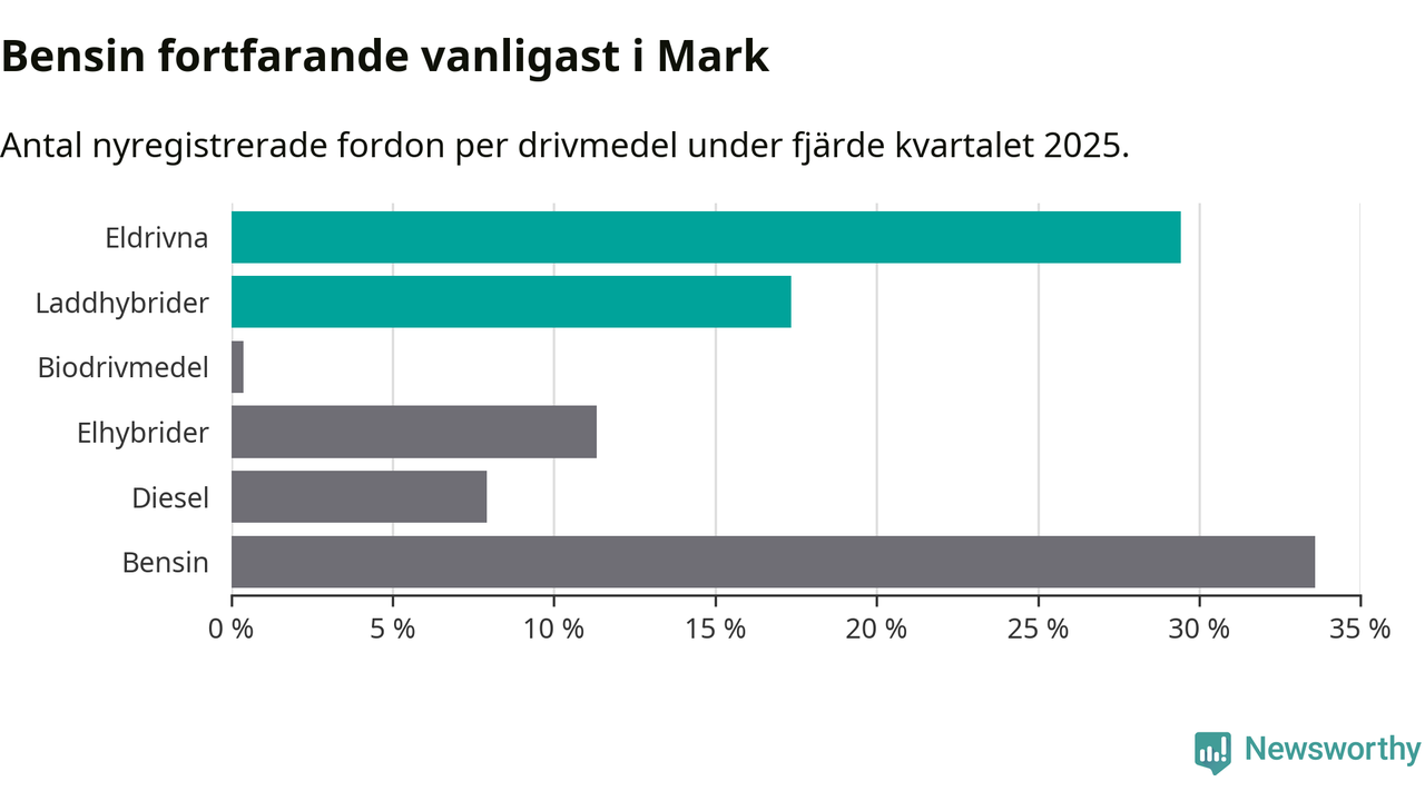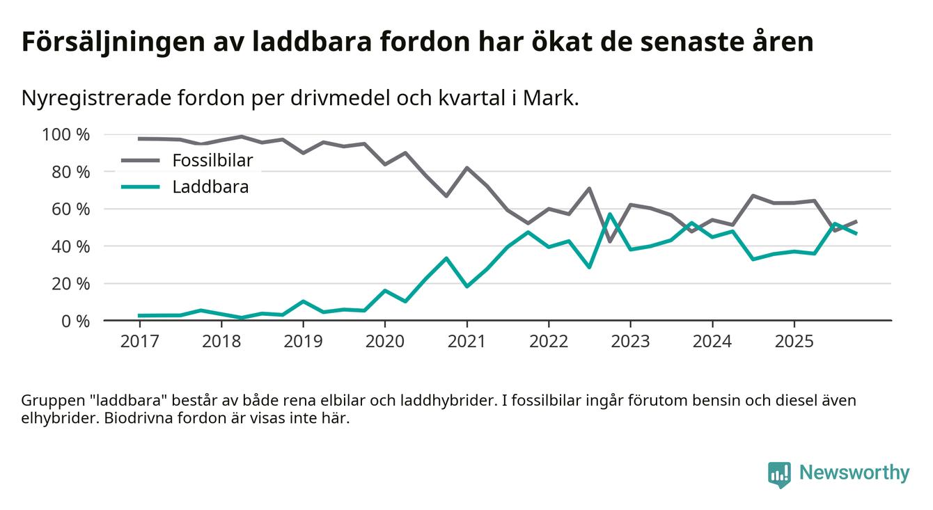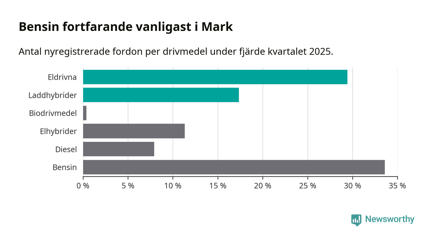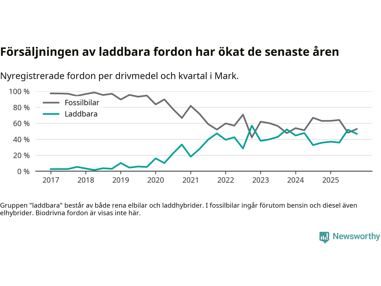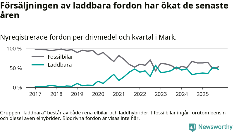 Under fjärde kvartalet 2025 var 47 procent av alla nyregistrerade personbilar i Mark laddbara (sammanlagt registrerades 265 nya bilar). Merparten av de laddbara bilarna var rena elbilar (29 procent av alla).