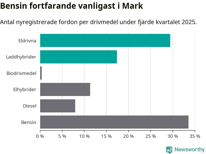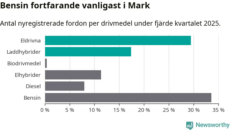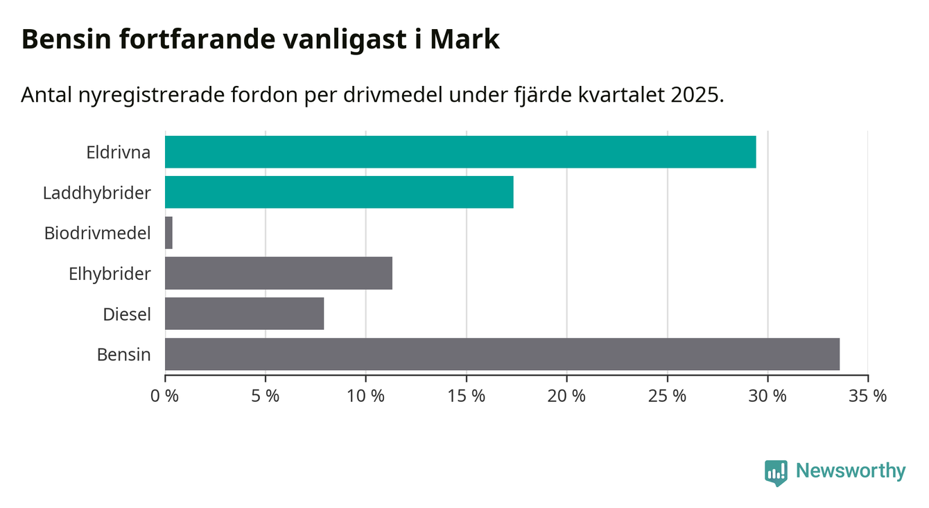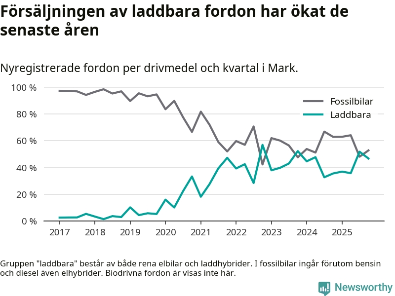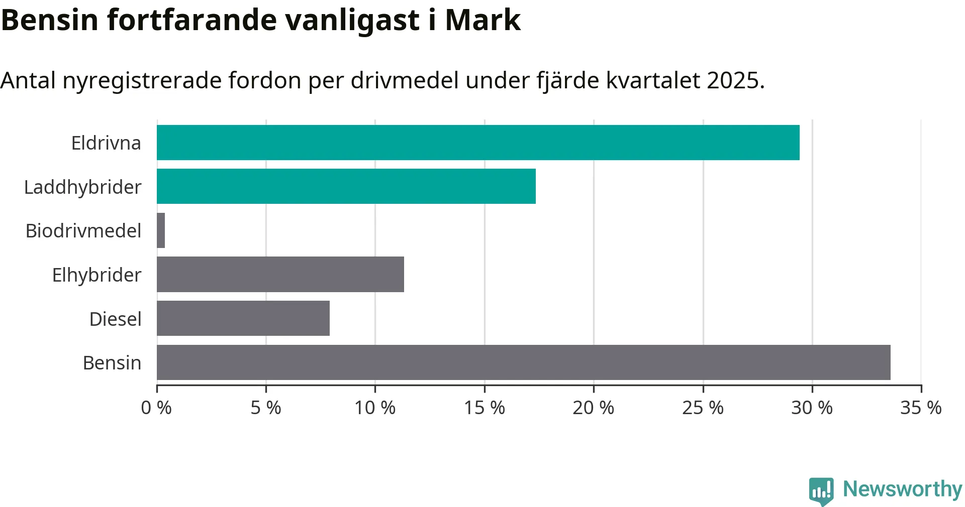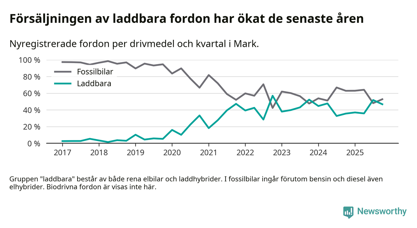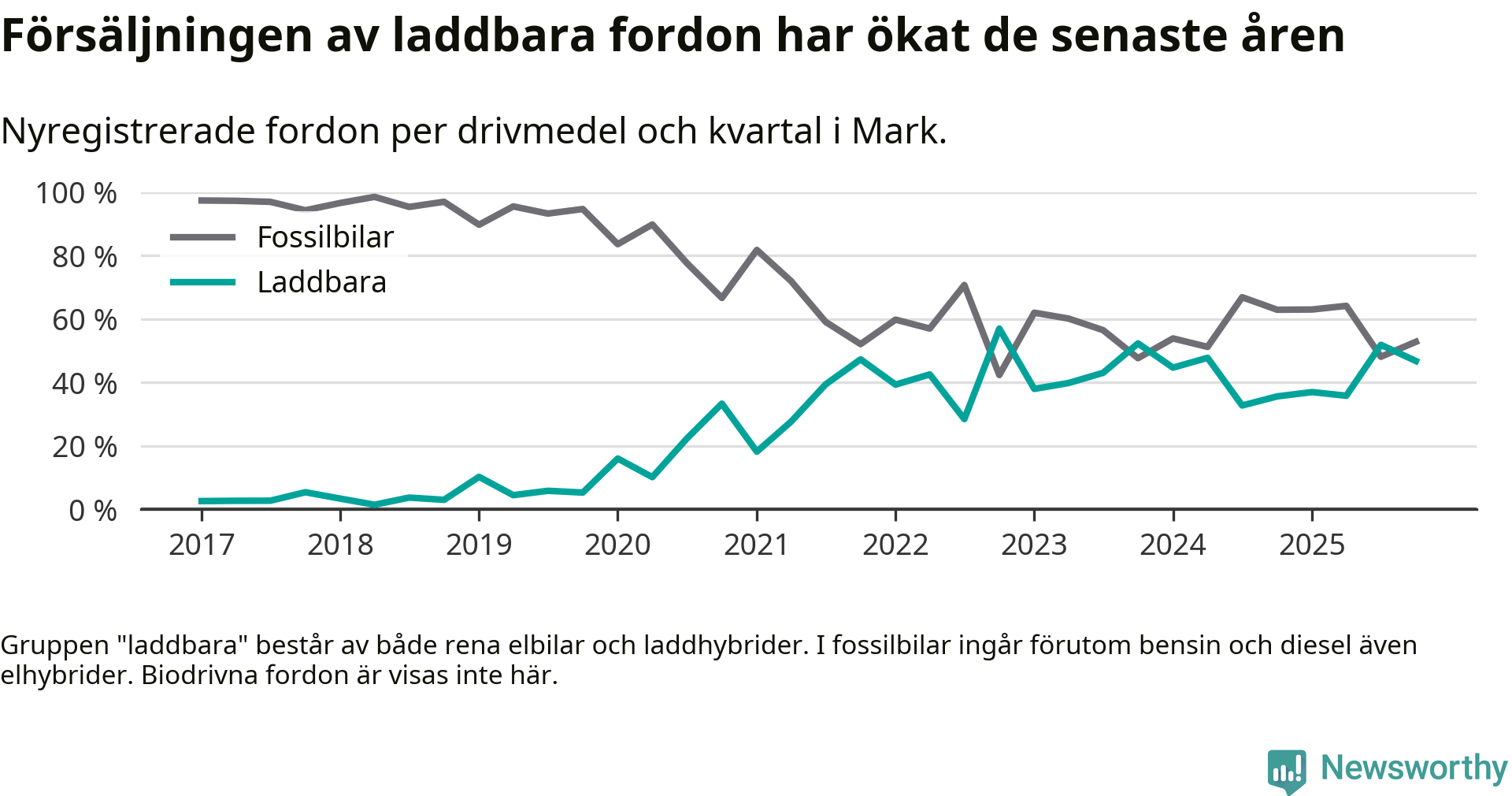 Under fjärde kvartalet 2025 var 47 procent av alla nyregistrerade personbilar i Mark laddbara (sammanlagt registrerades 265 nya bilar). Merparten av de laddbara bilarna var rena elbilar (29 procent av alla).