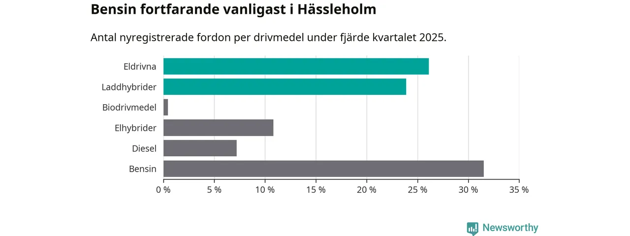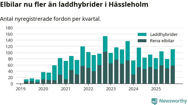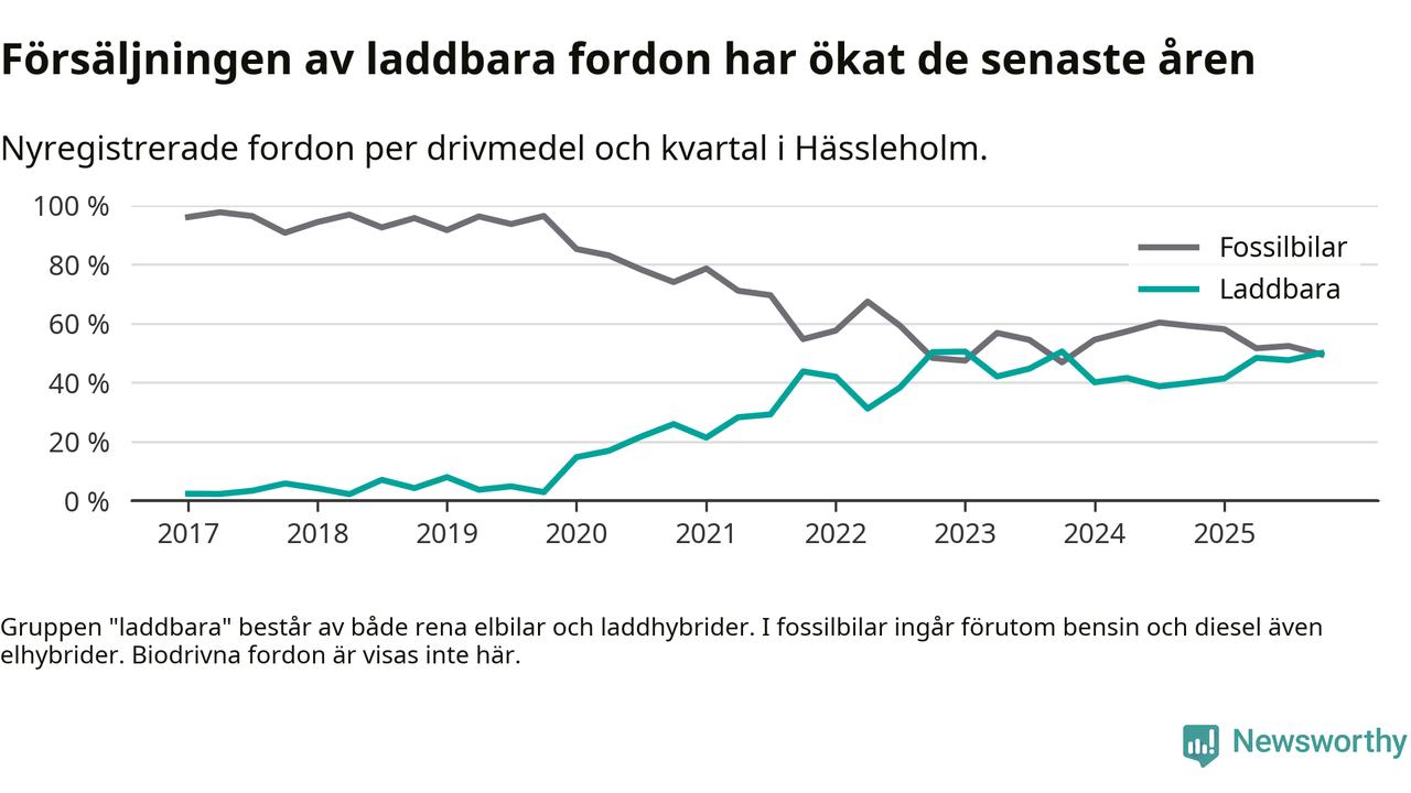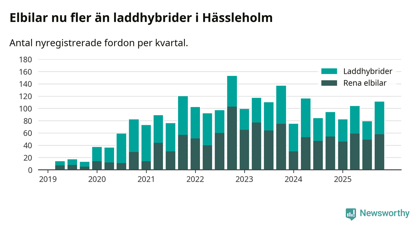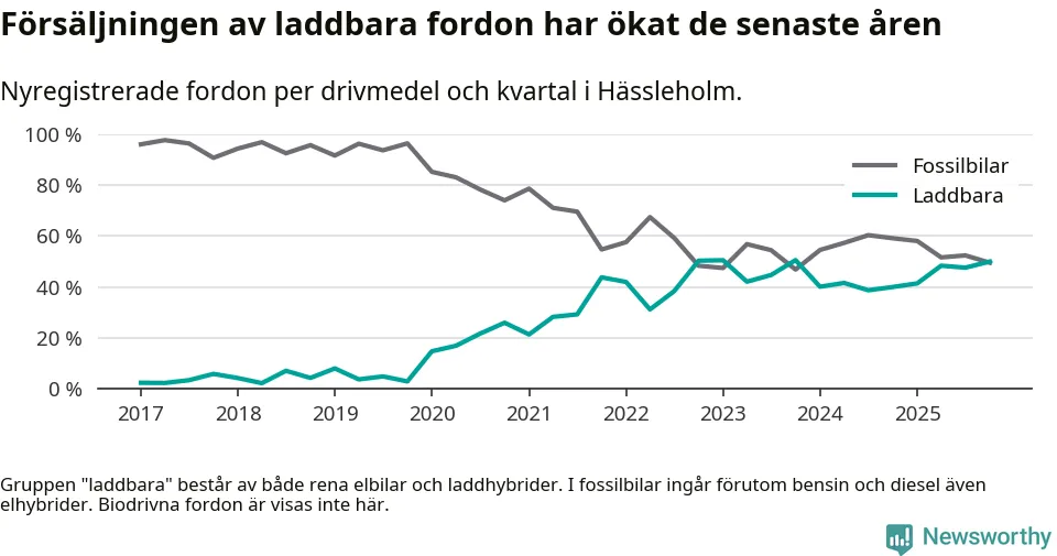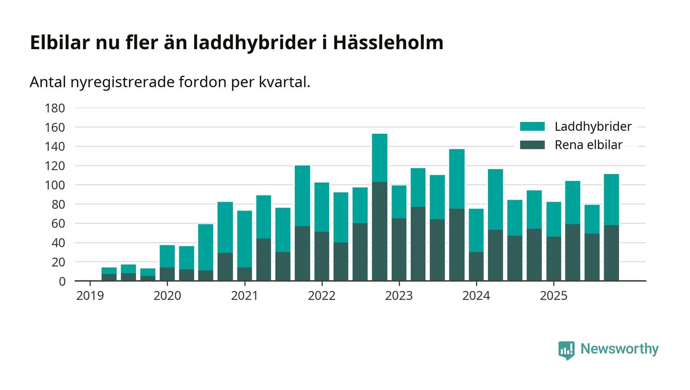Under fjärde kvartalet 2025 var 50 procent av alla nyregistrerade personbilar i Hässleholm laddbara (sammanlagt registrerades 222 nya bilar). Merparten av de laddbara bilarna var rena elbilar (26 procent av alla).