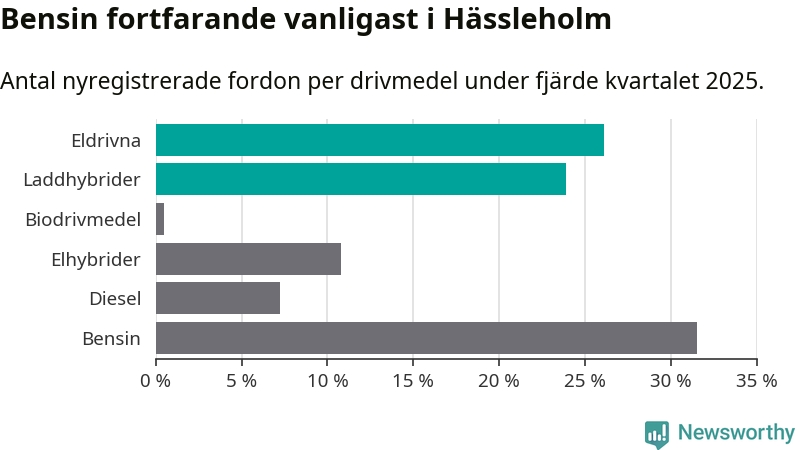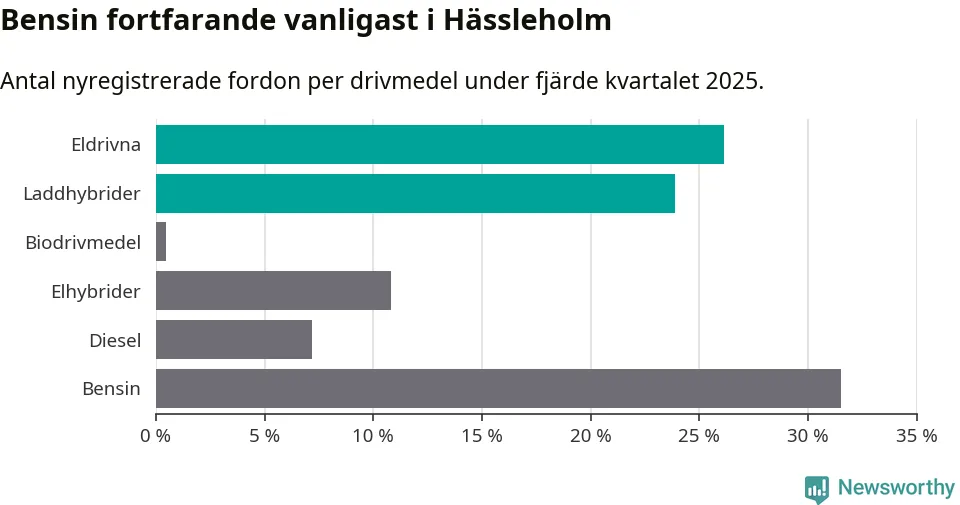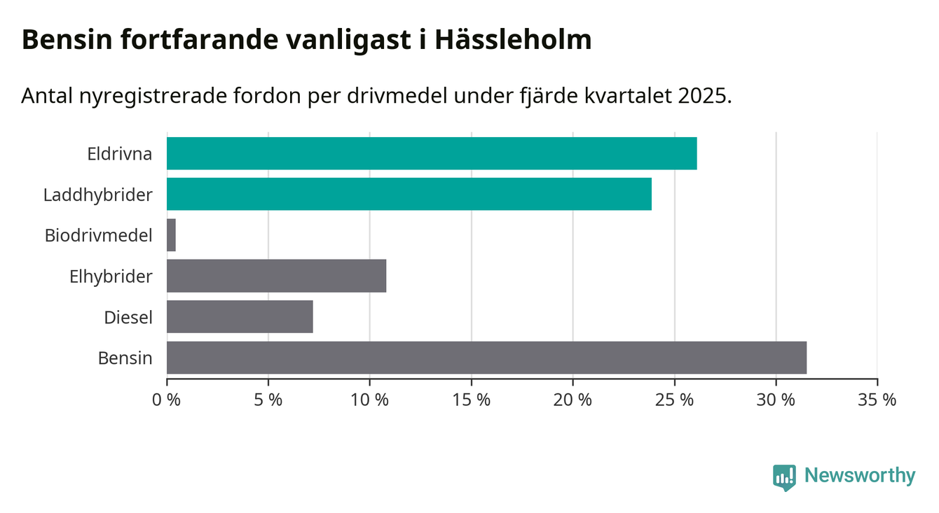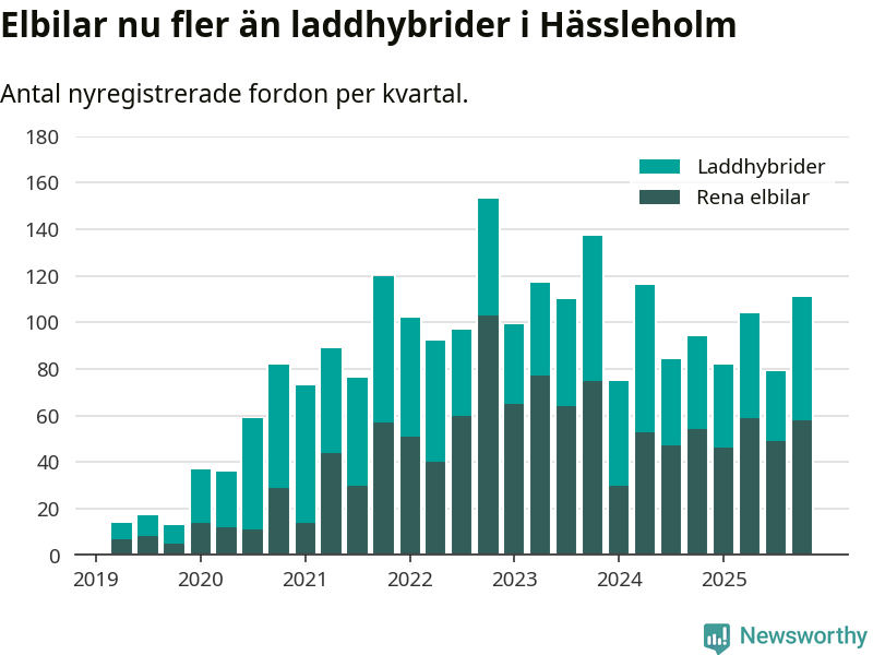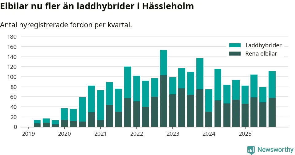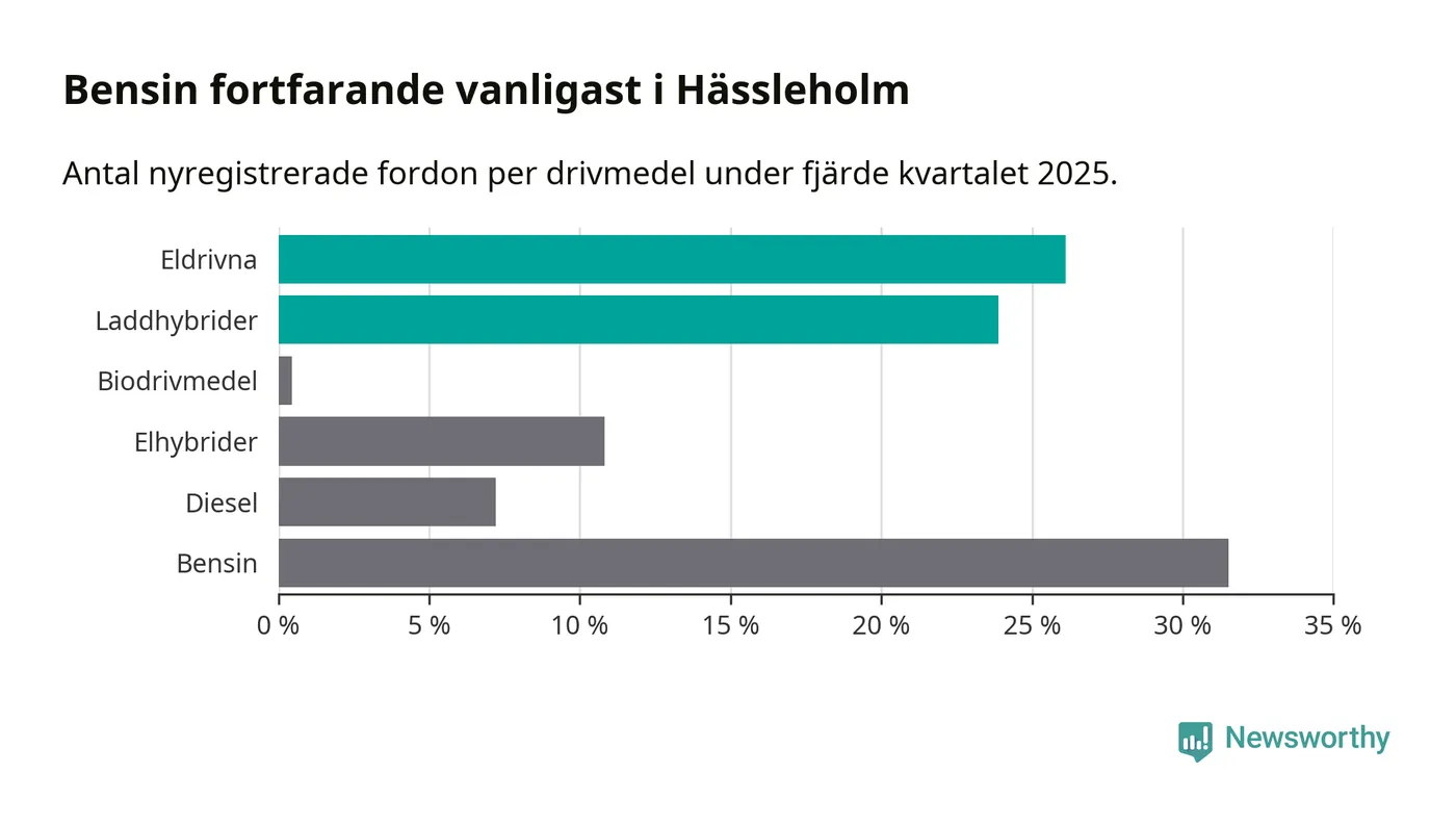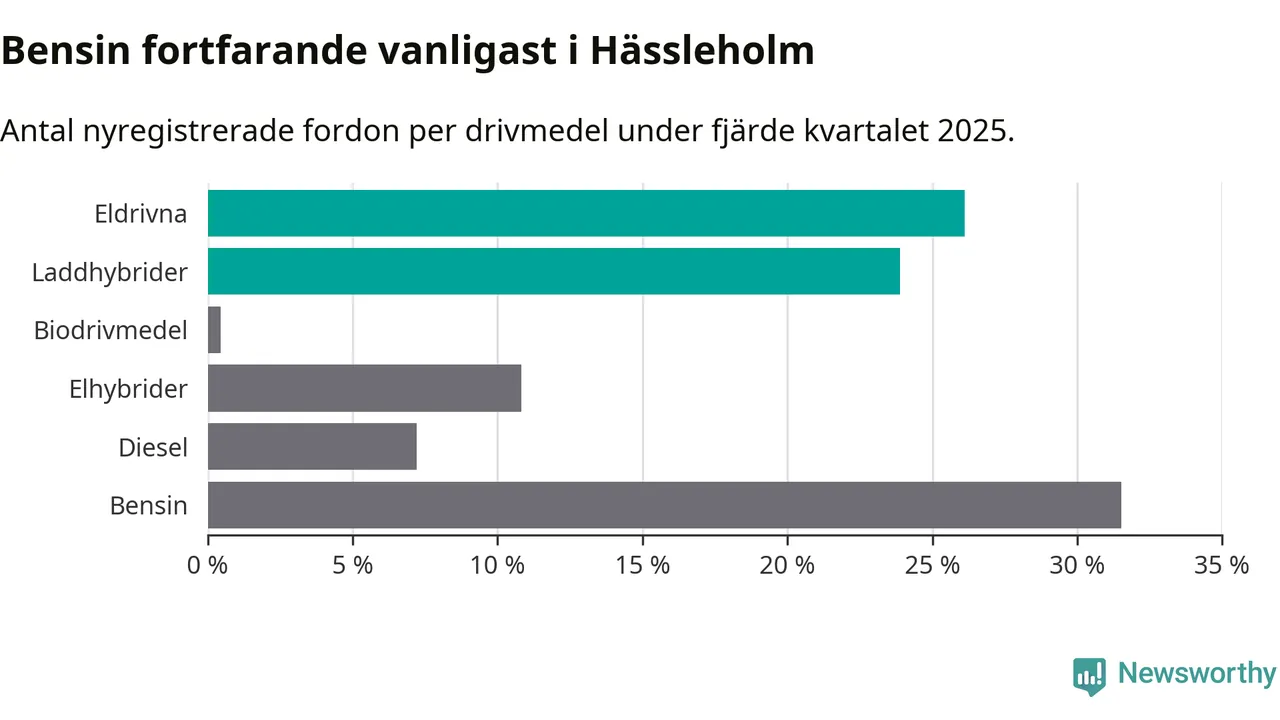 Under fjärde kvartalet 2025 var 50 procent av alla nyregistrerade personbilar i Hässleholm laddbara (sammanlagt registrerades 222 nya bilar). Merparten av de laddbara bilarna var rena elbilar (26 procent av alla).