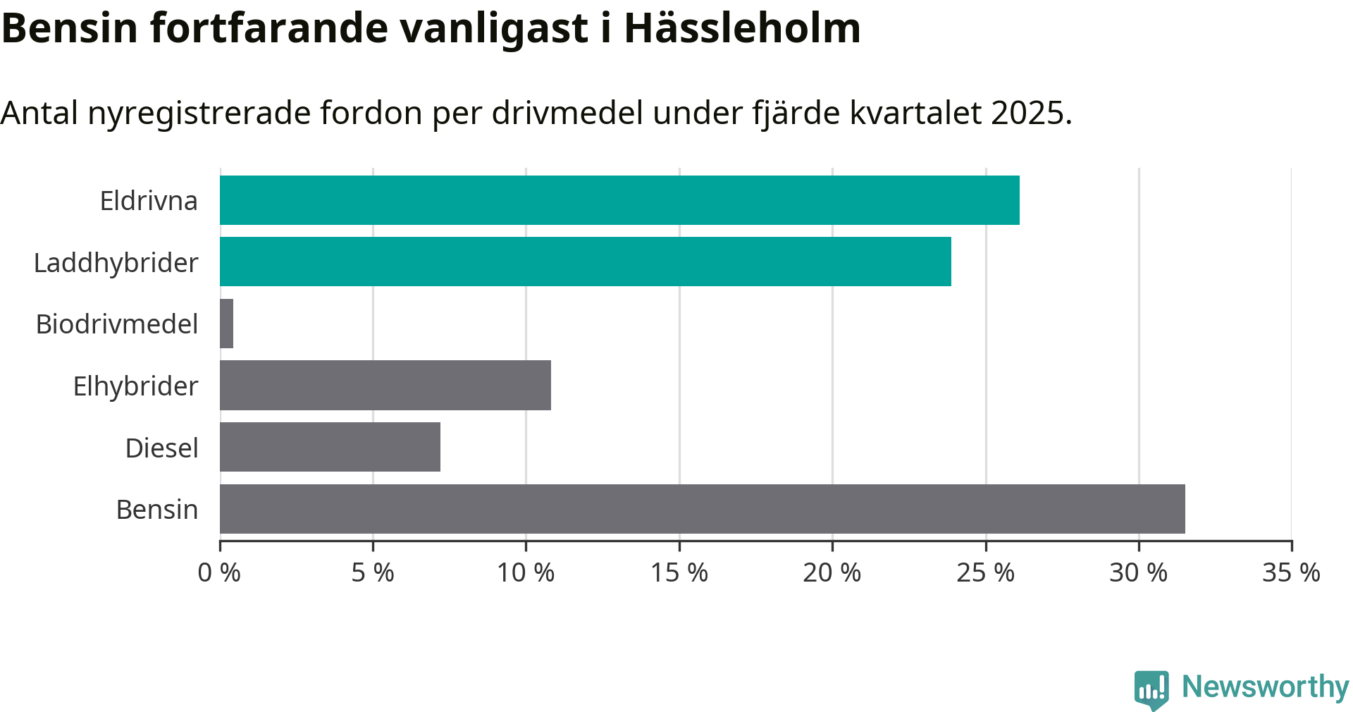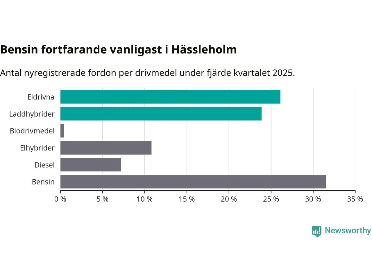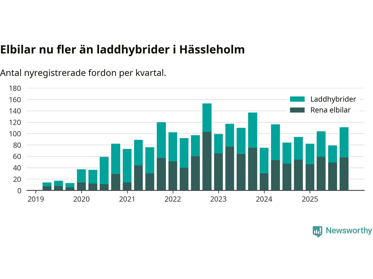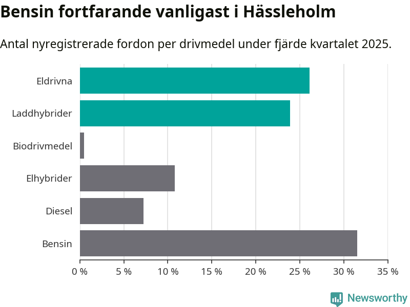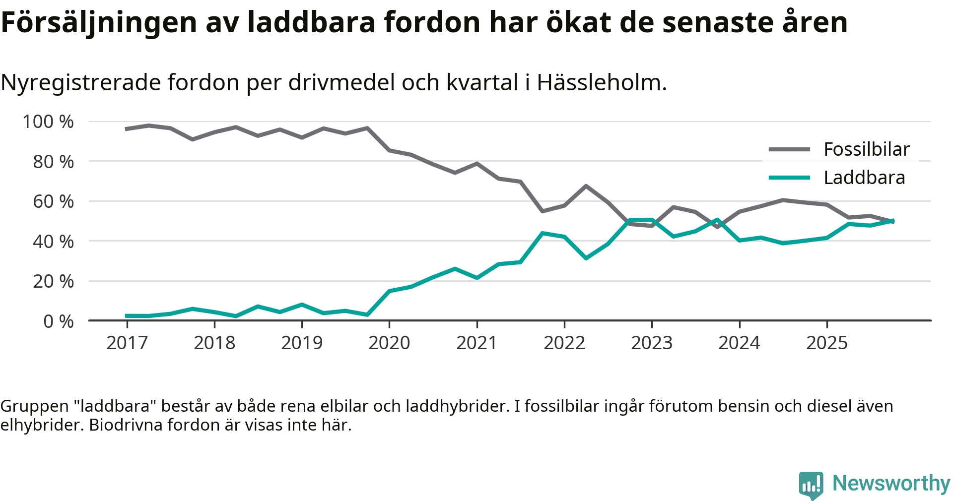 Under fjärde kvartalet 2025 var 50 procent av alla nyregistrerade personbilar i Hässleholm laddbara (sammanlagt registrerades 222 nya bilar). Merparten av de laddbara bilarna var rena elbilar (26 procent av alla).