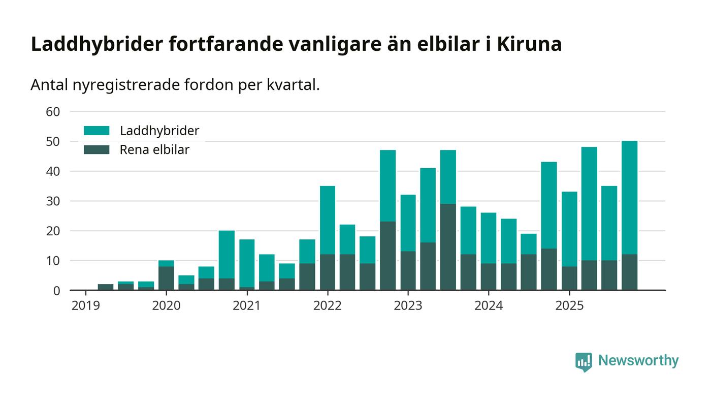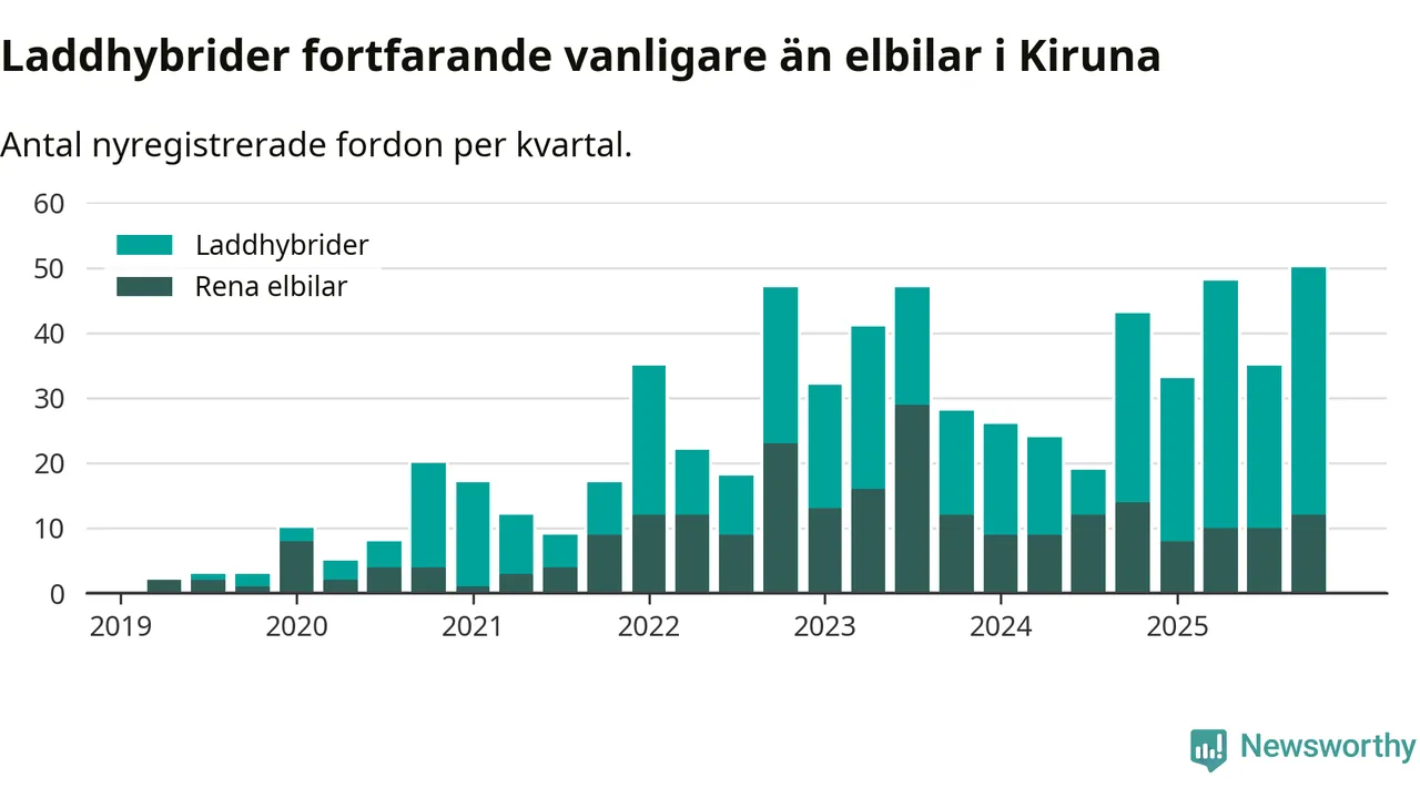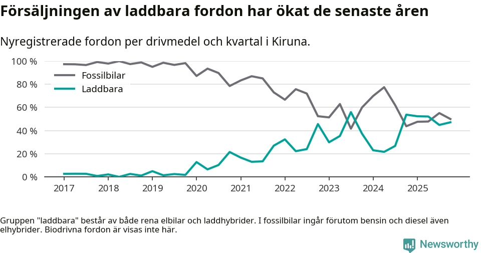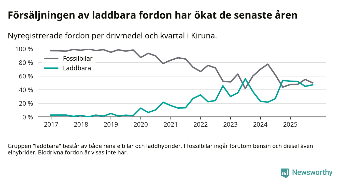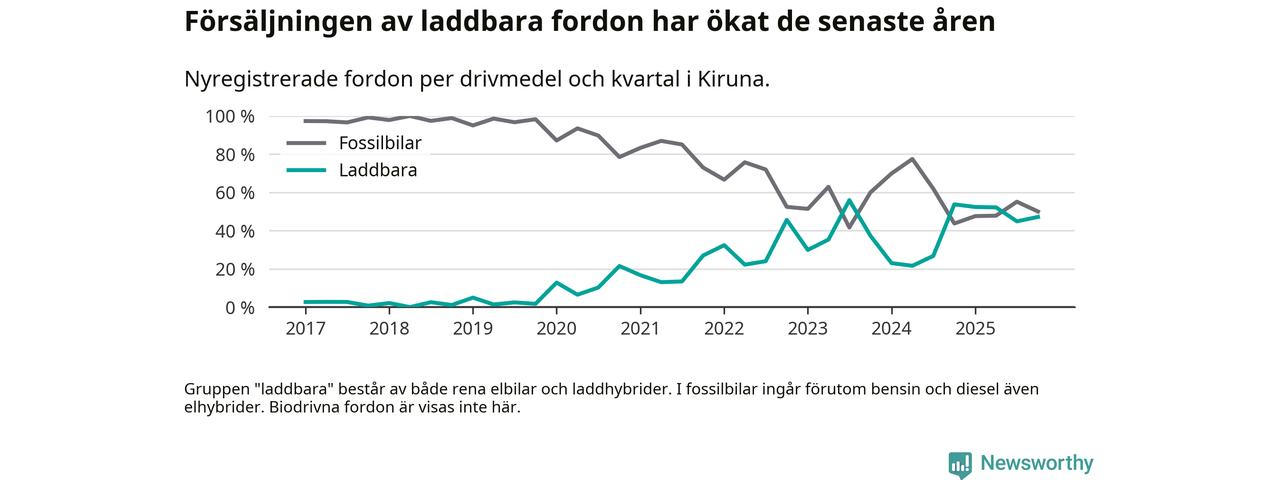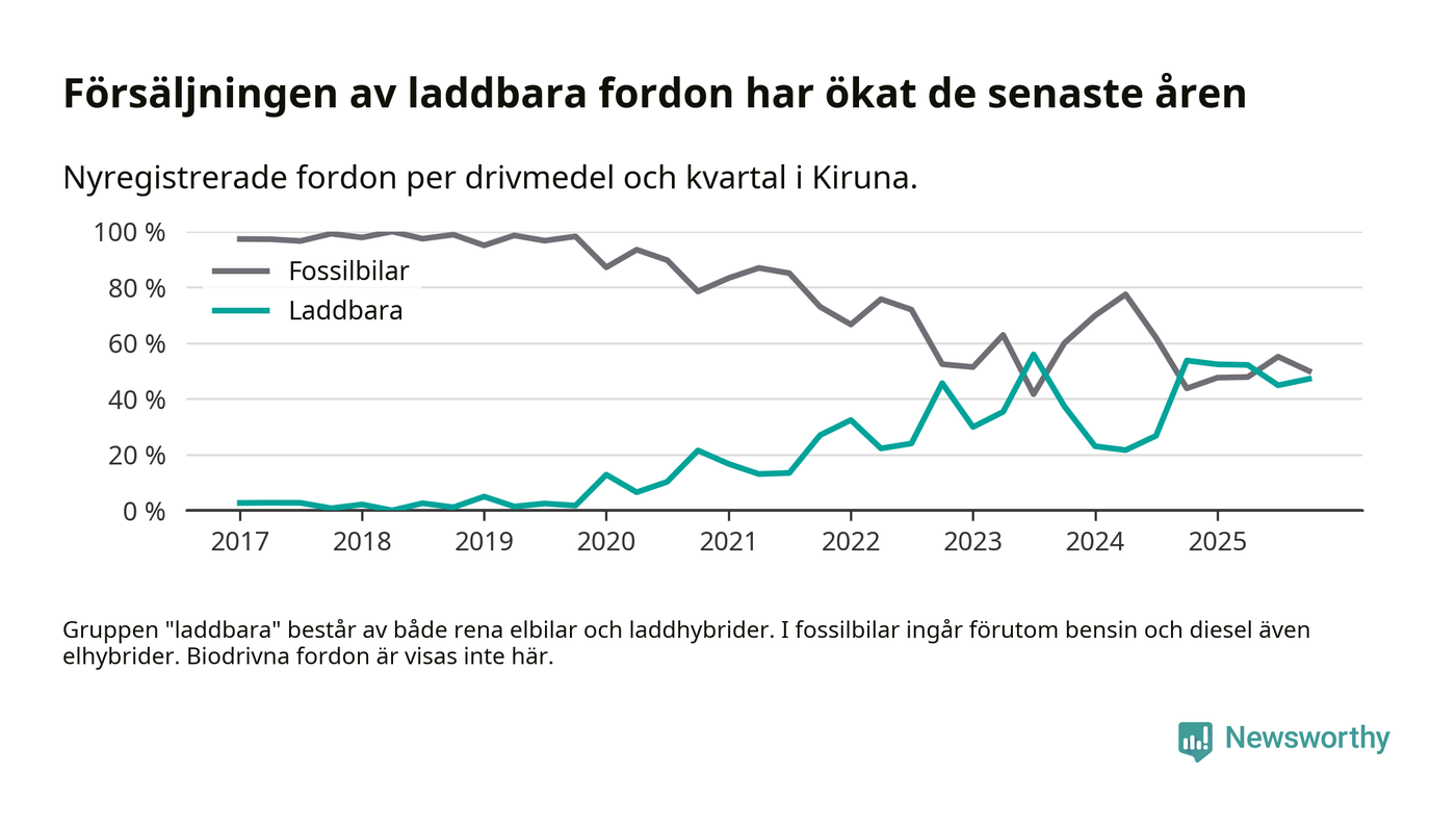 Under fjärde kvartalet 2025 var 47 procent av alla nyregistrerade personbilar i Kiruna laddbara (sammanlagt registrerades 106 nya bilar). Merparten av de laddbara bilarna var så kallade laddhybrider, det vill säga fordon som går att ladda och köra på el, men som även har en förbränningsmotor. 11 procent av alla nya bilar var rena elbilar.