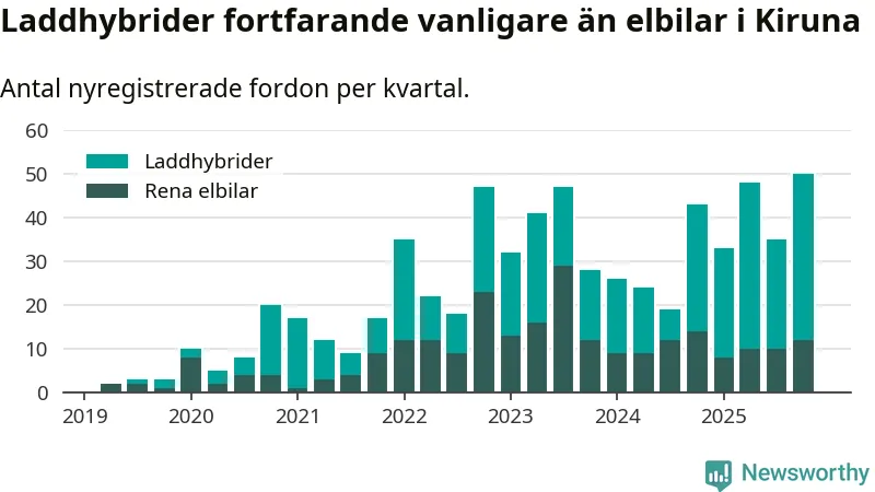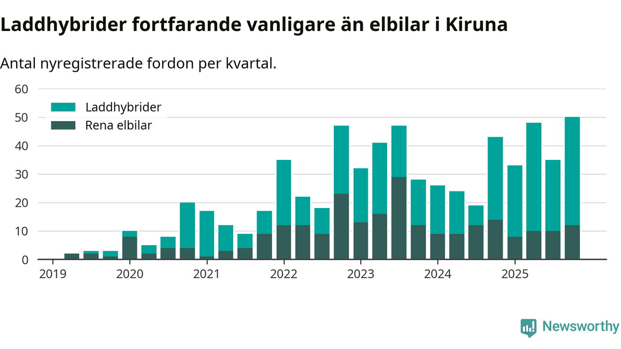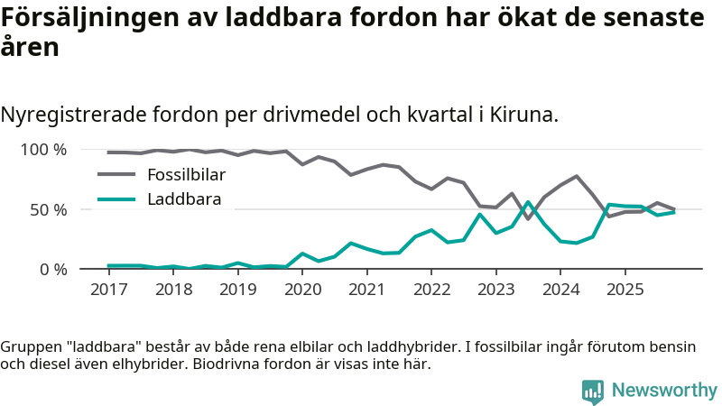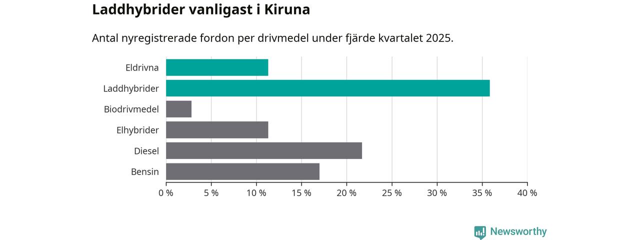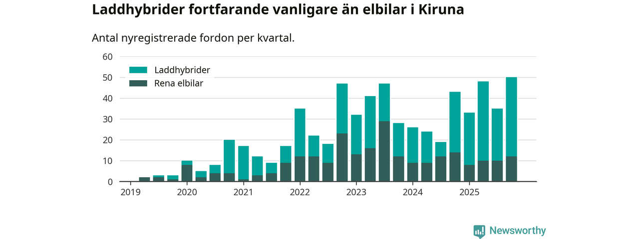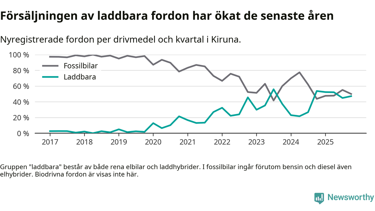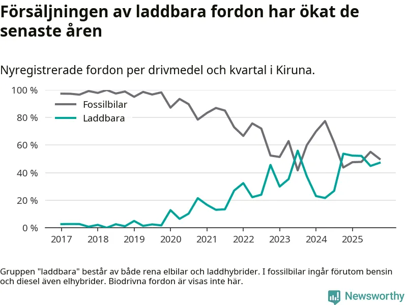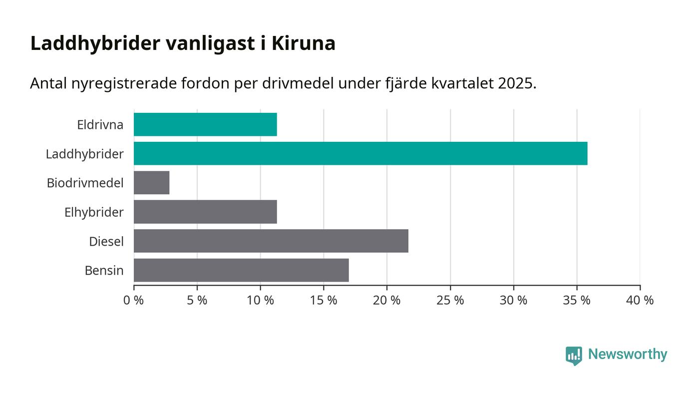 Under fjärde kvartalet 2025 var 47 procent av alla nyregistrerade personbilar i Kiruna laddbara (sammanlagt registrerades 106 nya bilar). Merparten av de laddbara bilarna var så kallade laddhybrider, det vill säga fordon som går att ladda och köra på el, men som även har en förbränningsmotor. 11 procent av alla nya bilar var rena elbilar.