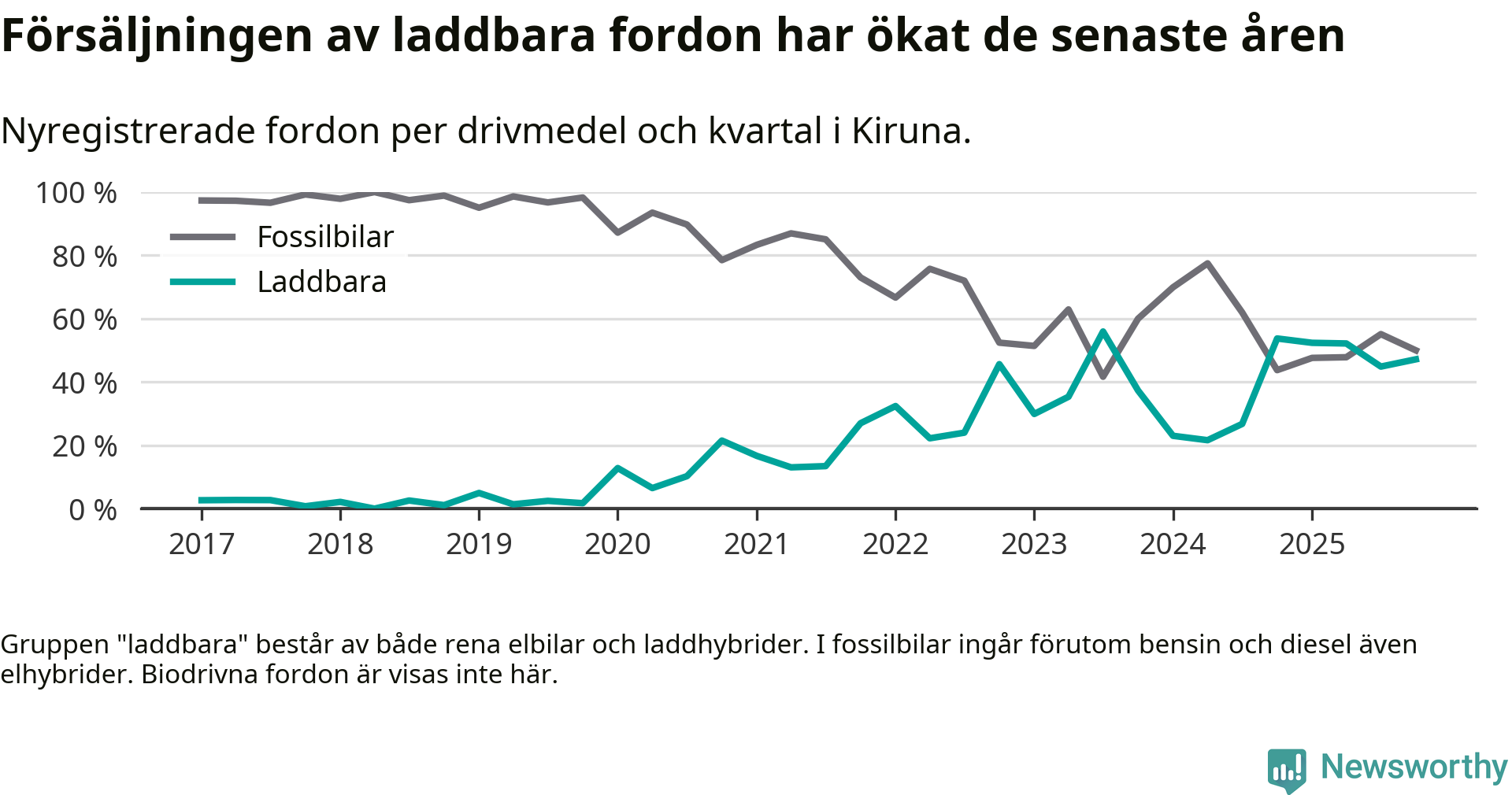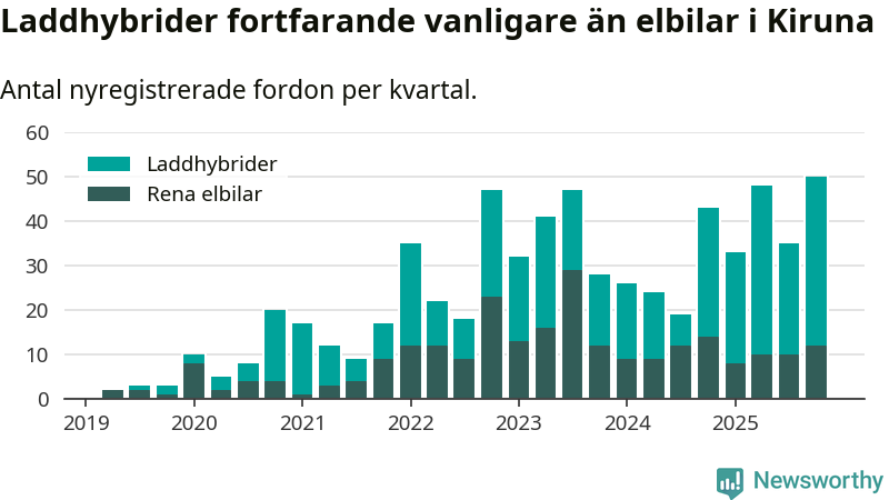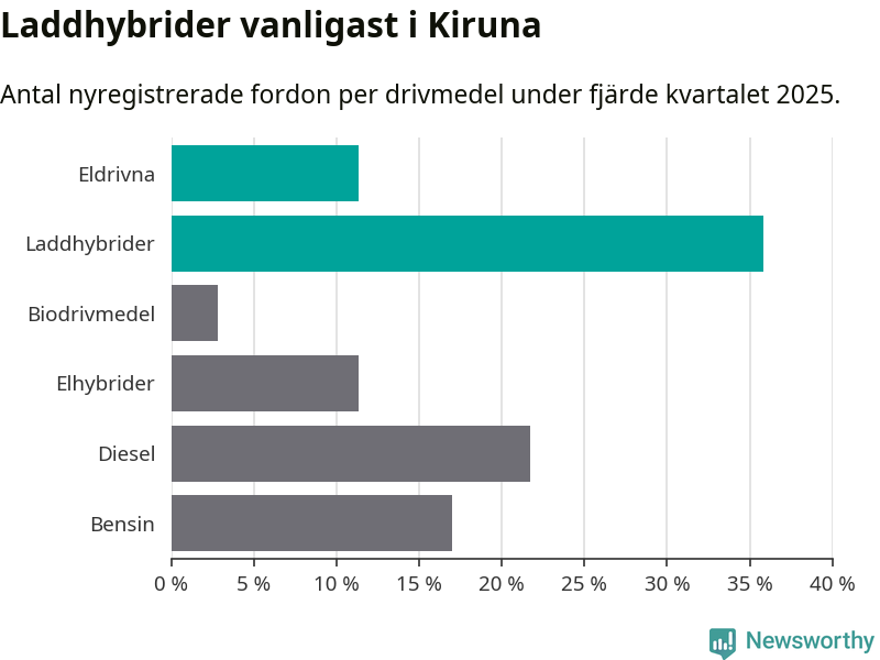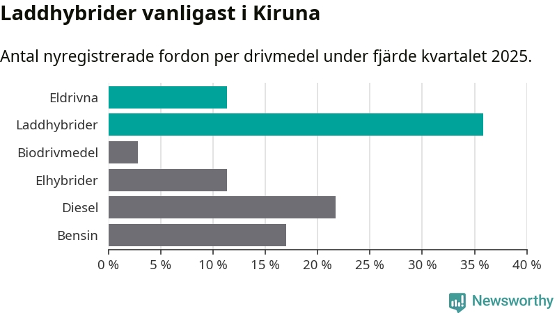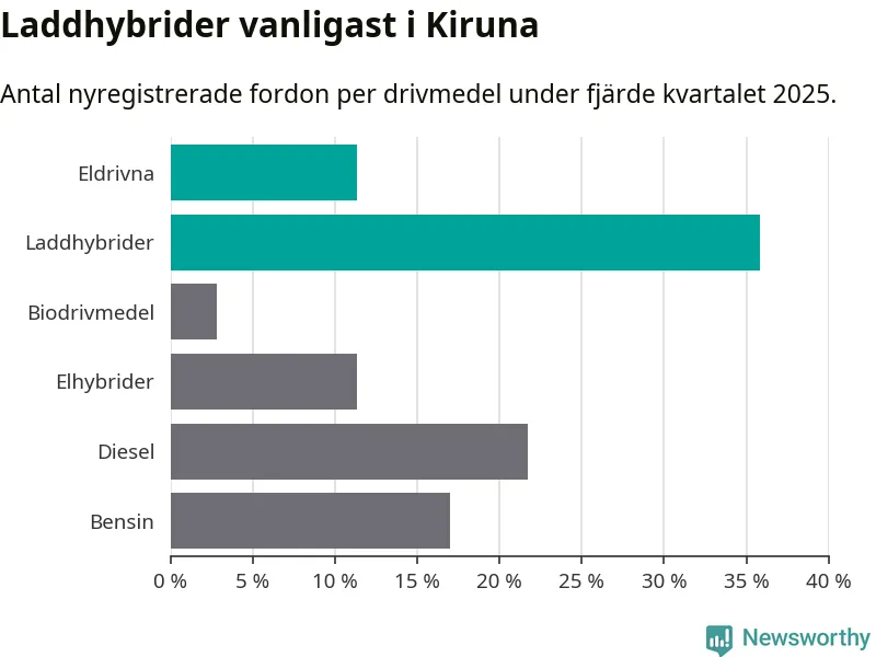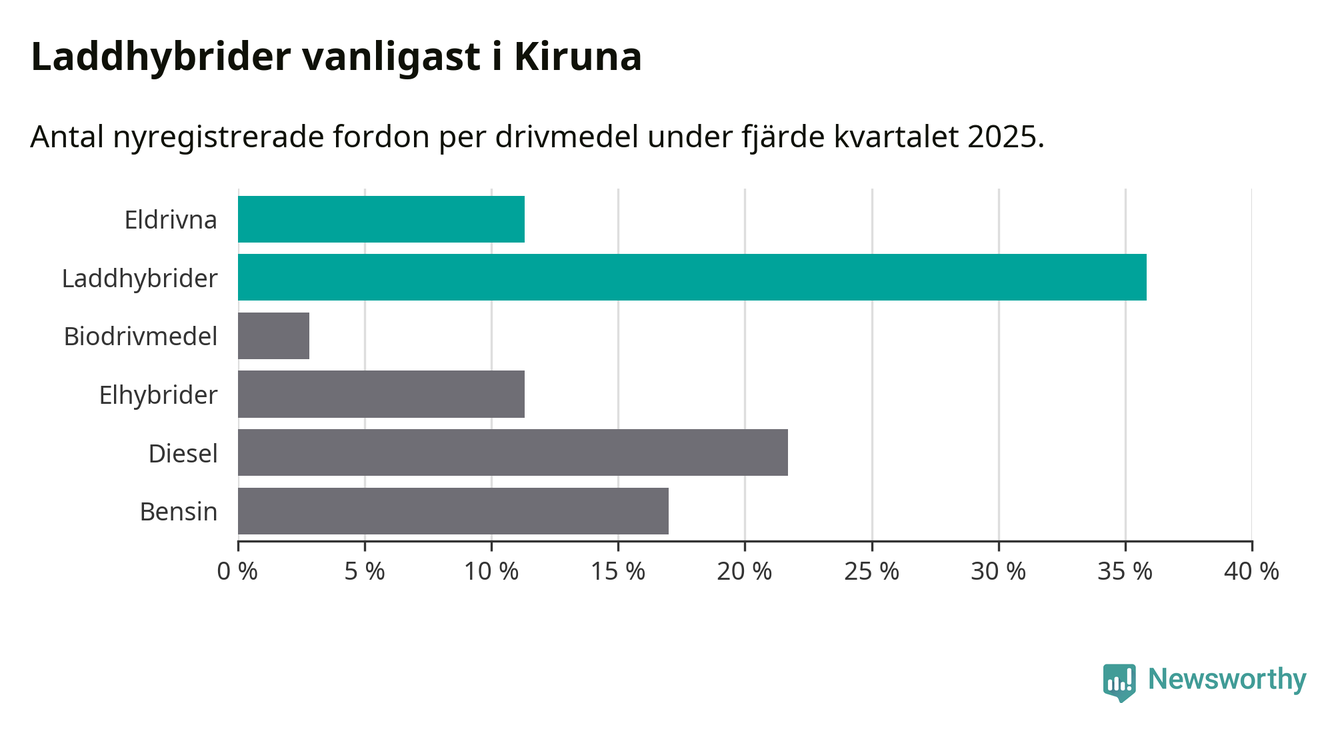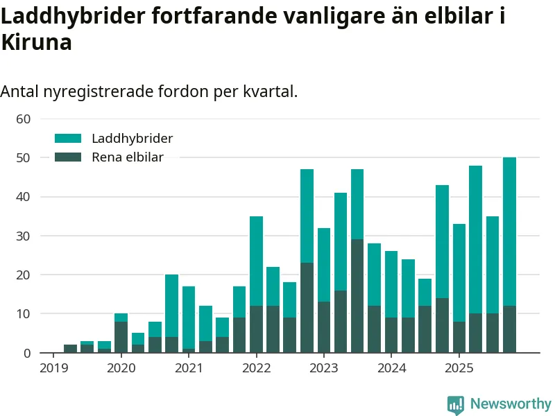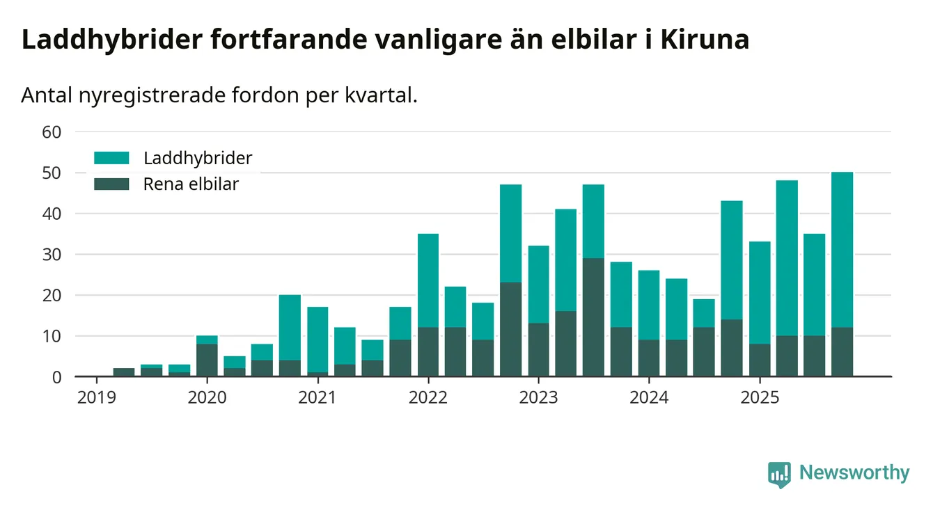 Under fjärde kvartalet 2025 var 47 procent av alla nyregistrerade personbilar i Kiruna laddbara (sammanlagt registrerades 106 nya bilar). Merparten av de laddbara bilarna var så kallade laddhybrider, det vill säga fordon som går att ladda och köra på el, men som även har en förbränningsmotor. 11 procent av alla nya bilar var rena elbilar.