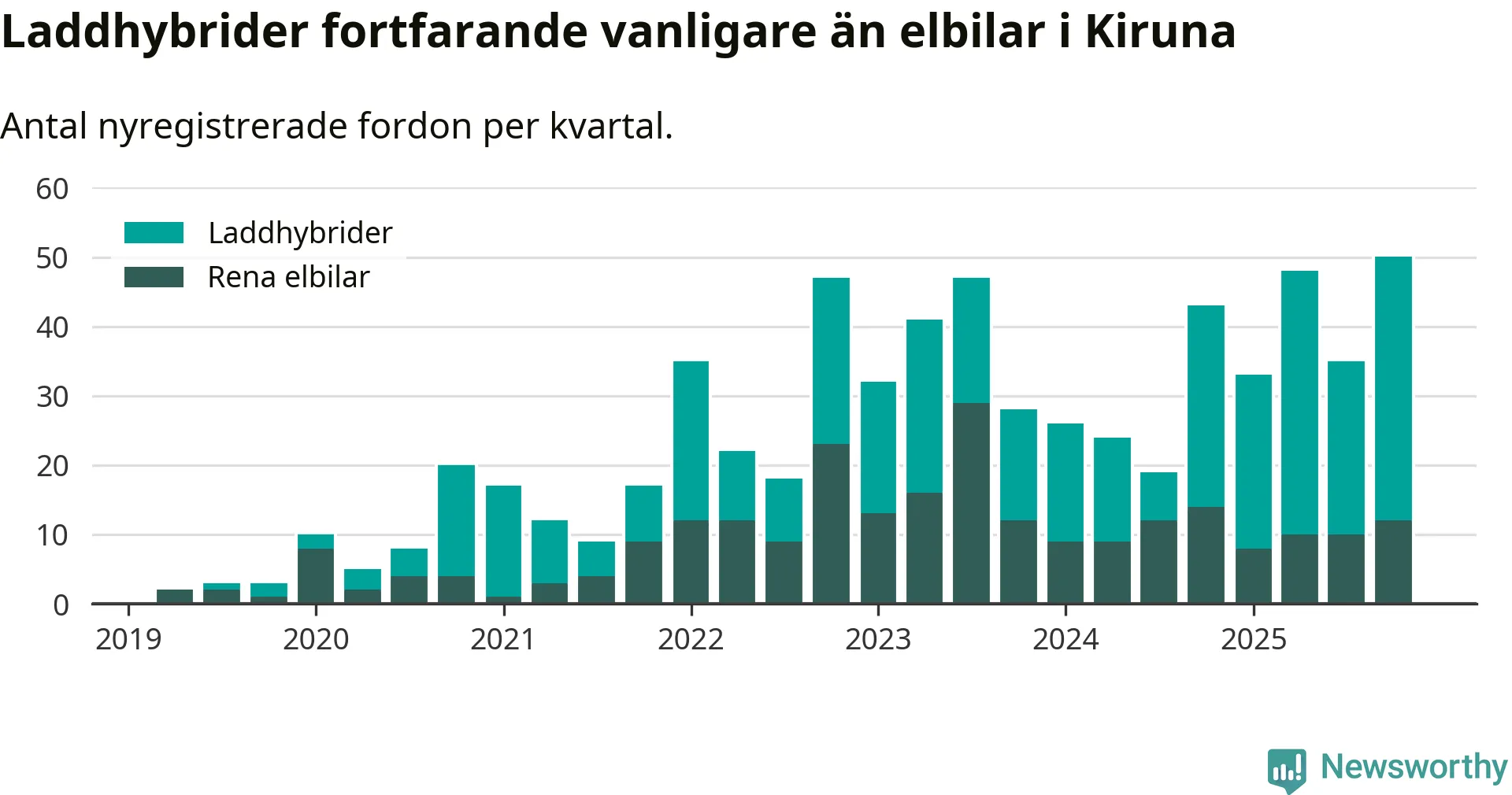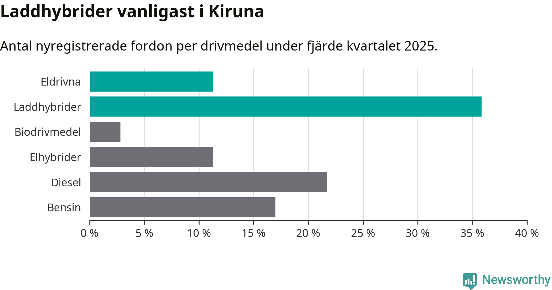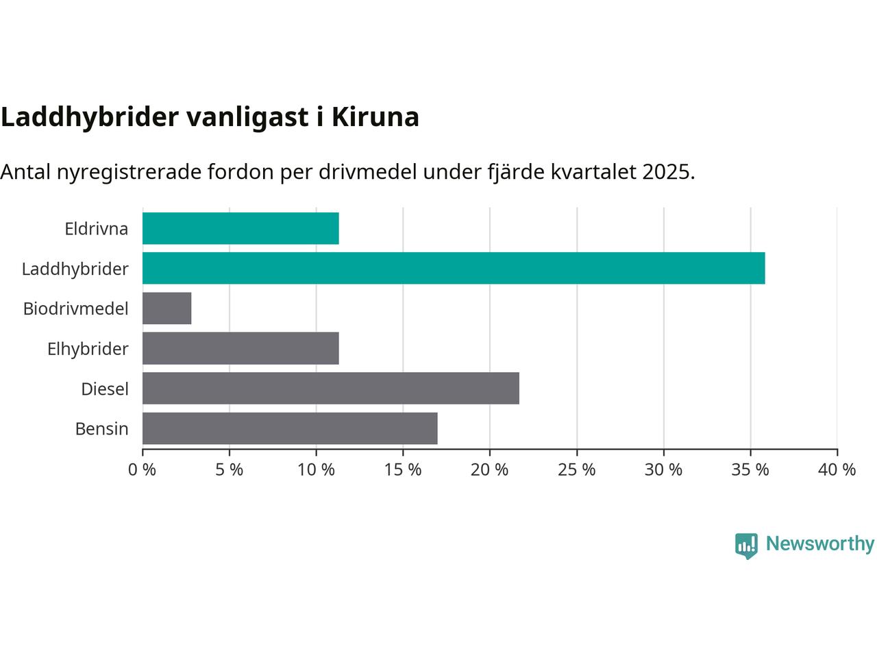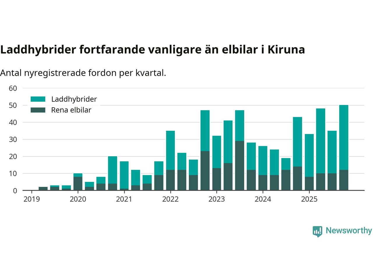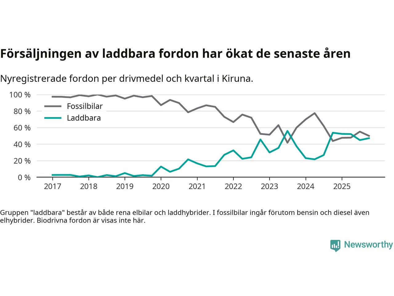 Under fjärde kvartalet 2025 var 47 procent av alla nyregistrerade personbilar i Kiruna laddbara (sammanlagt registrerades 106 nya bilar). Merparten av de laddbara bilarna var så kallade laddhybrider, det vill säga fordon som går att ladda och köra på el, men som även har en förbränningsmotor. 11 procent av alla nya bilar var rena elbilar.
