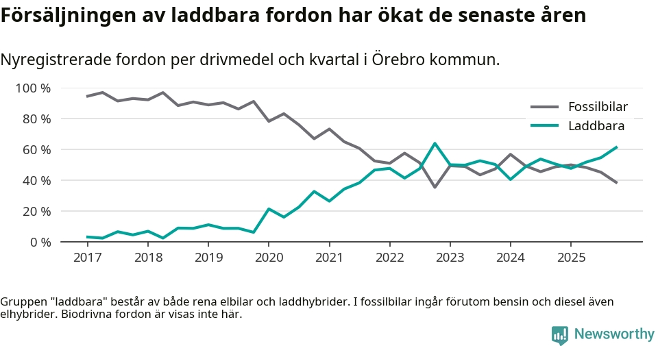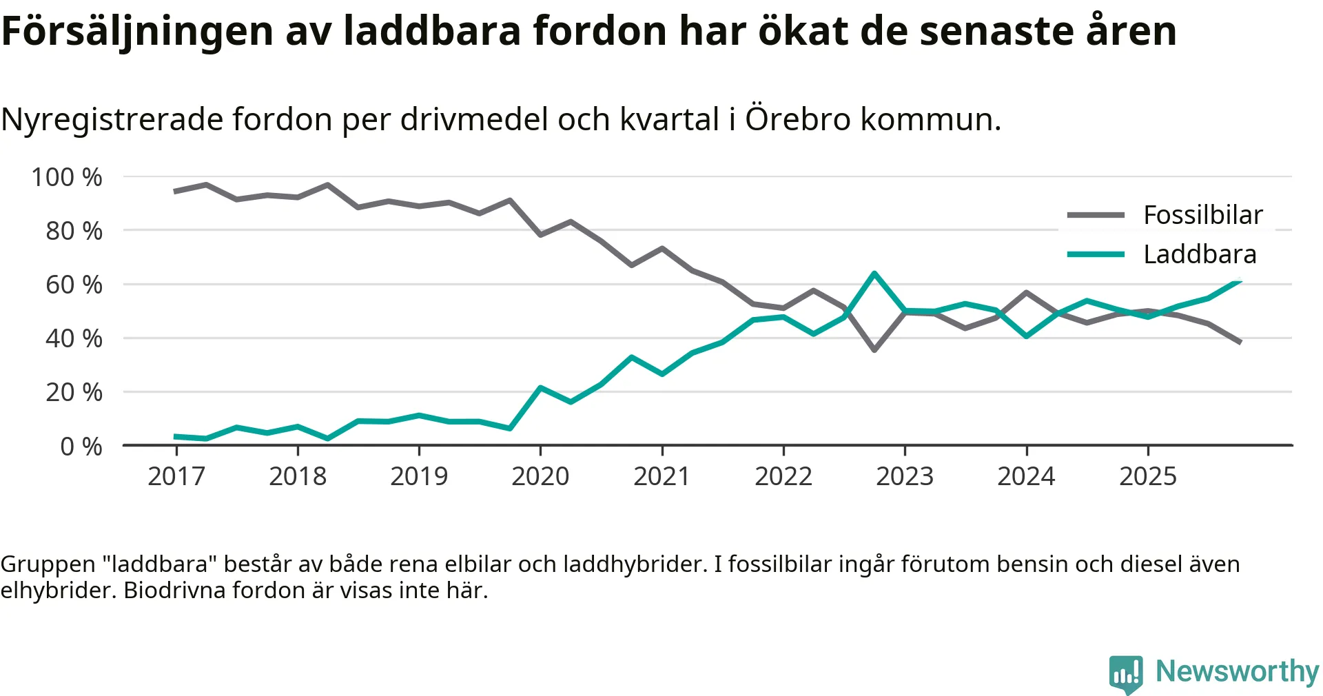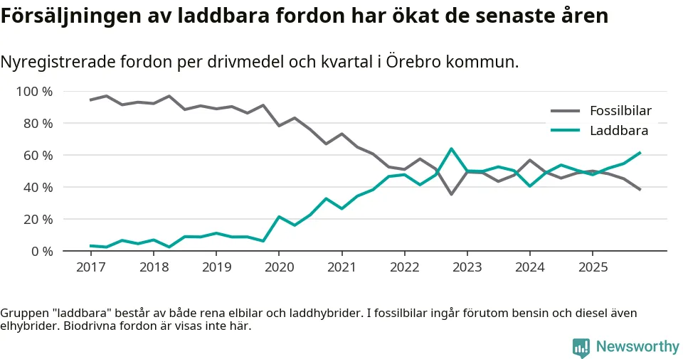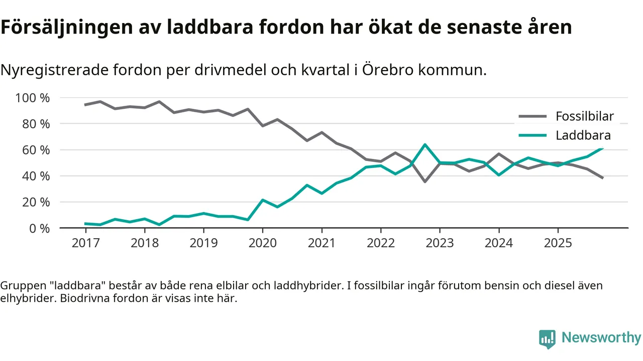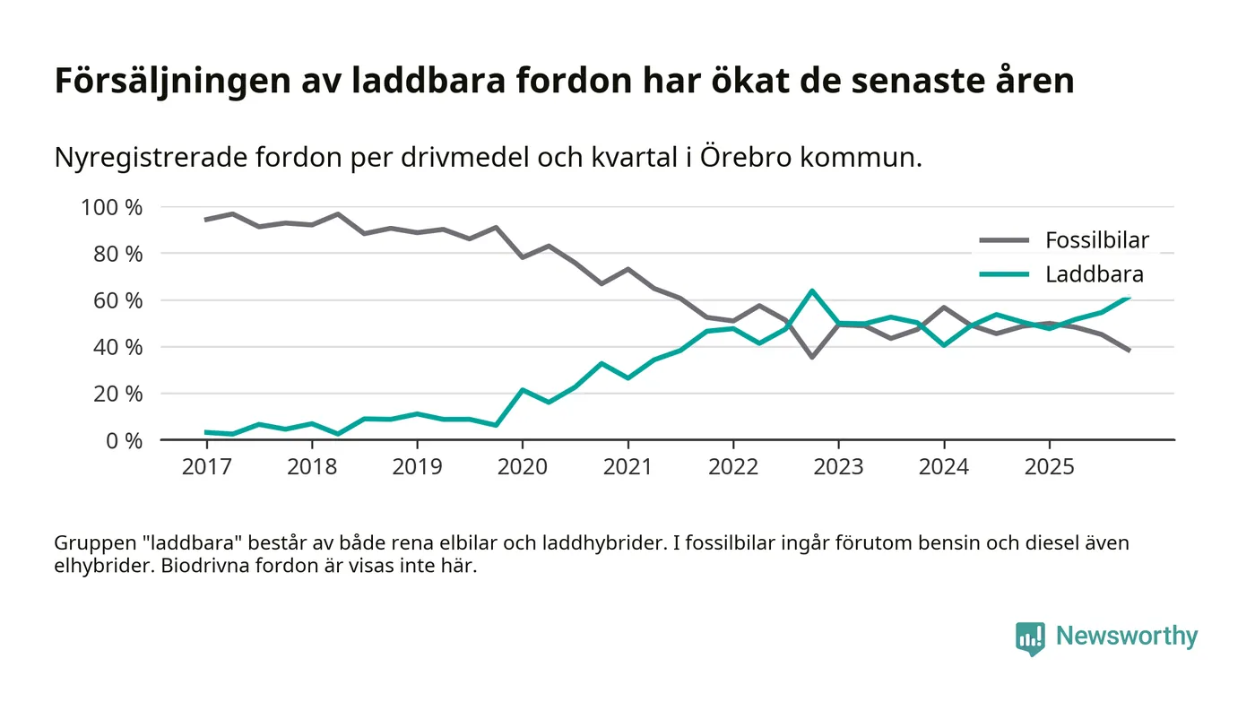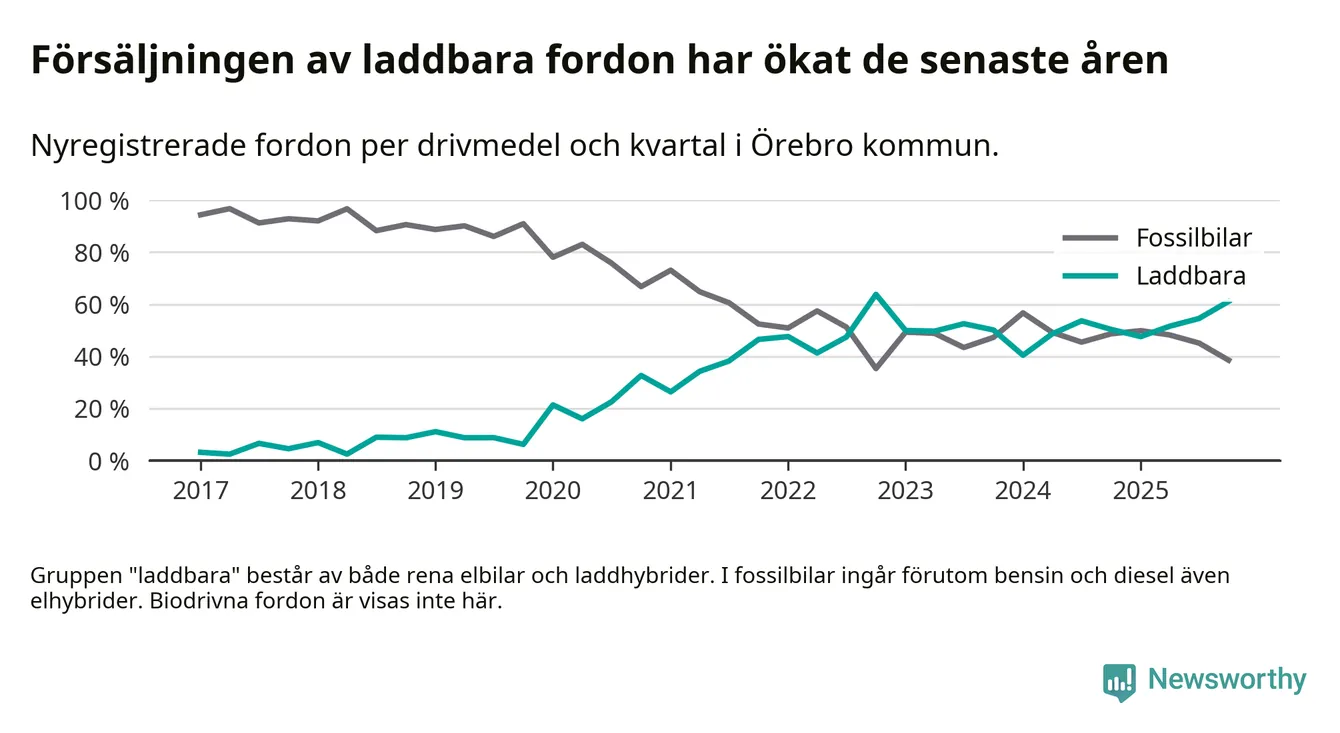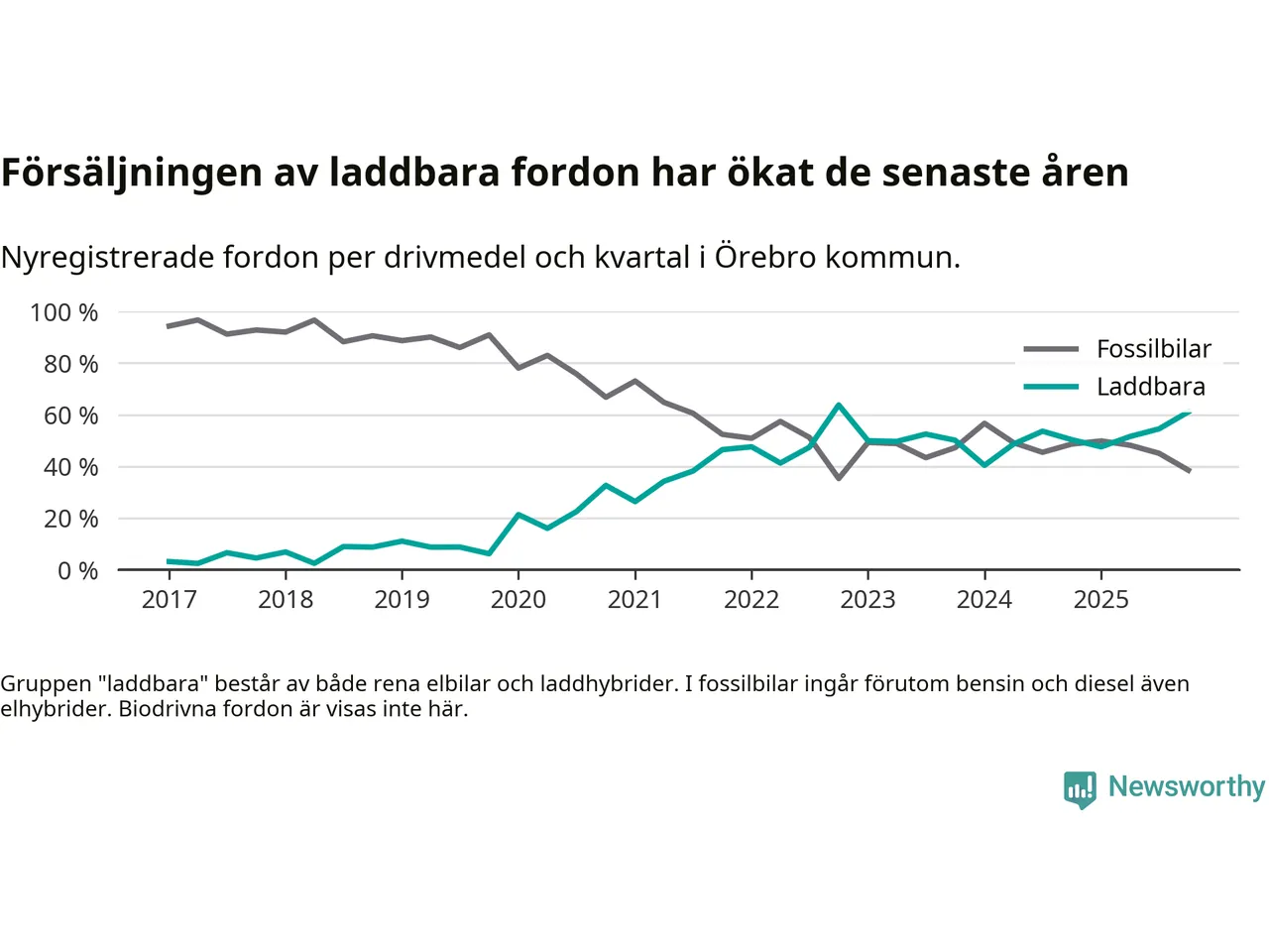Under fjärde kvartalet 2025 var 61 procent av alla nyregistrerade personbilar i Örebro kommun laddbara (sammanlagt registrerades 900 nya bilar). Merparten av de laddbara bilarna var rena elbilar (34 procent av alla).