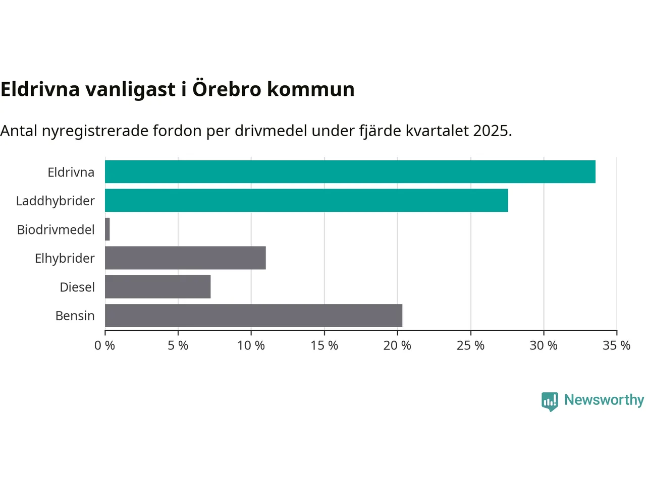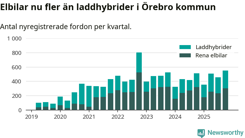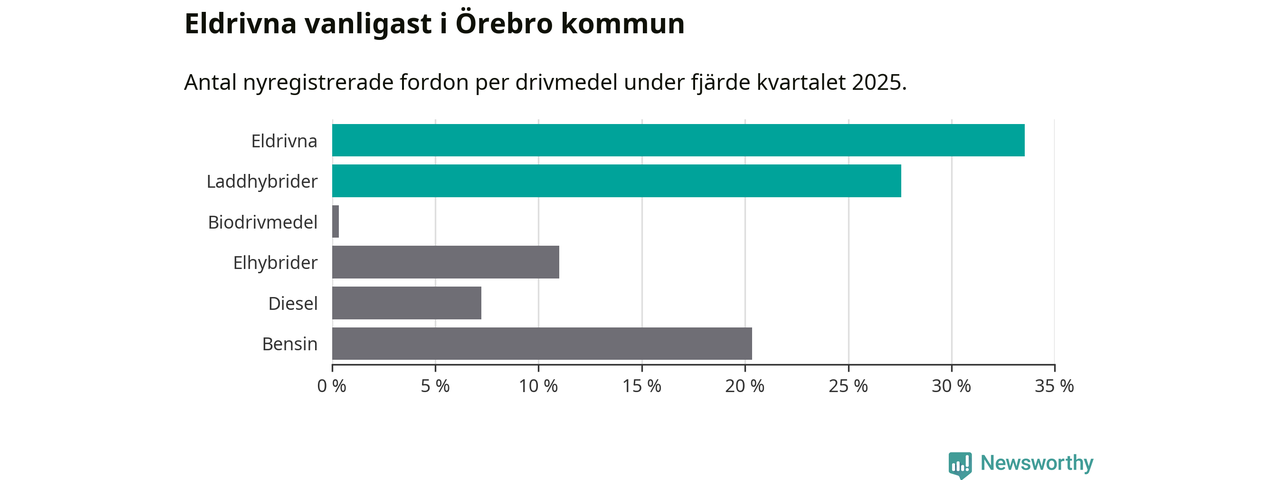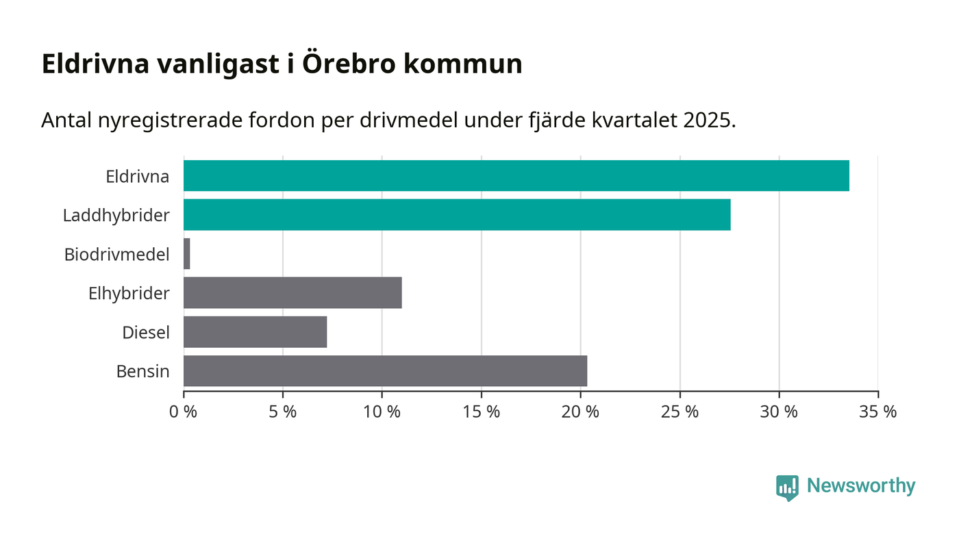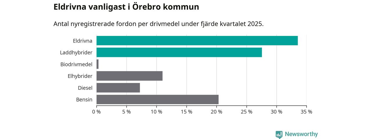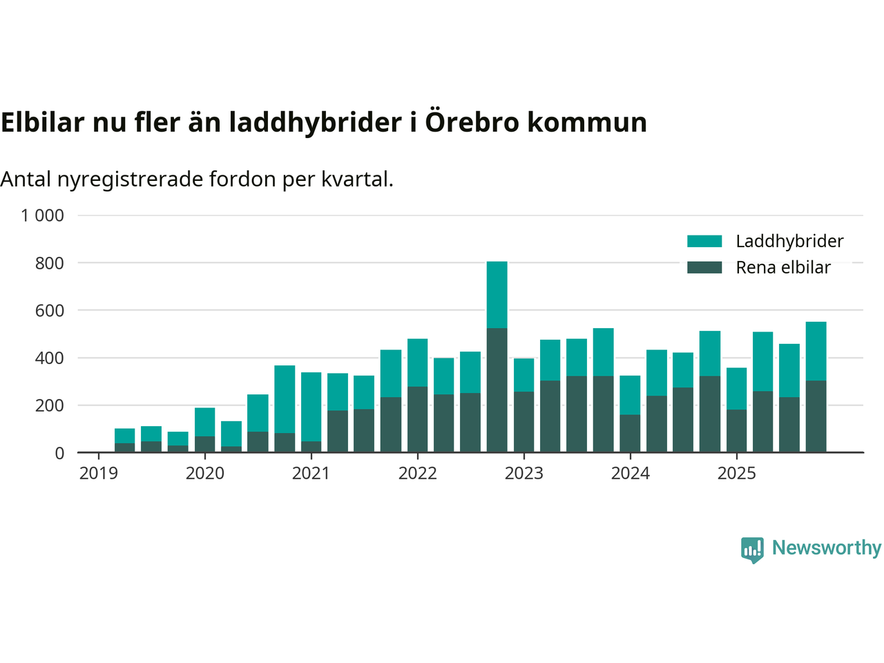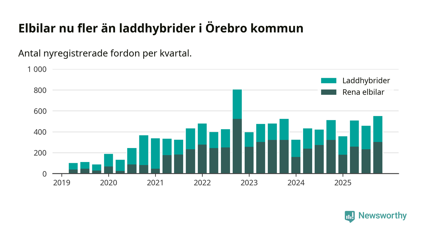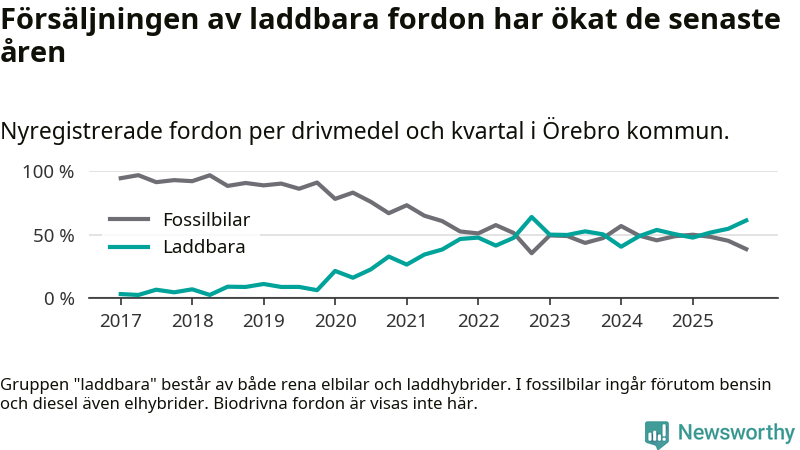 Under fjärde kvartalet 2025 var 61 procent av alla nyregistrerade personbilar i Örebro kommun laddbara (sammanlagt registrerades 900 nya bilar). Merparten av de laddbara bilarna var rena elbilar (34 procent av alla).