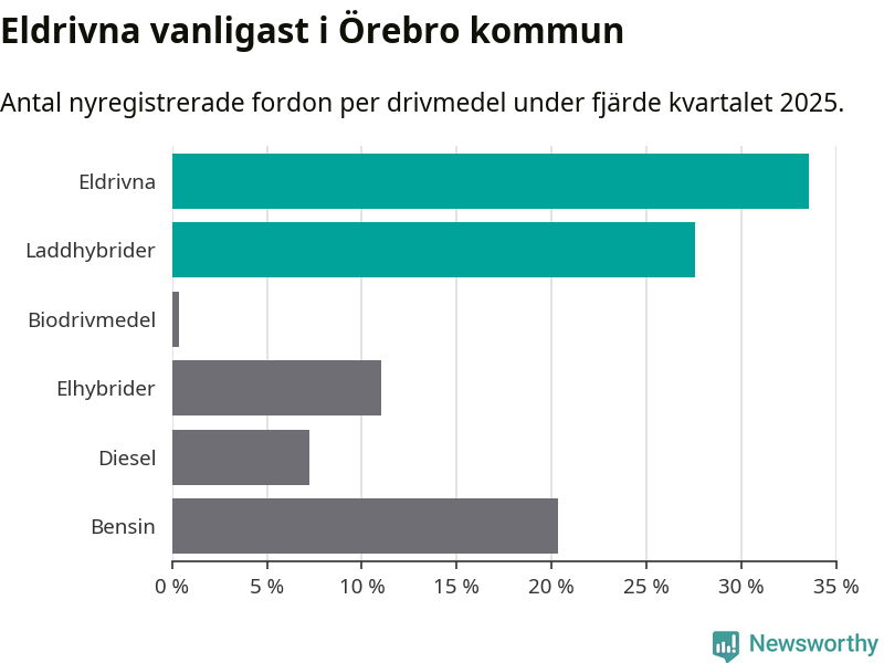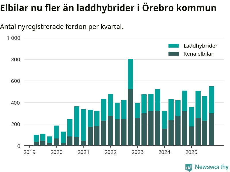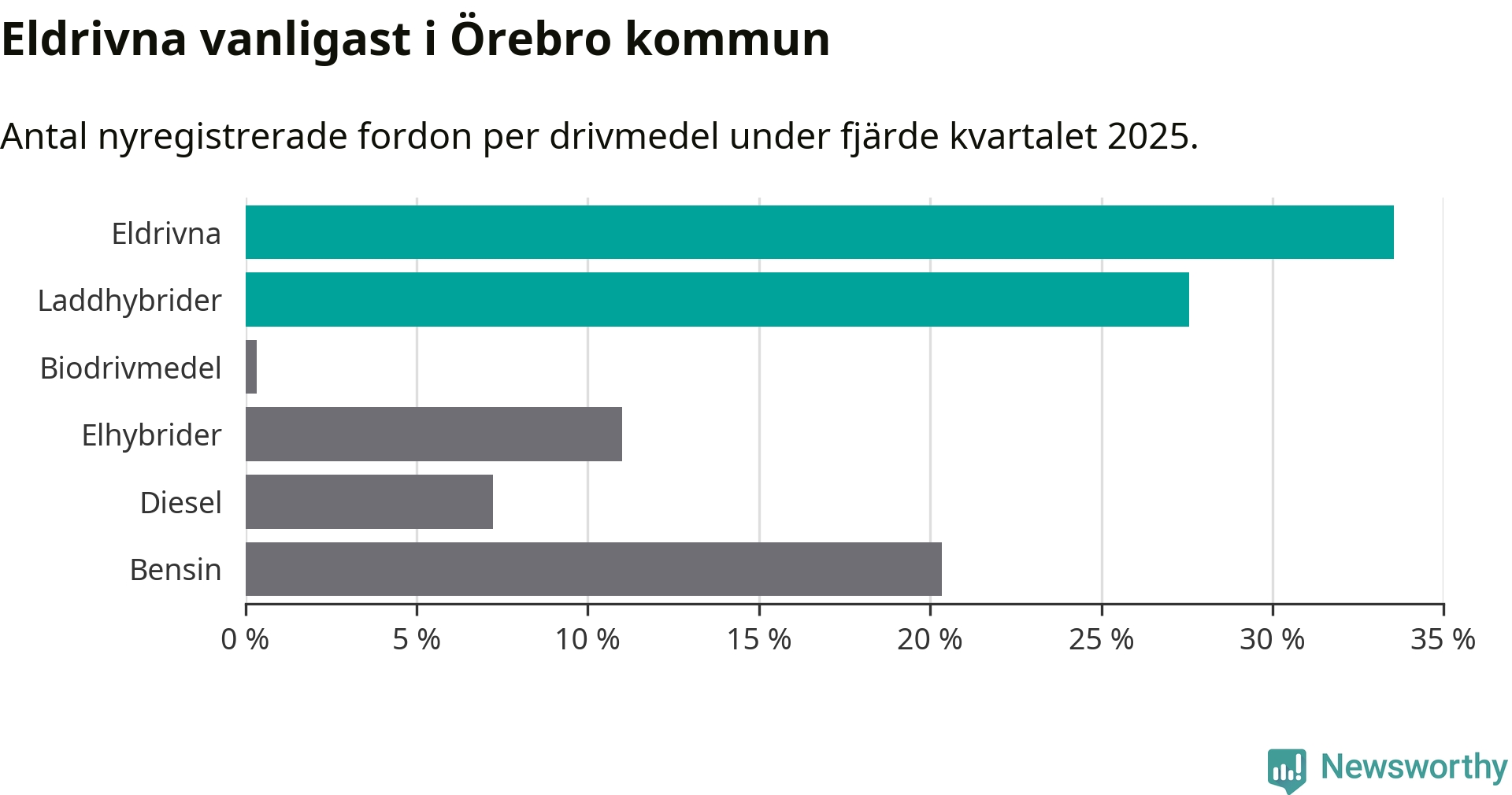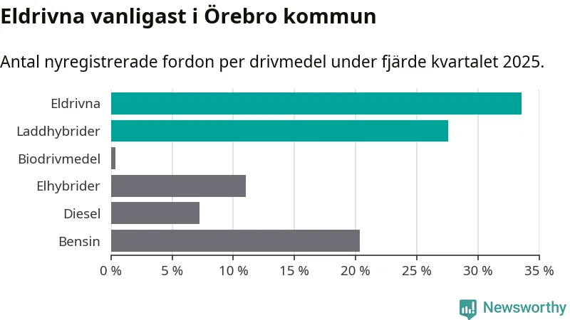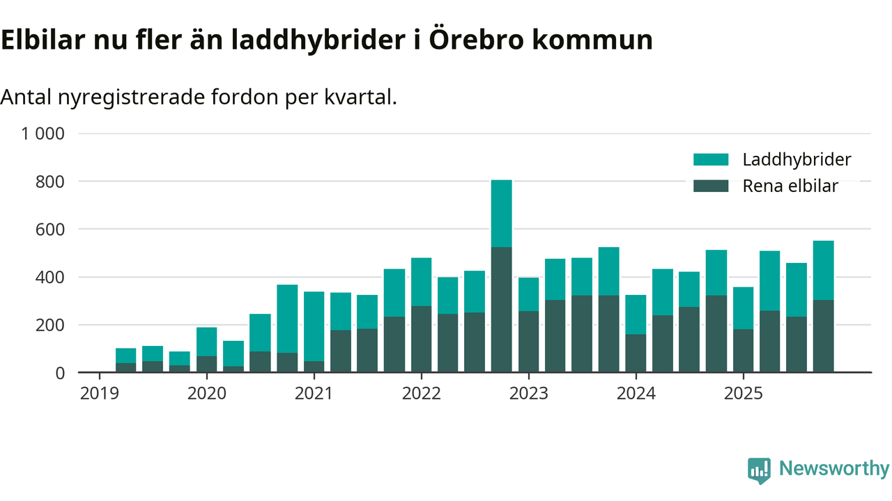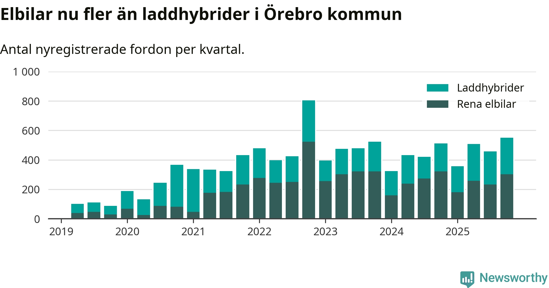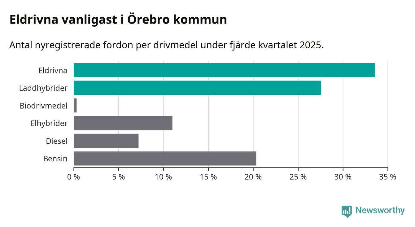 Under fjärde kvartalet 2025 var 61 procent av alla nyregistrerade personbilar i Örebro kommun laddbara (sammanlagt registrerades 900 nya bilar). Merparten av de laddbara bilarna var rena elbilar (34 procent av alla).