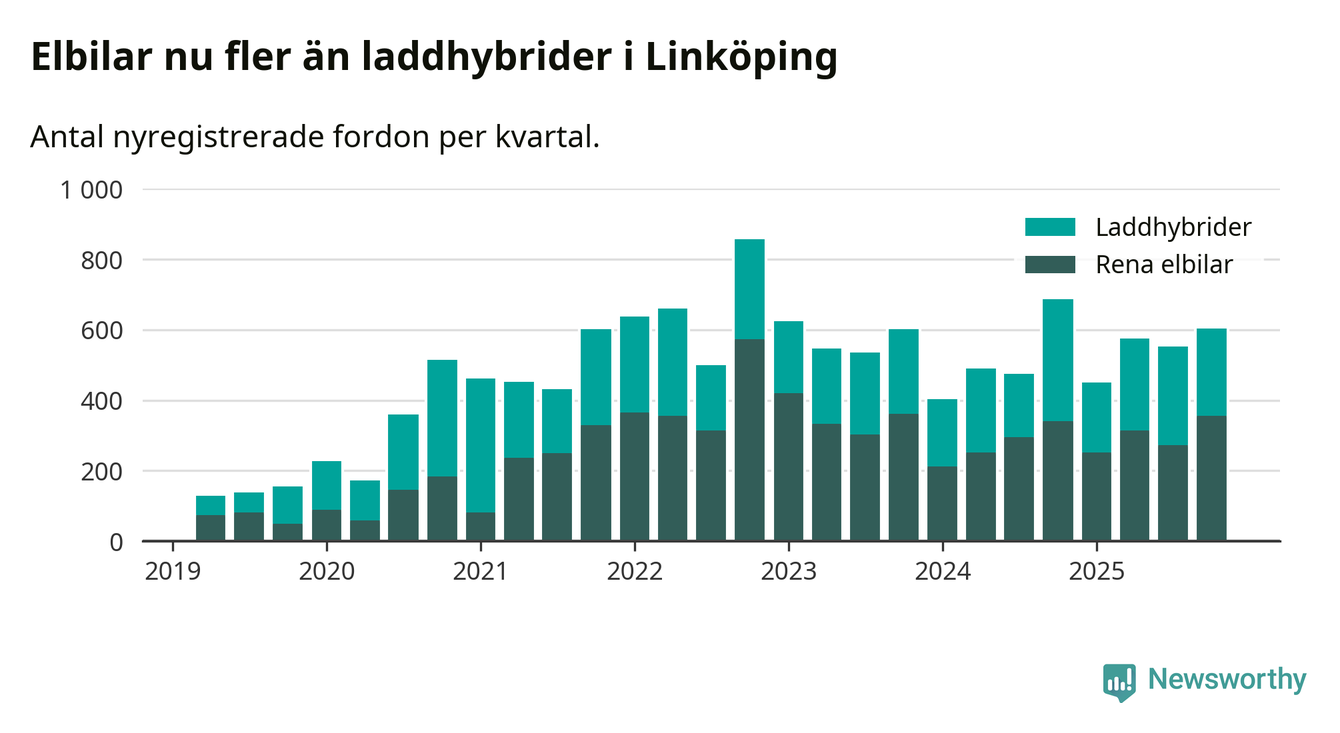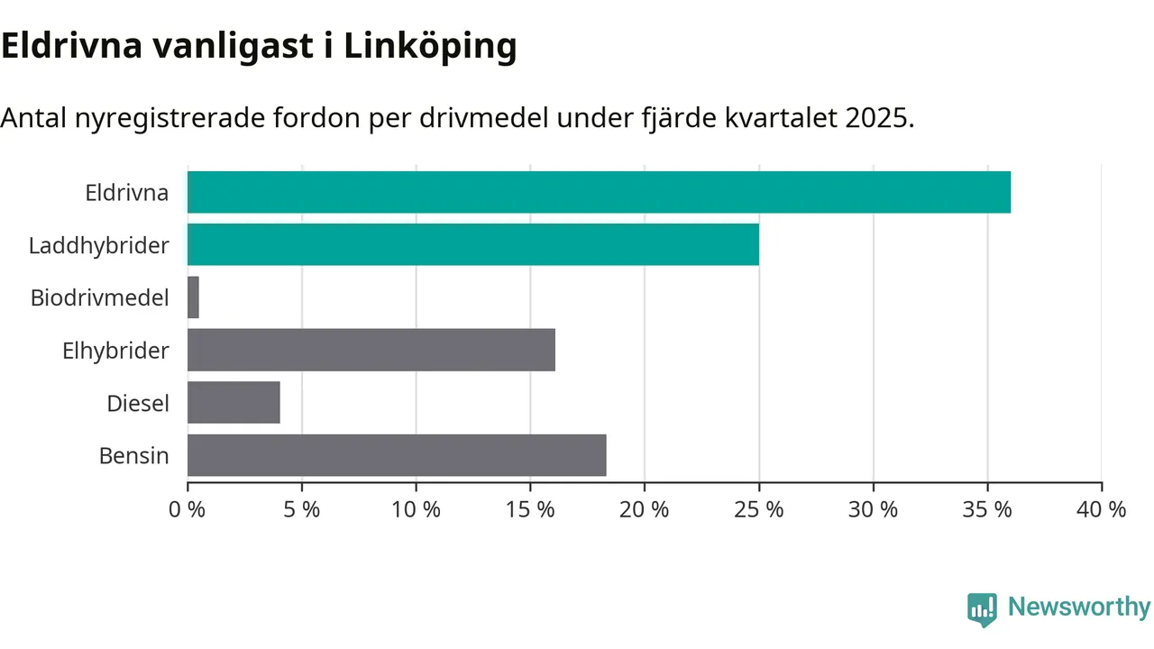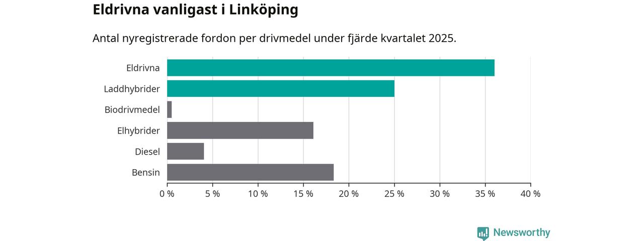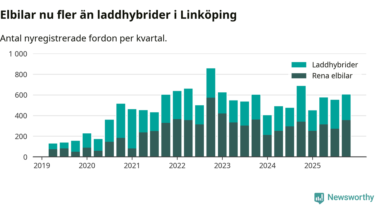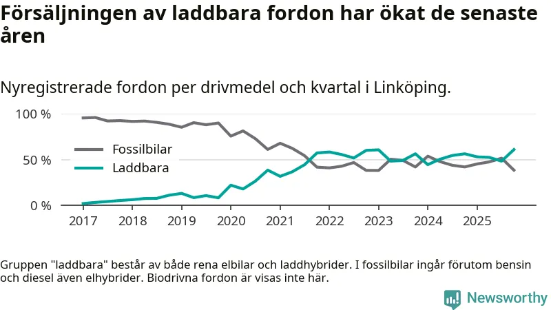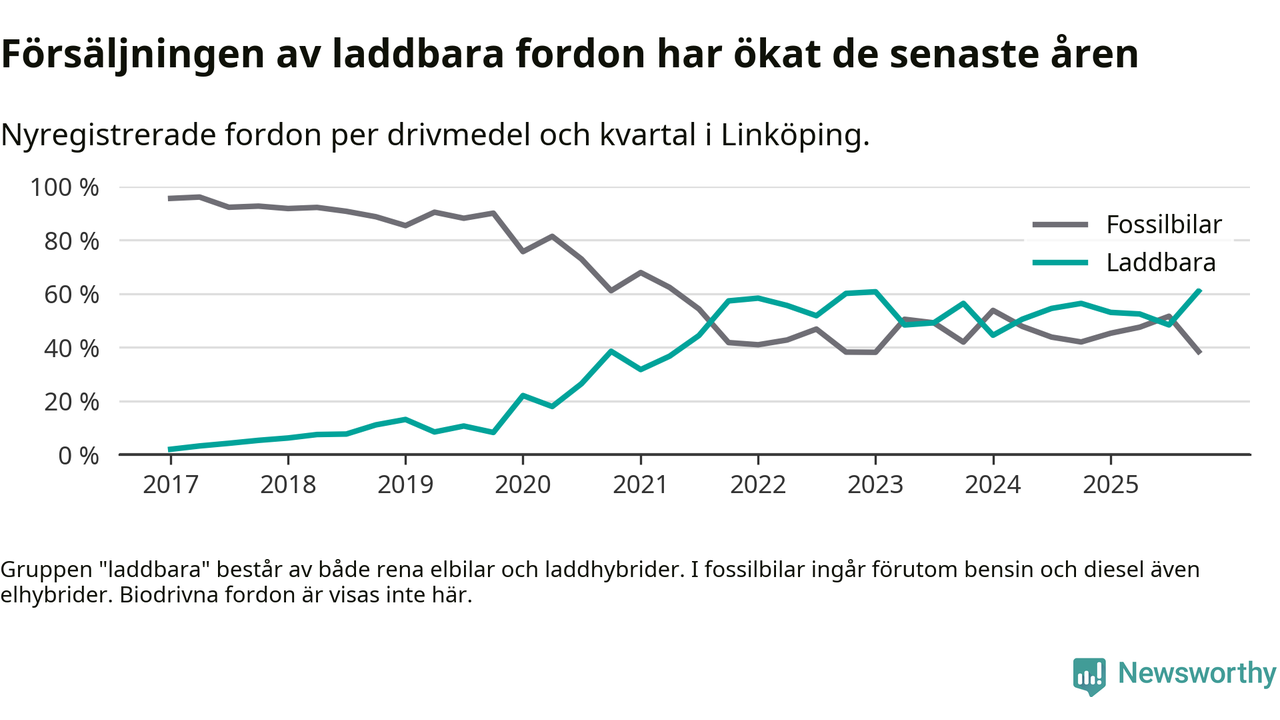 Under fjärde kvartalet 2025 var 61 procent av alla nyregistrerade personbilar i Linköping laddbara (sammanlagt registrerades 988 nya bilar). Merparten av de laddbara bilarna var rena elbilar (36 procent av alla).