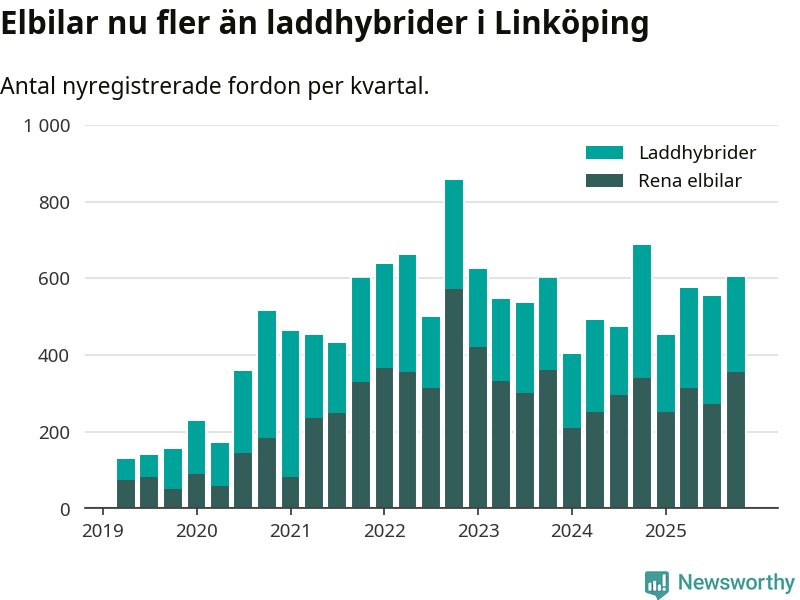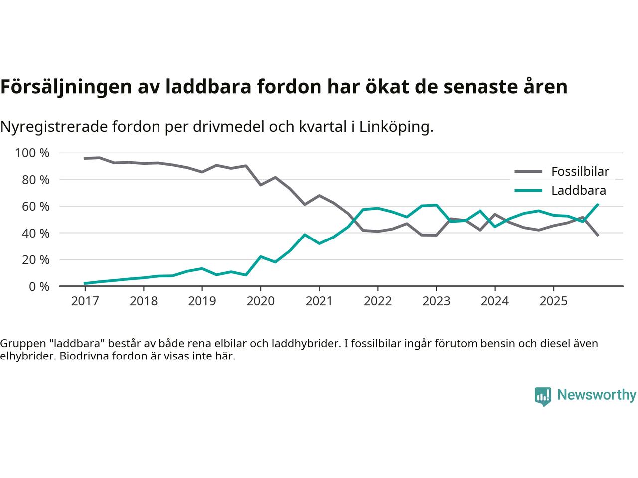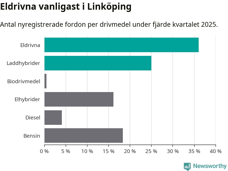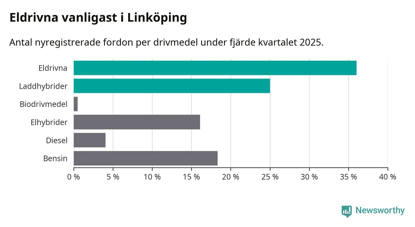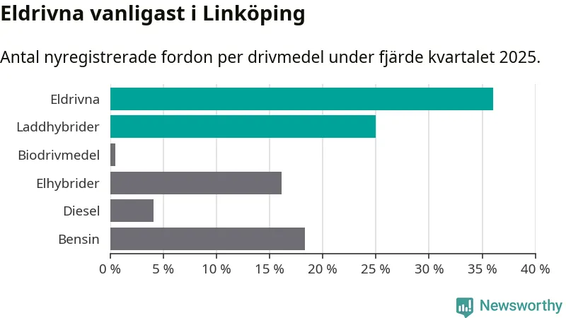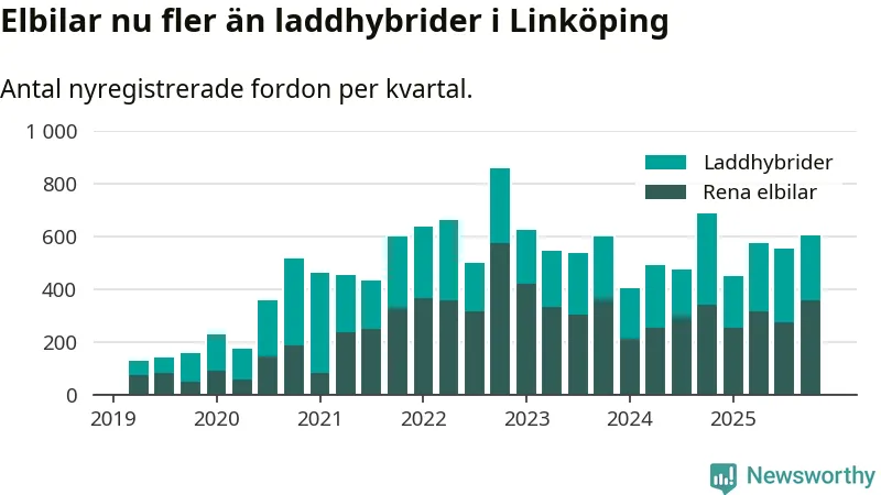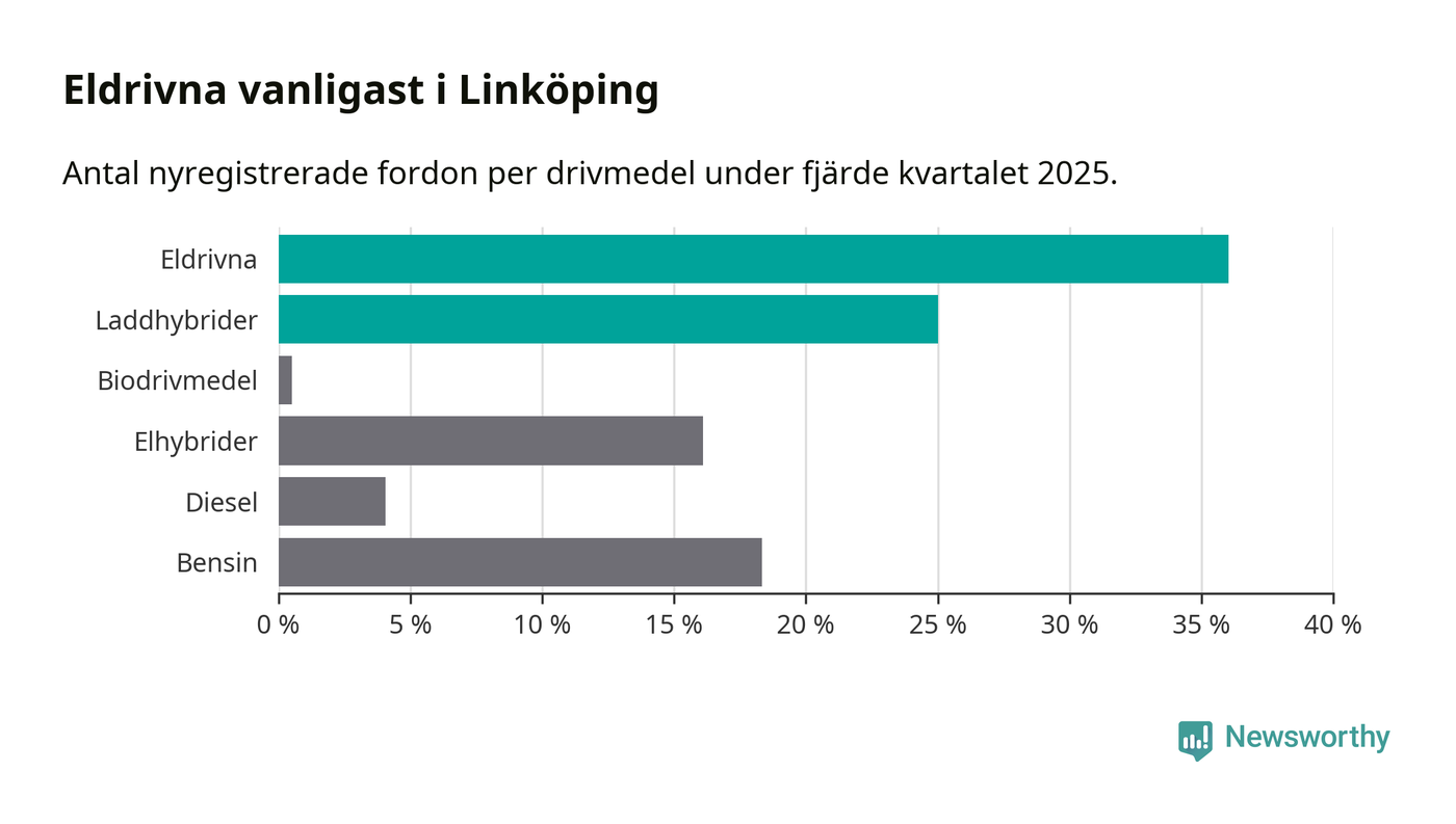 Under fjärde kvartalet 2025 var 61 procent av alla nyregistrerade personbilar i Linköping laddbara (sammanlagt registrerades 988 nya bilar). Merparten av de laddbara bilarna var rena elbilar (36 procent av alla).