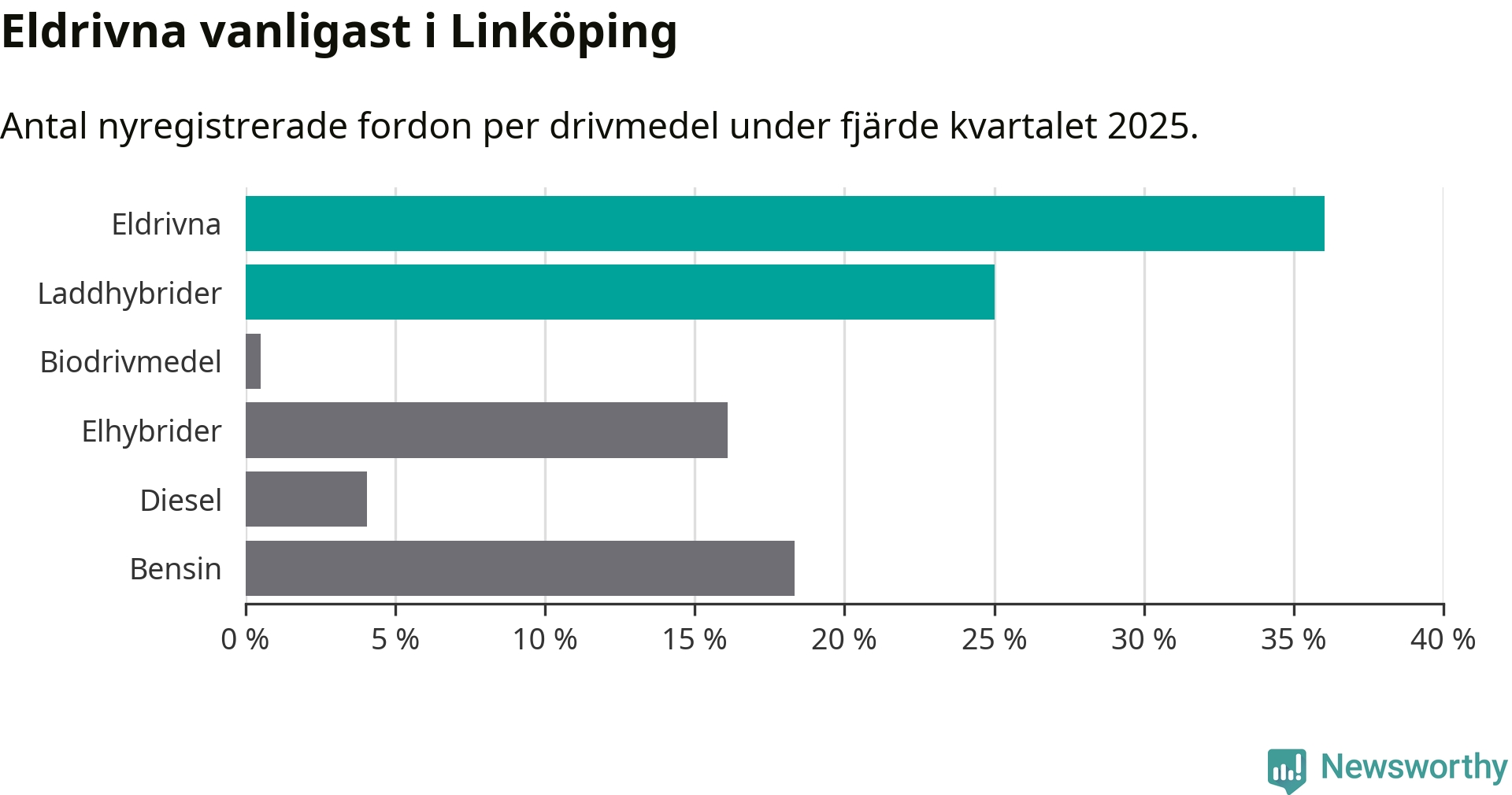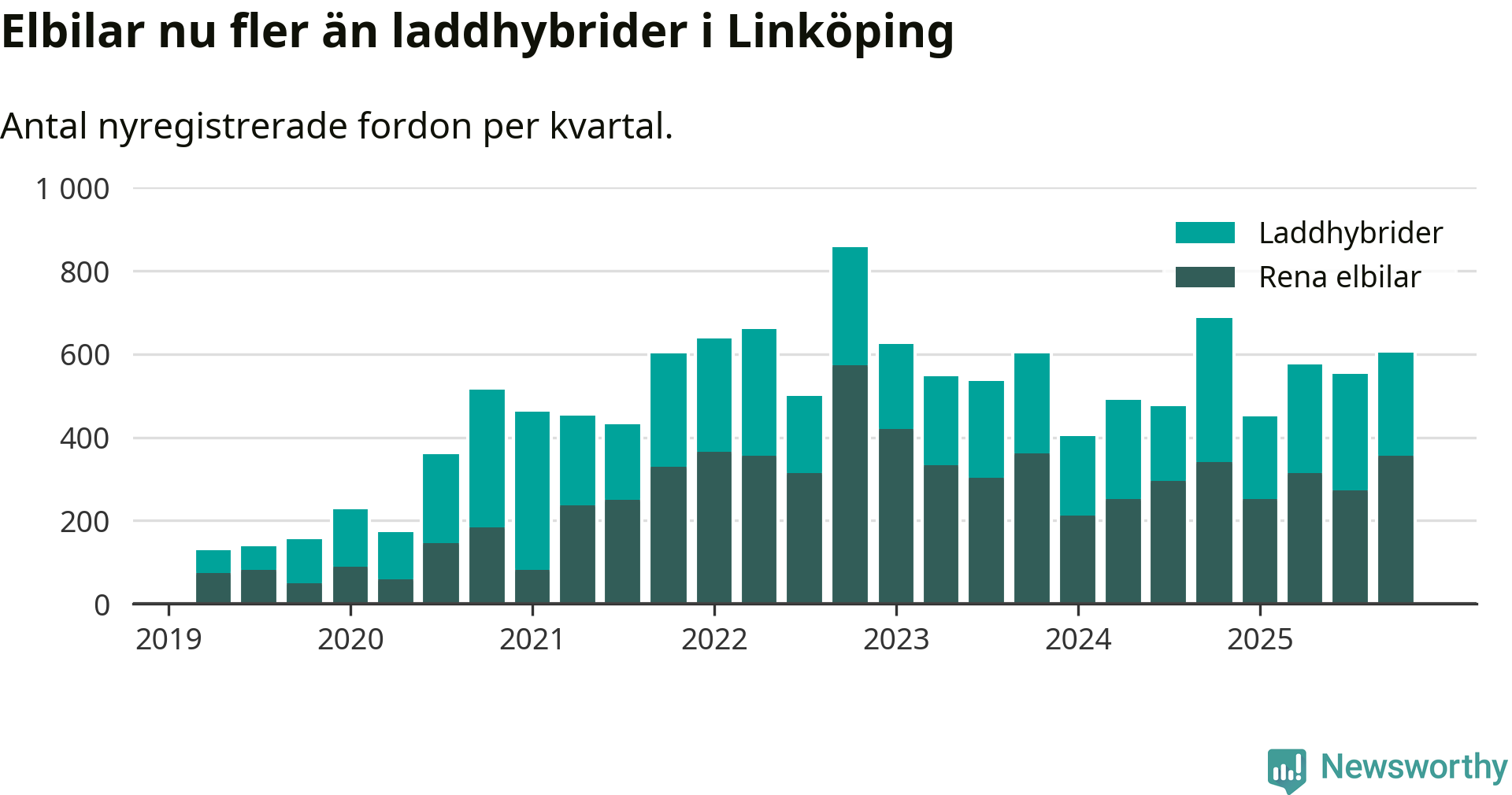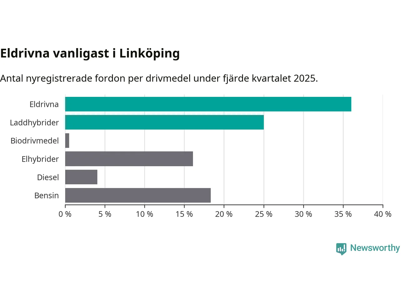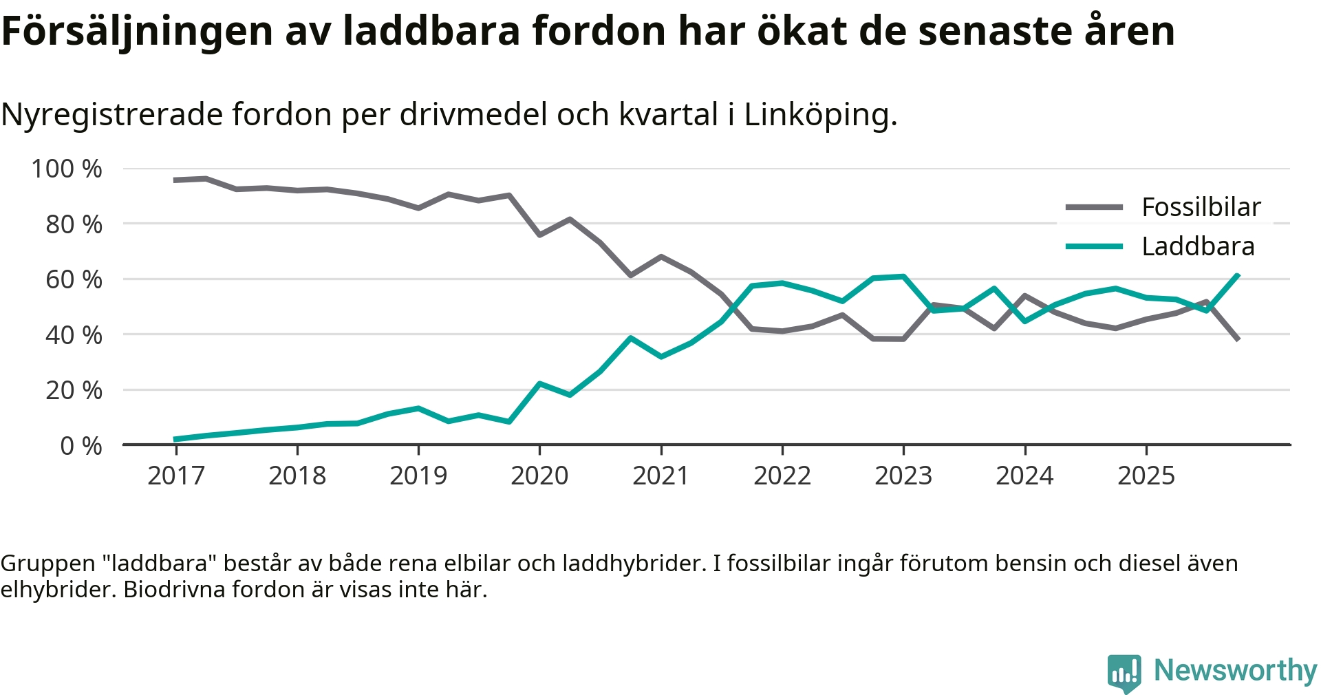 Under fjärde kvartalet 2025 var 61 procent av alla nyregistrerade personbilar i Linköping laddbara (sammanlagt registrerades 988 nya bilar). Merparten av de laddbara bilarna var rena elbilar (36 procent av alla).