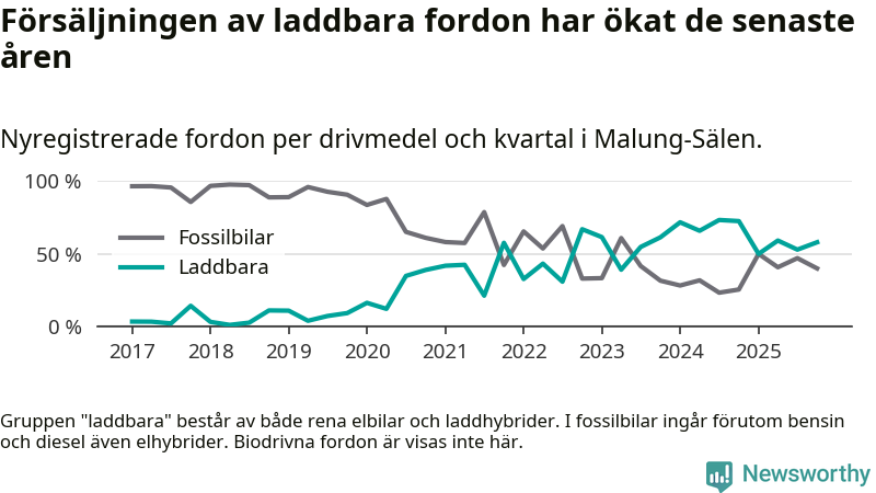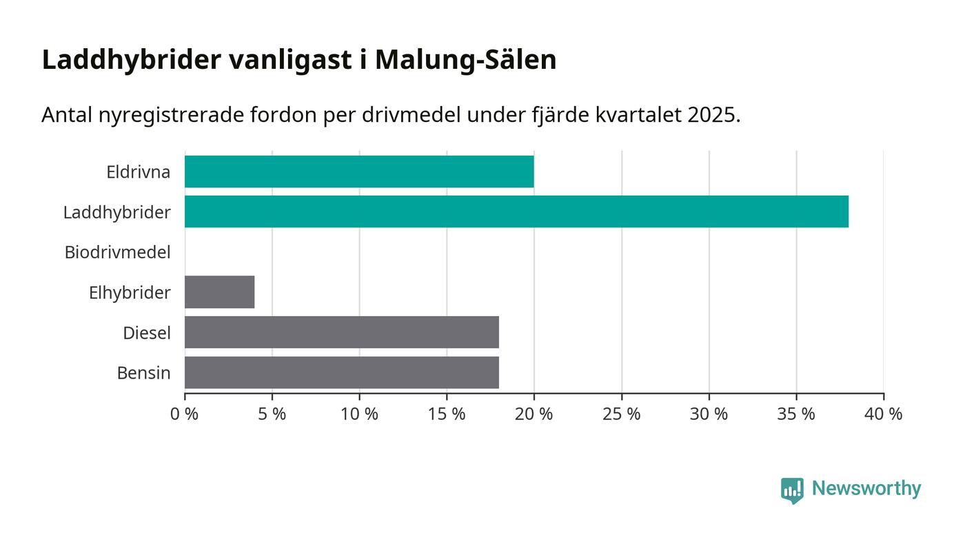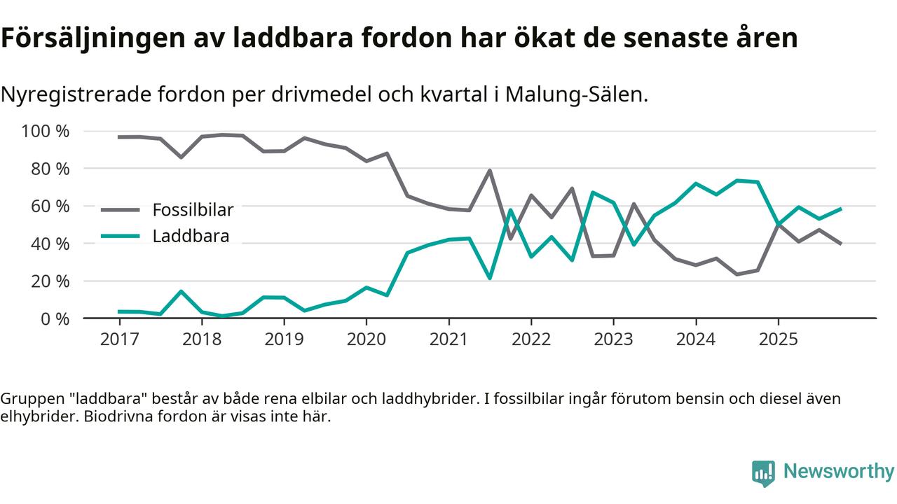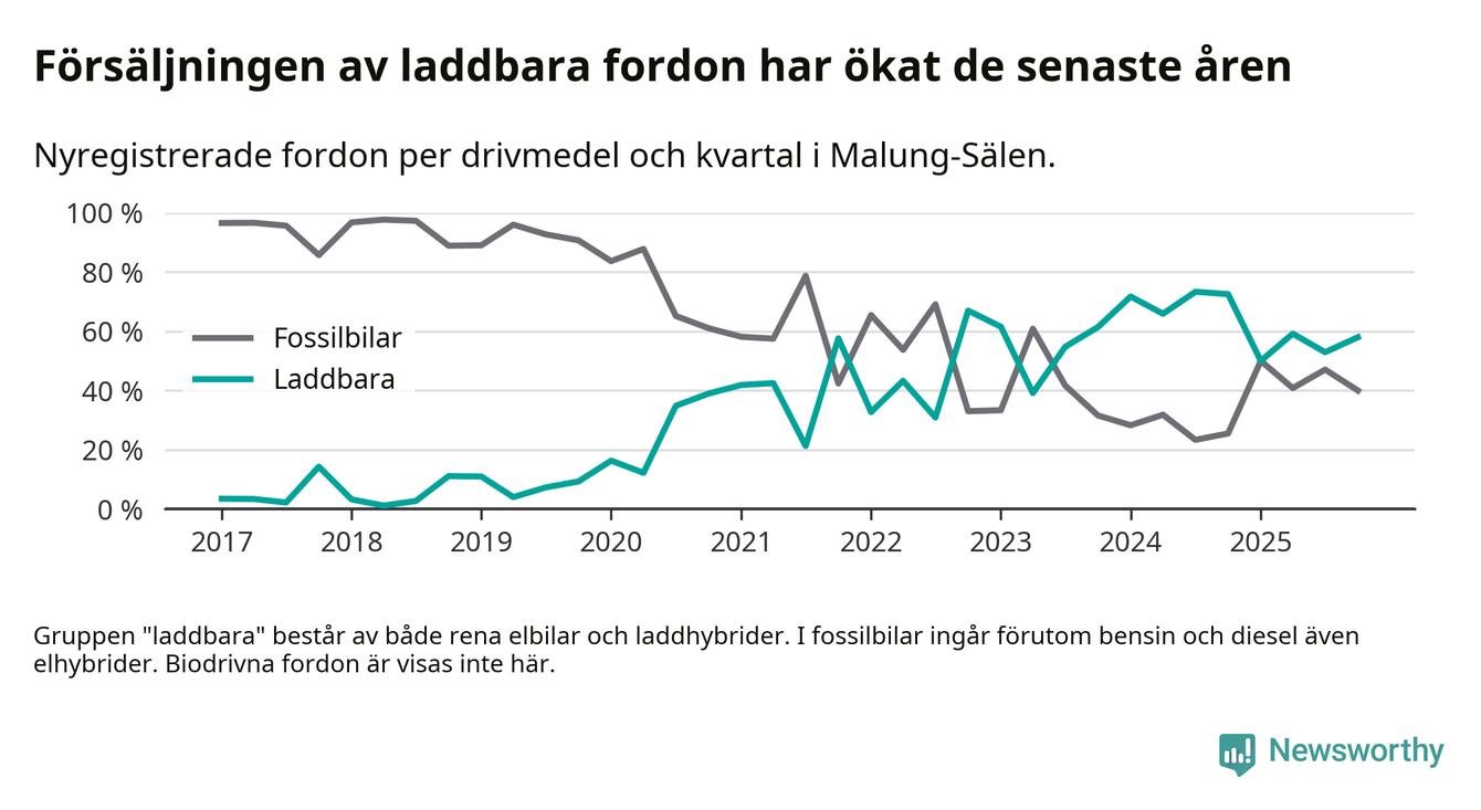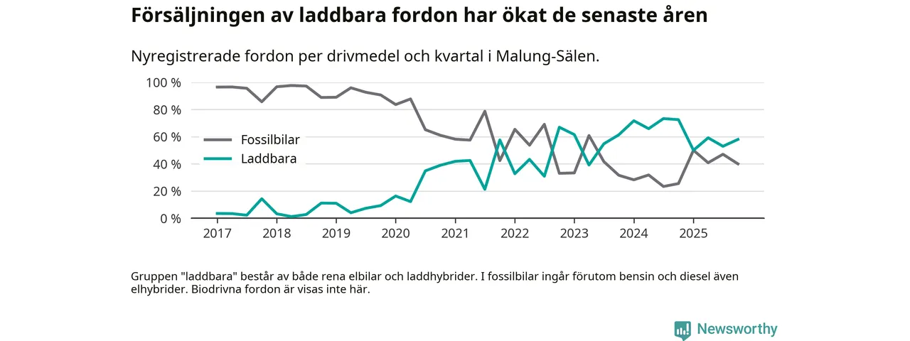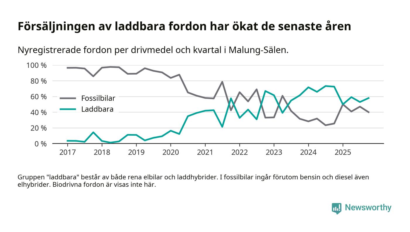 Under fjärde kvartalet 2025 var 58 procent av alla nyregistrerade personbilar i Malung-Sälen laddbara (sammanlagt registrerades 50 nya bilar). Merparten av de laddbara bilarna var så kallade laddhybrider, det vill säga fordon som går att ladda och köra på el, men som även har en förbränningsmotor. 20 procent av alla nya bilar var rena elbilar.