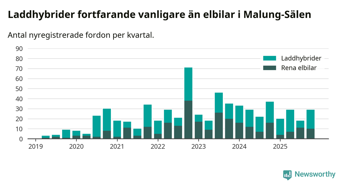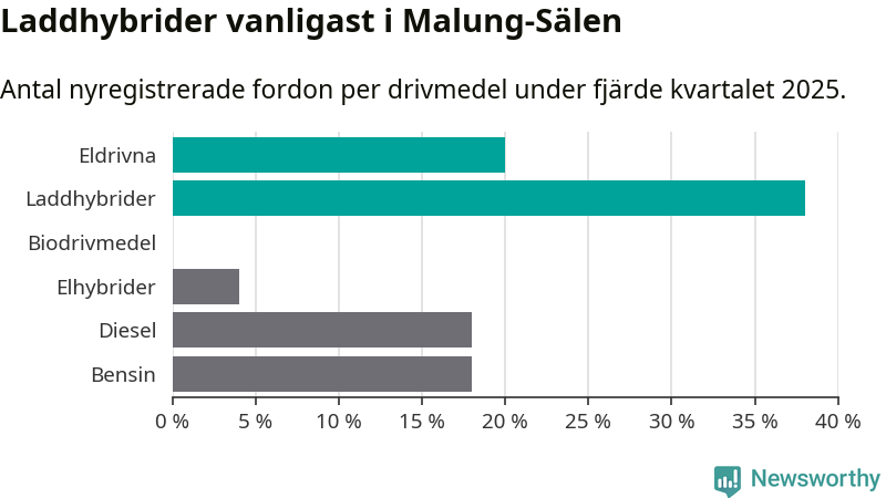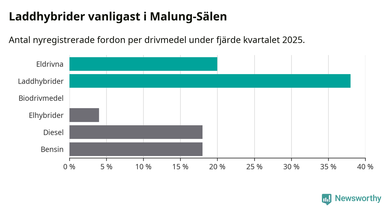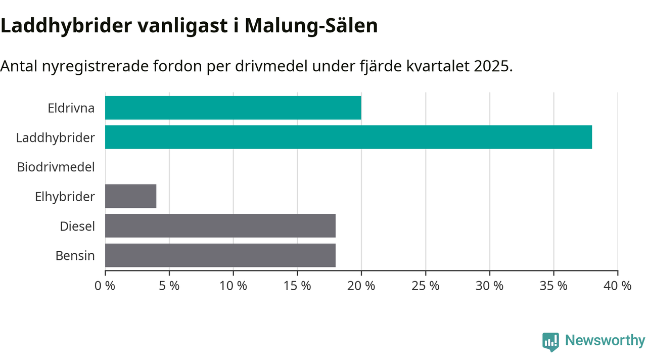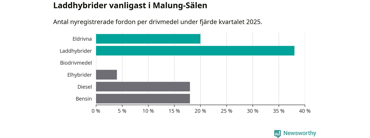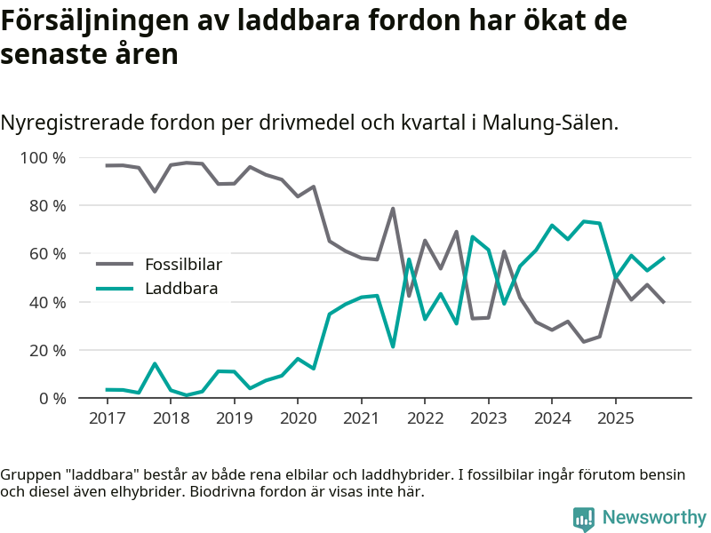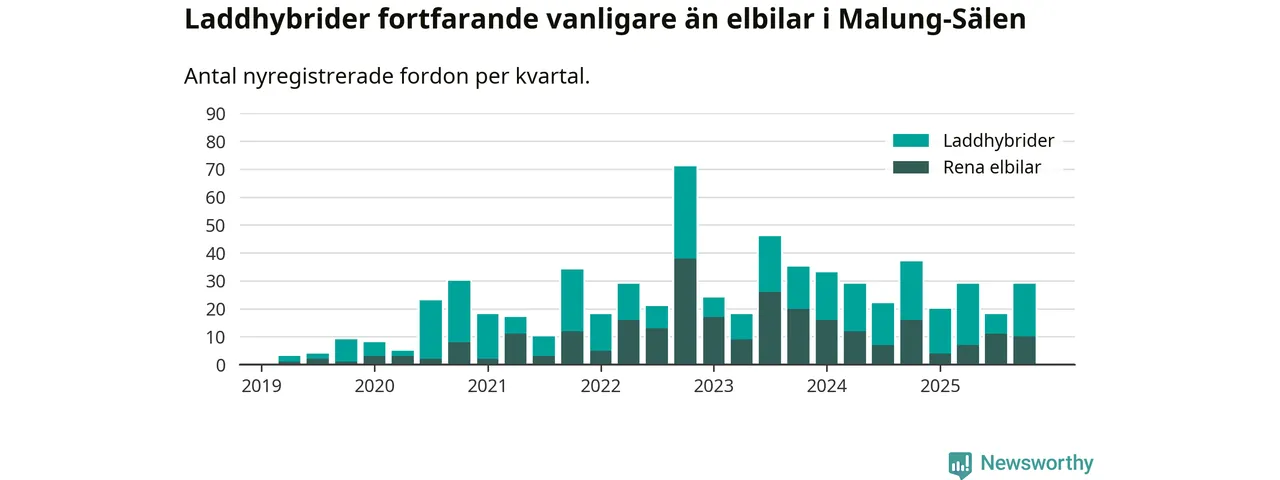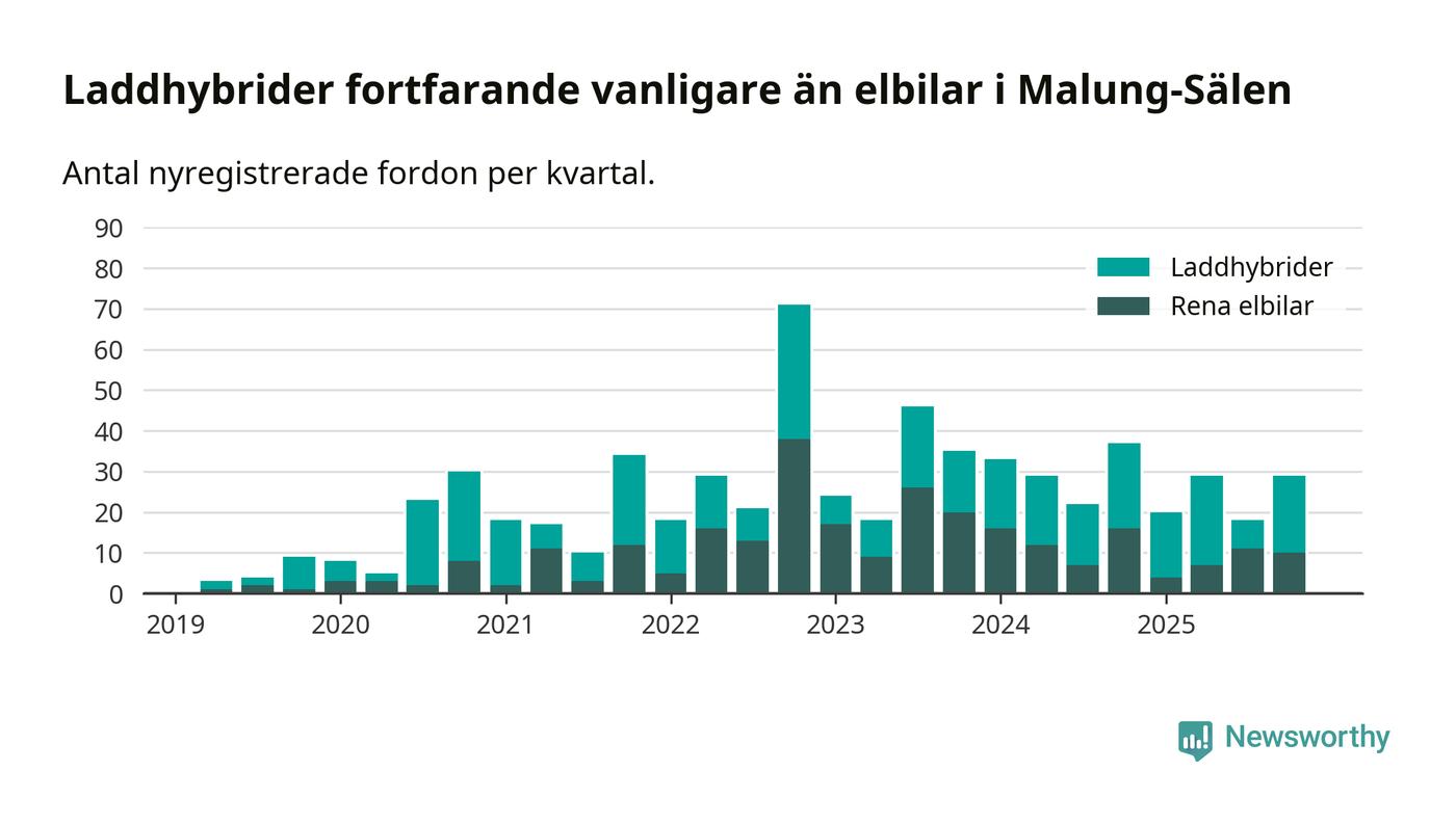 Under fjärde kvartalet 2025 var 58 procent av alla nyregistrerade personbilar i Malung-Sälen laddbara (sammanlagt registrerades 50 nya bilar). Merparten av de laddbara bilarna var så kallade laddhybrider, det vill säga fordon som går att ladda och köra på el, men som även har en förbränningsmotor. 20 procent av alla nya bilar var rena elbilar.