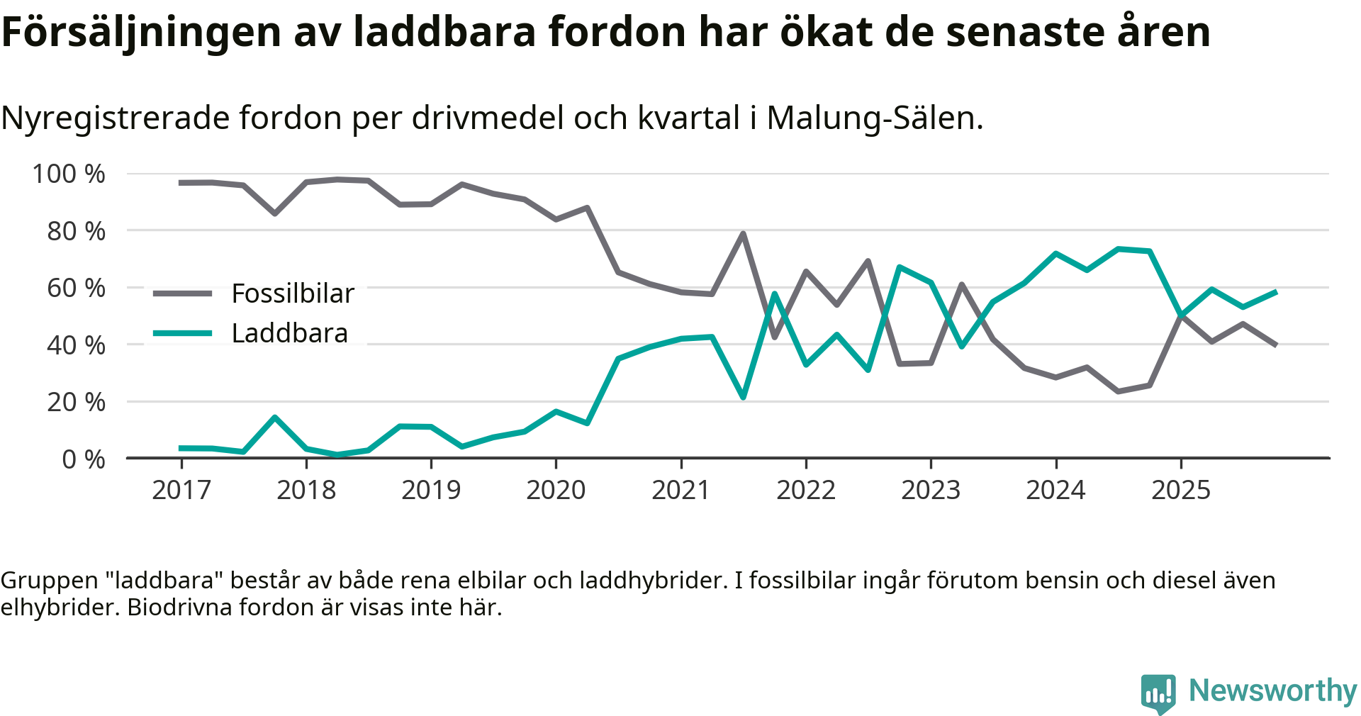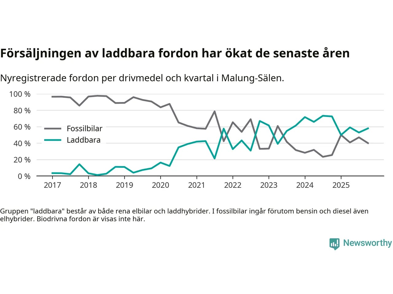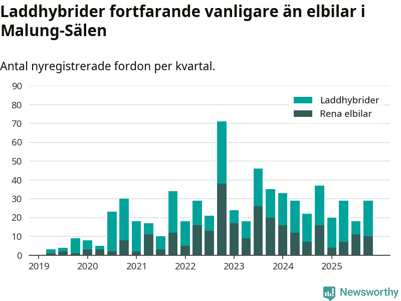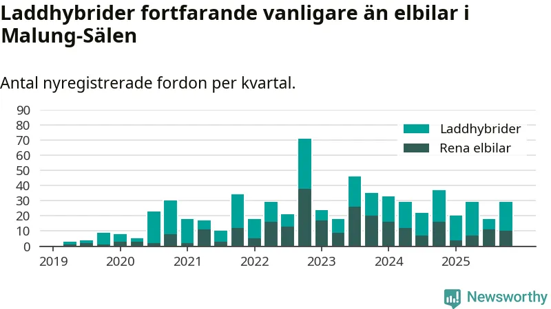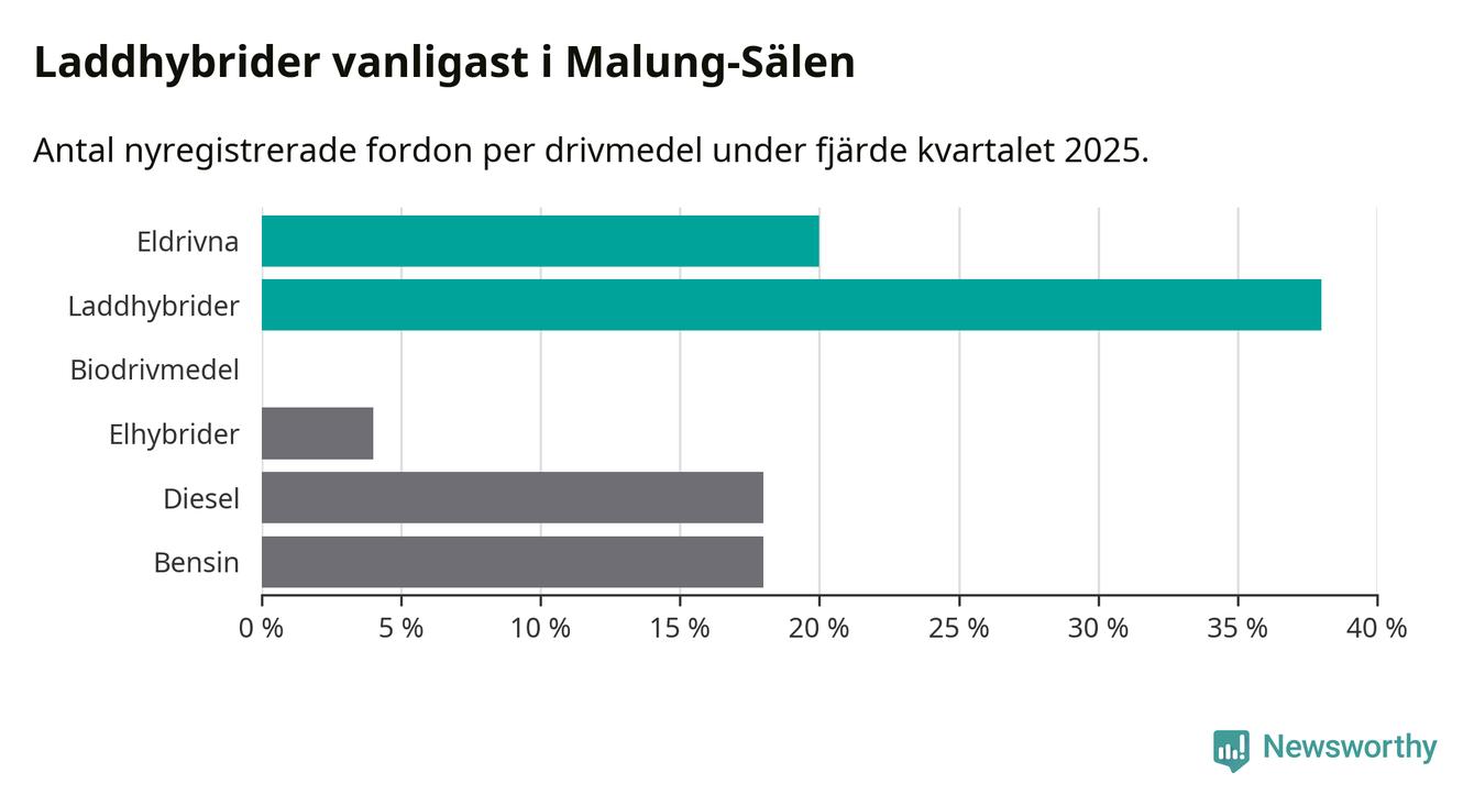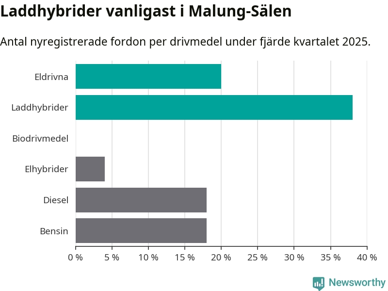 Under fjärde kvartalet 2025 var 58 procent av alla nyregistrerade personbilar i Malung-Sälen laddbara (sammanlagt registrerades 50 nya bilar). Merparten av de laddbara bilarna var så kallade laddhybrider, det vill säga fordon som går att ladda och köra på el, men som även har en förbränningsmotor. 20 procent av alla nya bilar var rena elbilar.