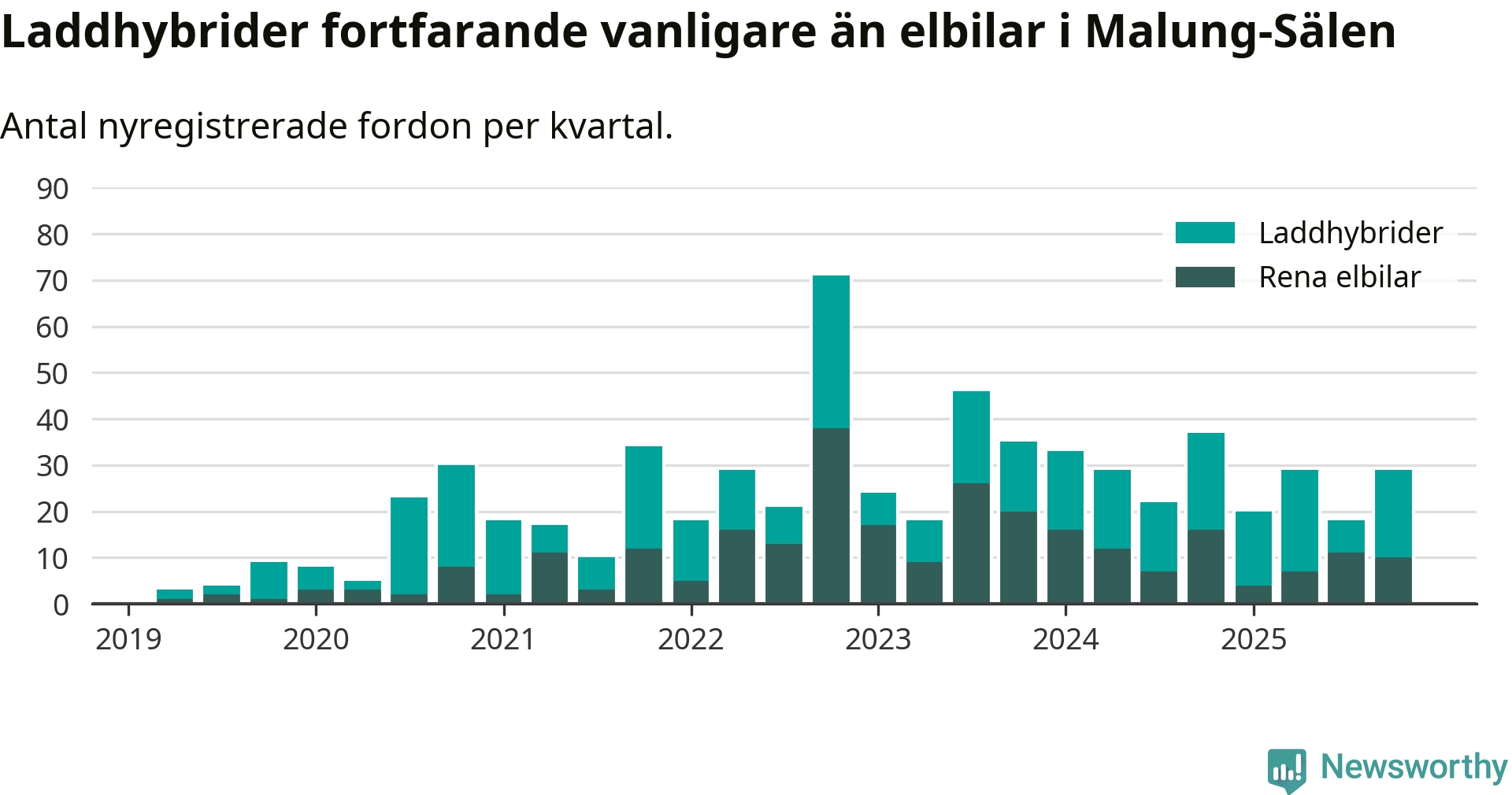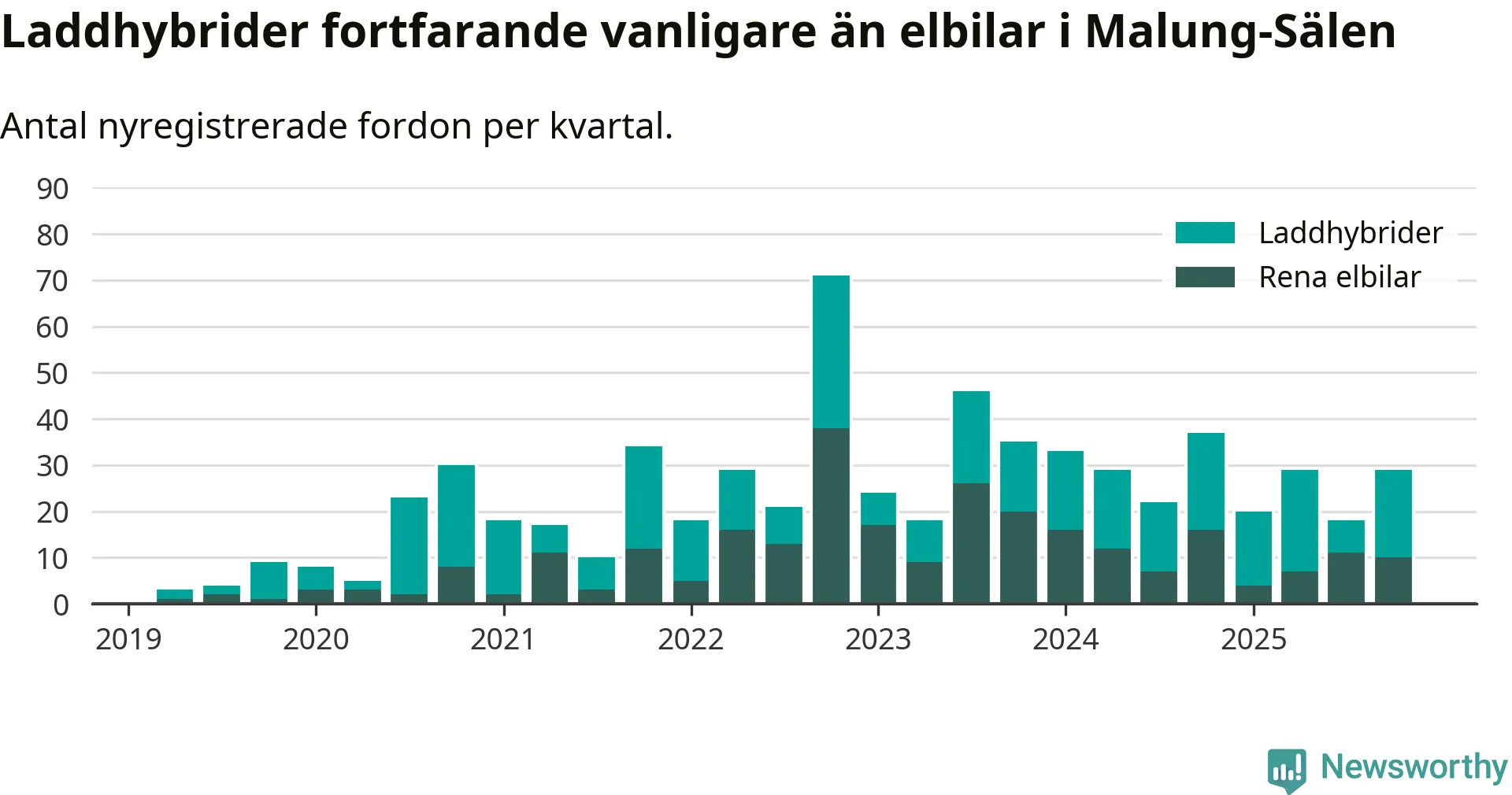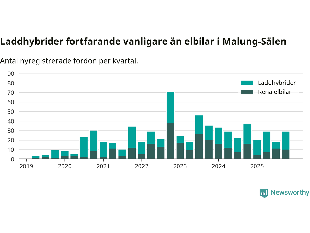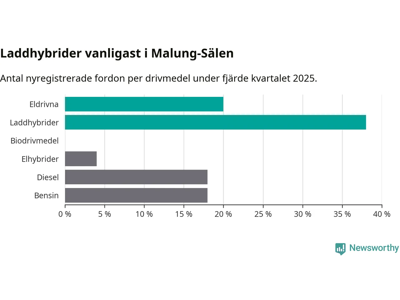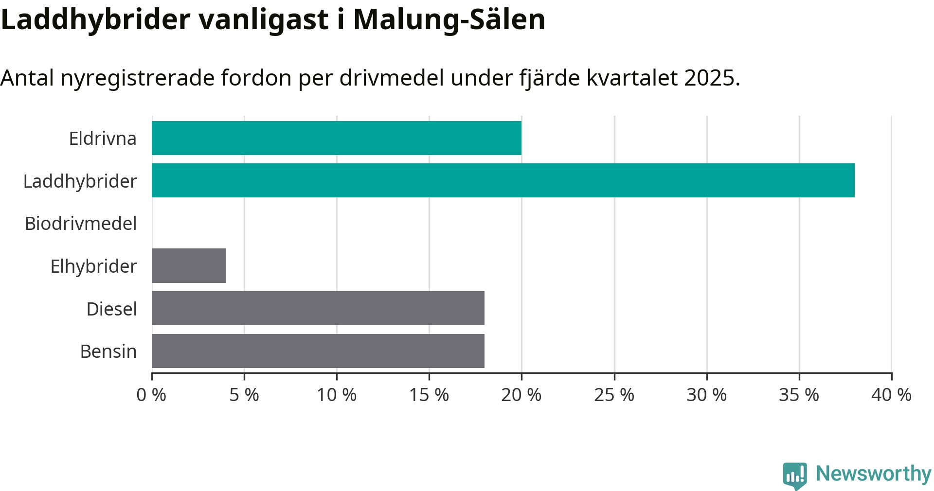 Under fjärde kvartalet 2025 var 58 procent av alla nyregistrerade personbilar i Malung-Sälen laddbara (sammanlagt registrerades 50 nya bilar). Merparten av de laddbara bilarna var så kallade laddhybrider, det vill säga fordon som går att ladda och köra på el, men som även har en förbränningsmotor. 20 procent av alla nya bilar var rena elbilar.