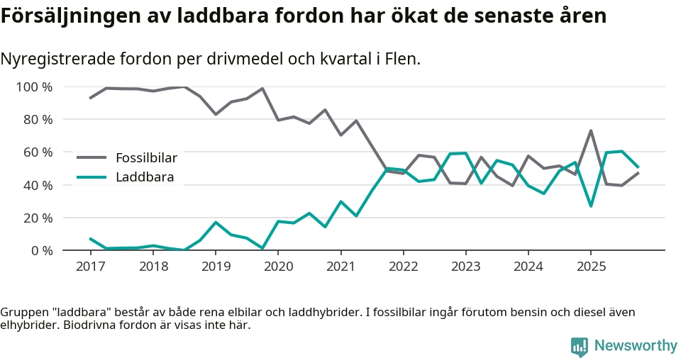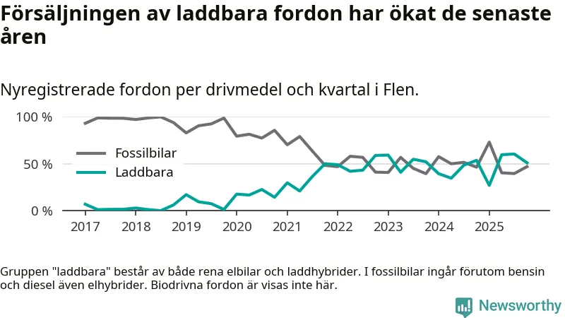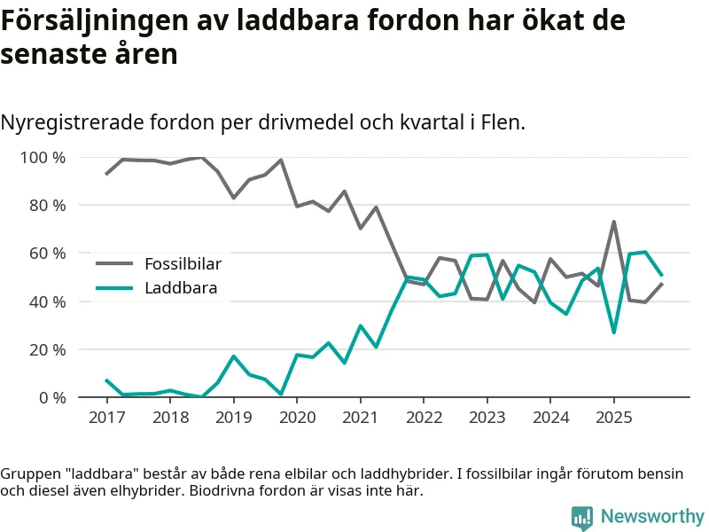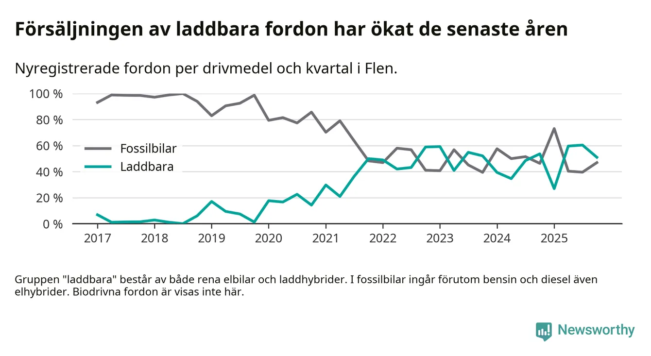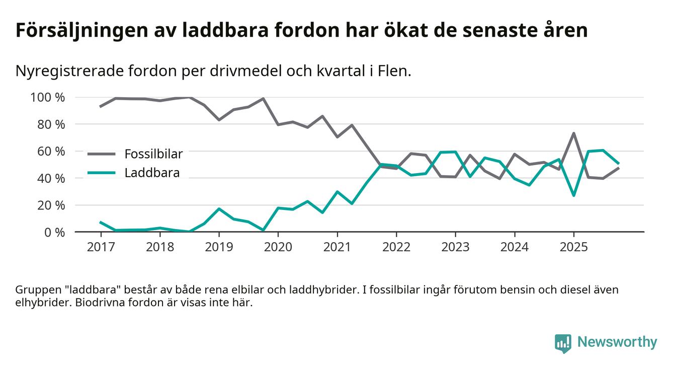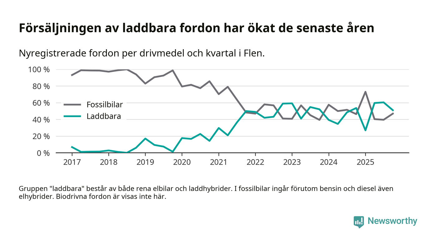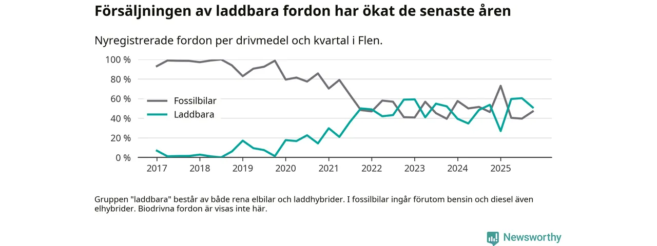 I Flen minskade andelen laddbara bilar under fjärde kvartalet jämfört med kvartalet innan (−9,4 procentenheter). Nyregistreringen peakade under tredje kvartalet 2025 då 60 procent av de nya bilarna var laddbara.