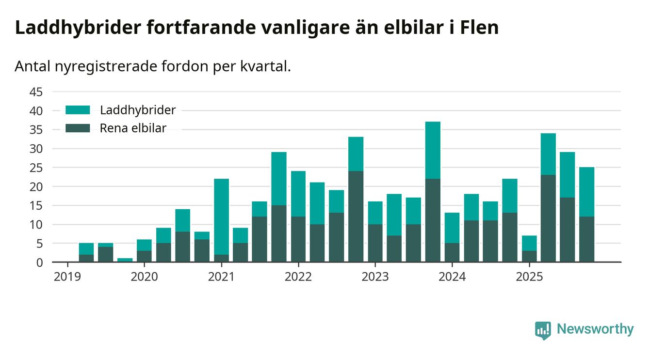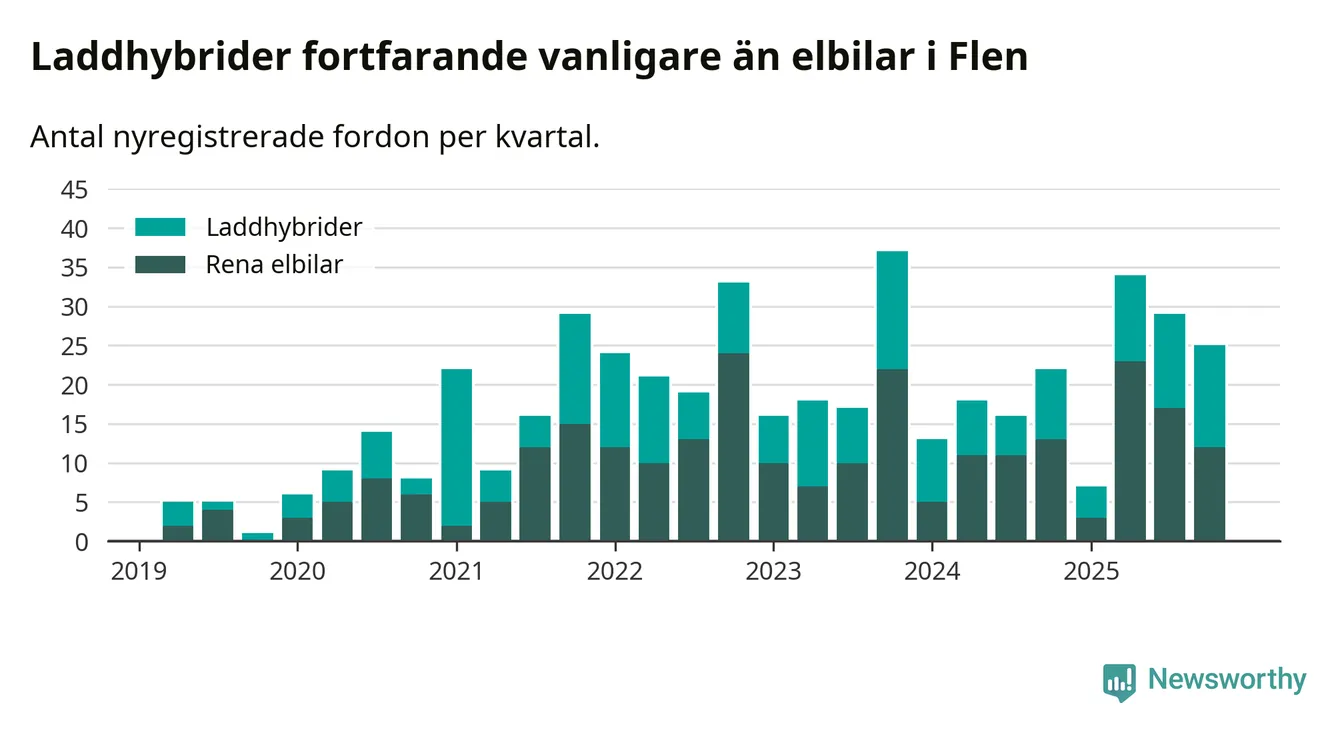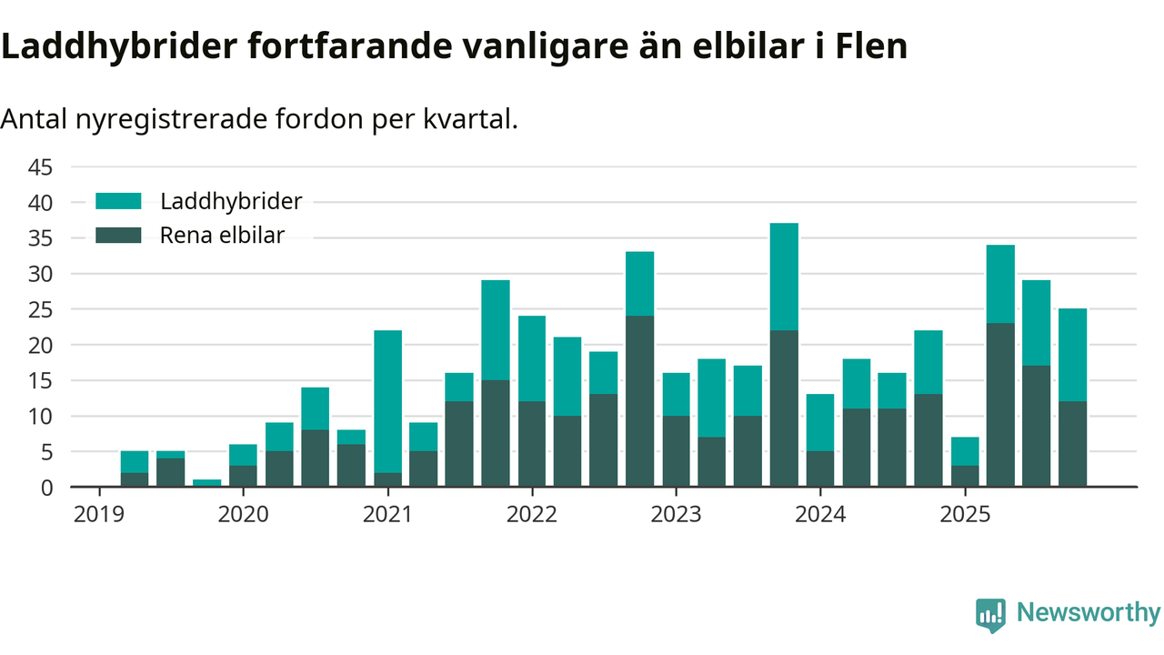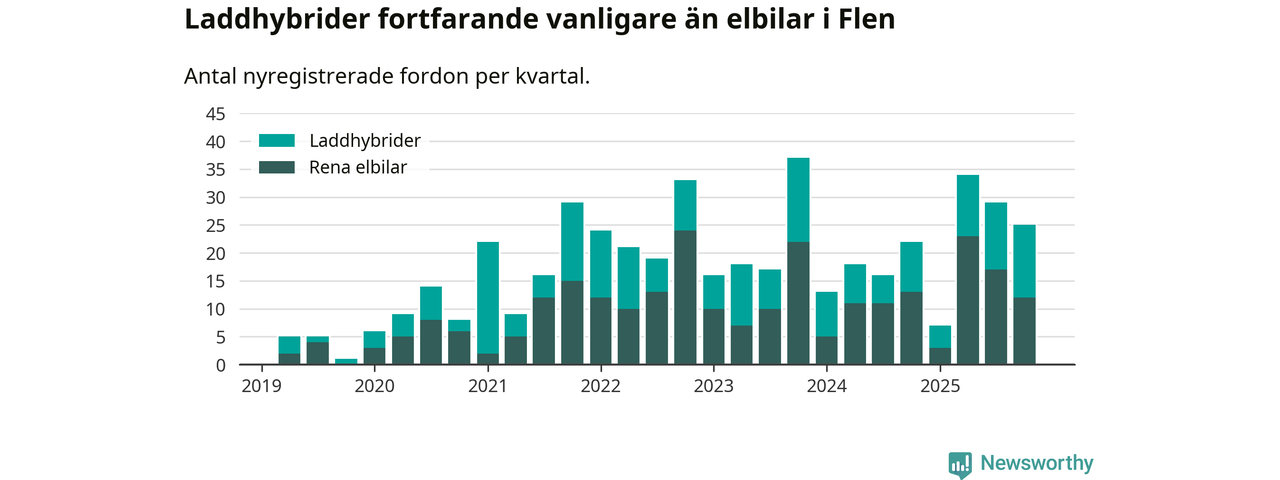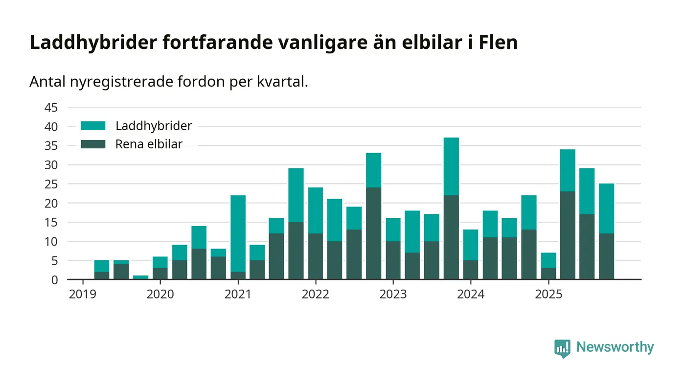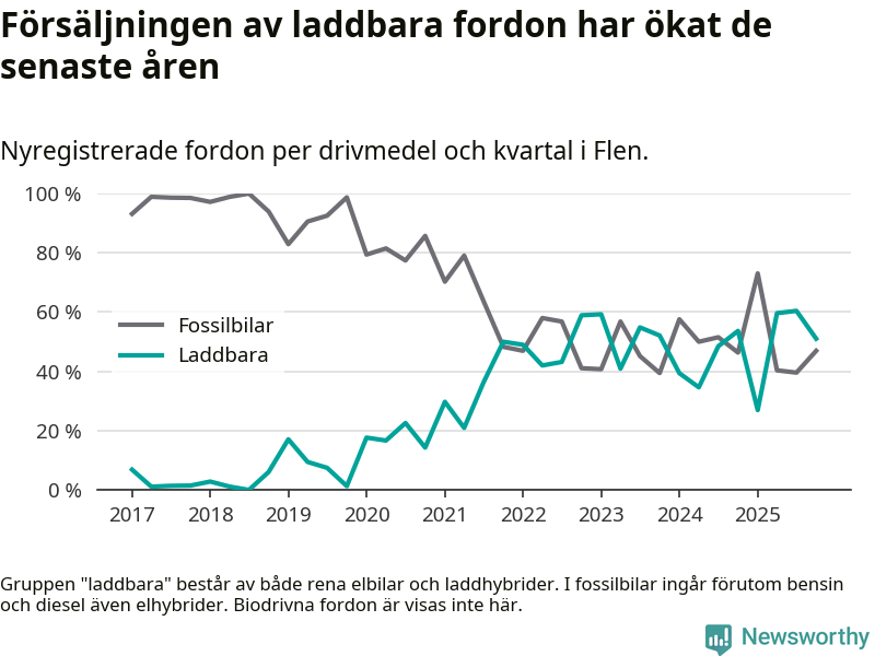 I Flen minskade andelen laddbara bilar under fjärde kvartalet jämfört med kvartalet innan (−9,4 procentenheter). Nyregistreringen peakade under tredje kvartalet 2025 då 60 procent av de nya bilarna var laddbara.