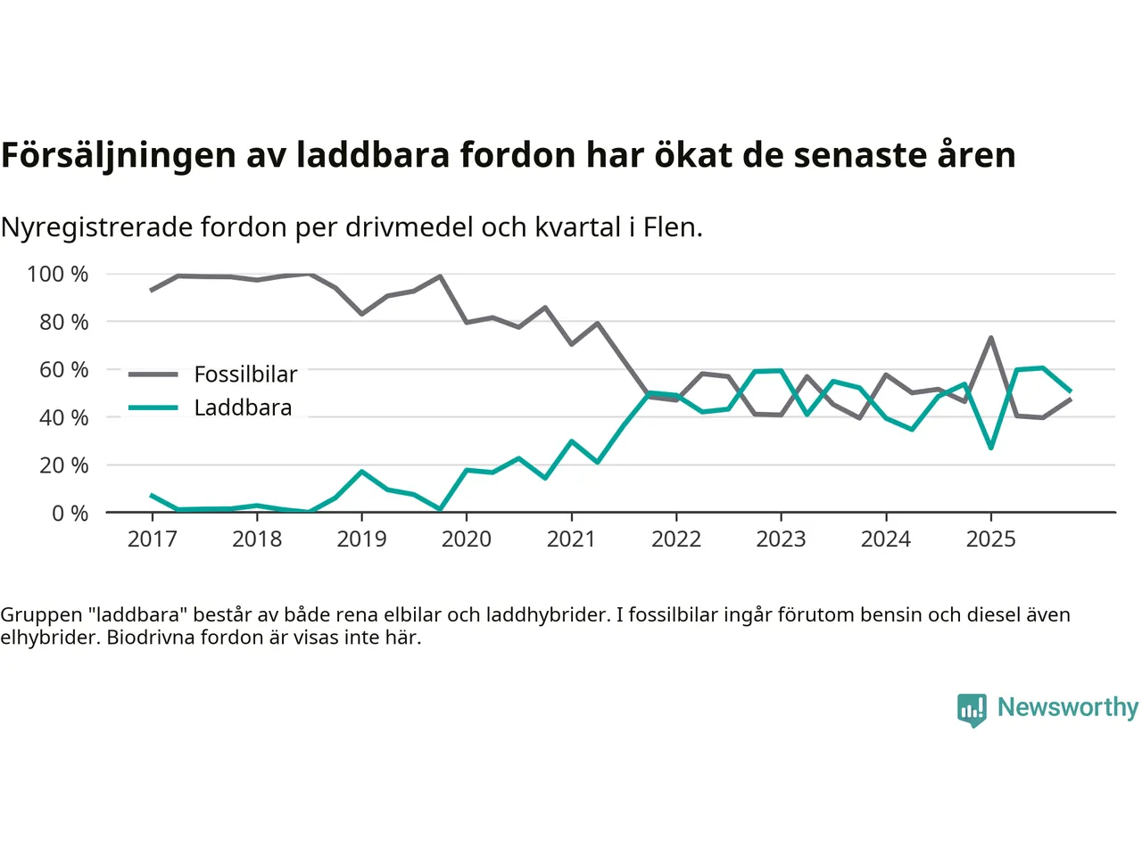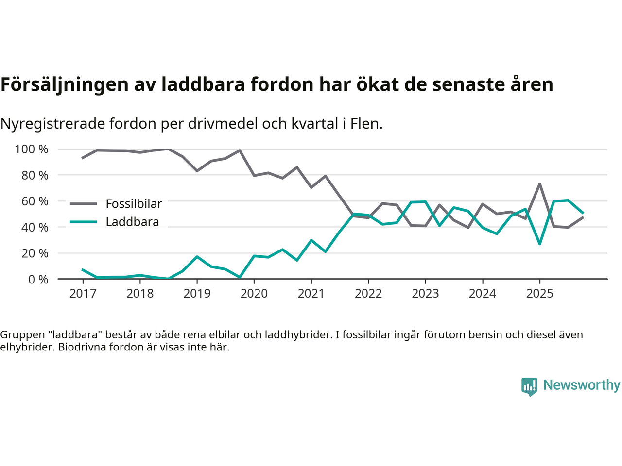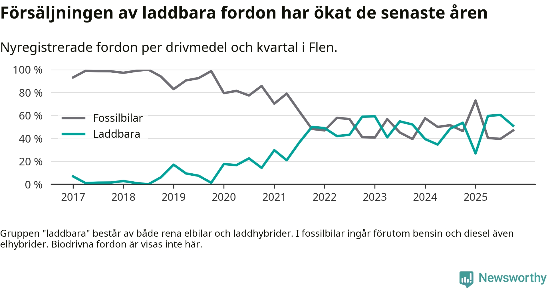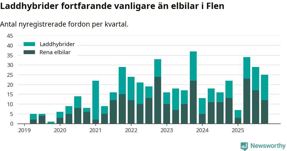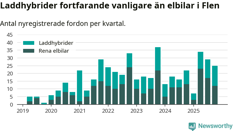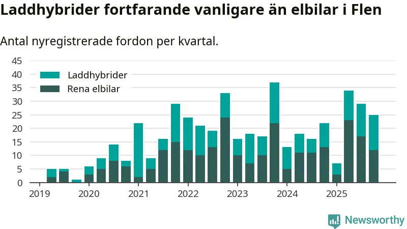 I Flen minskade andelen laddbara bilar under fjärde kvartalet jämfört med kvartalet innan (−9,4 procentenheter). Nyregistreringen peakade under tredje kvartalet 2025 då 60 procent av de nya bilarna var laddbara.