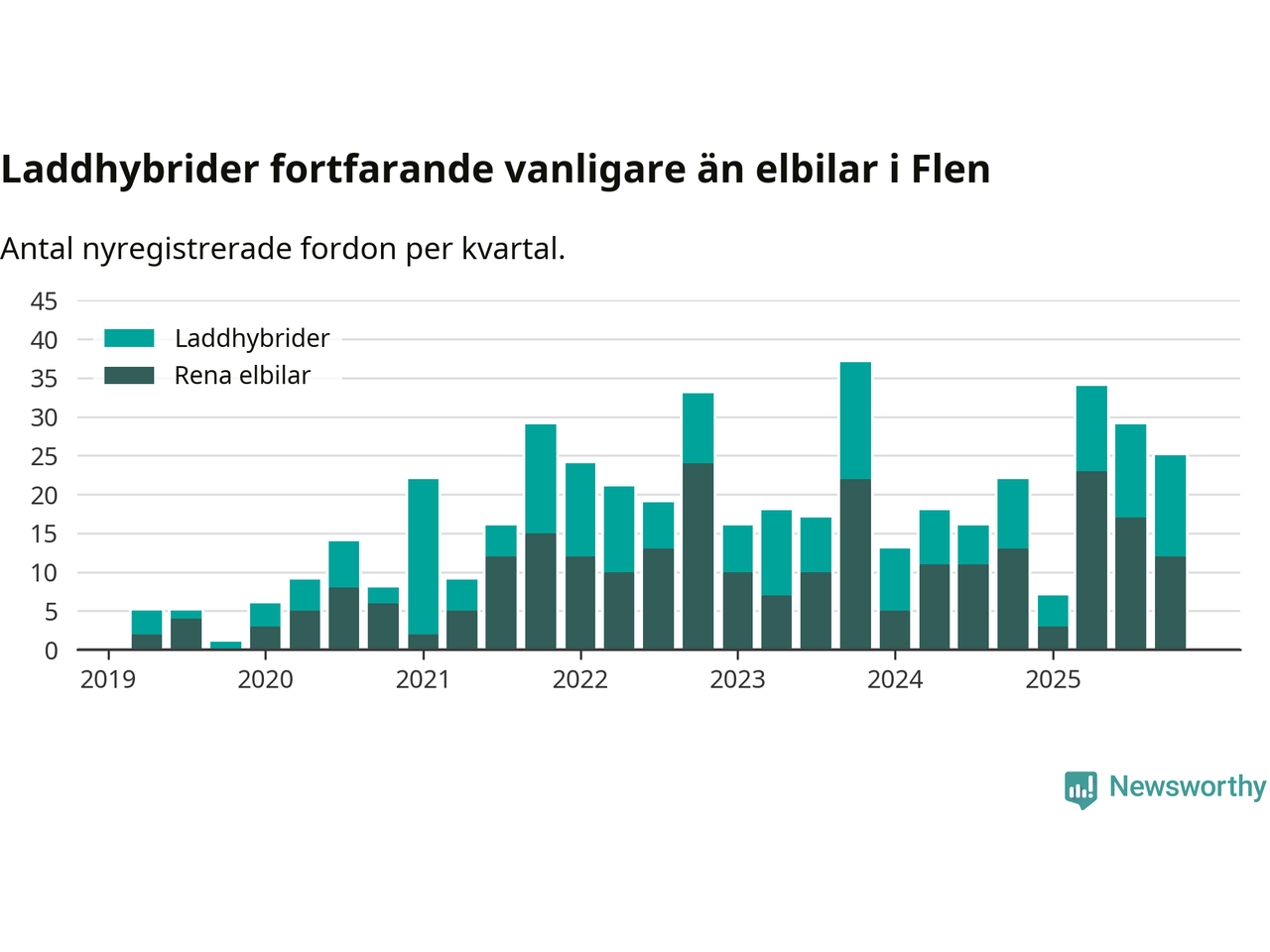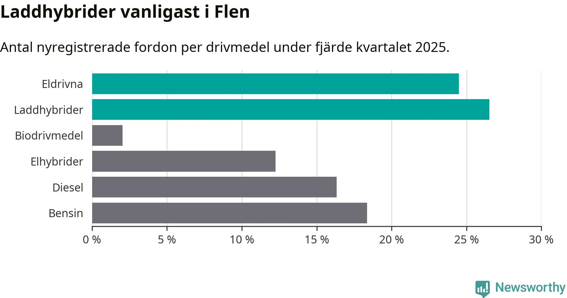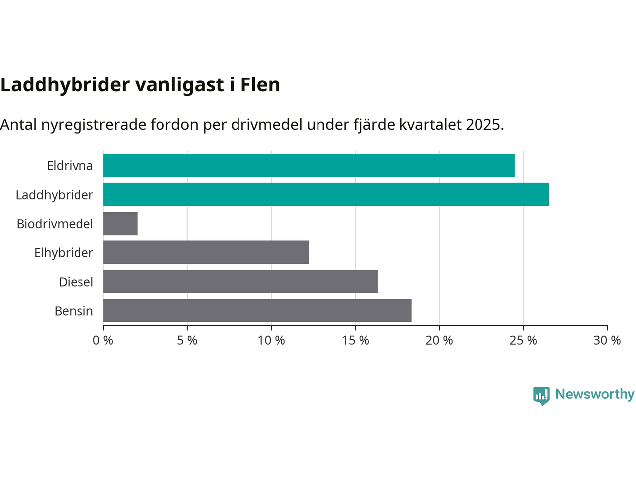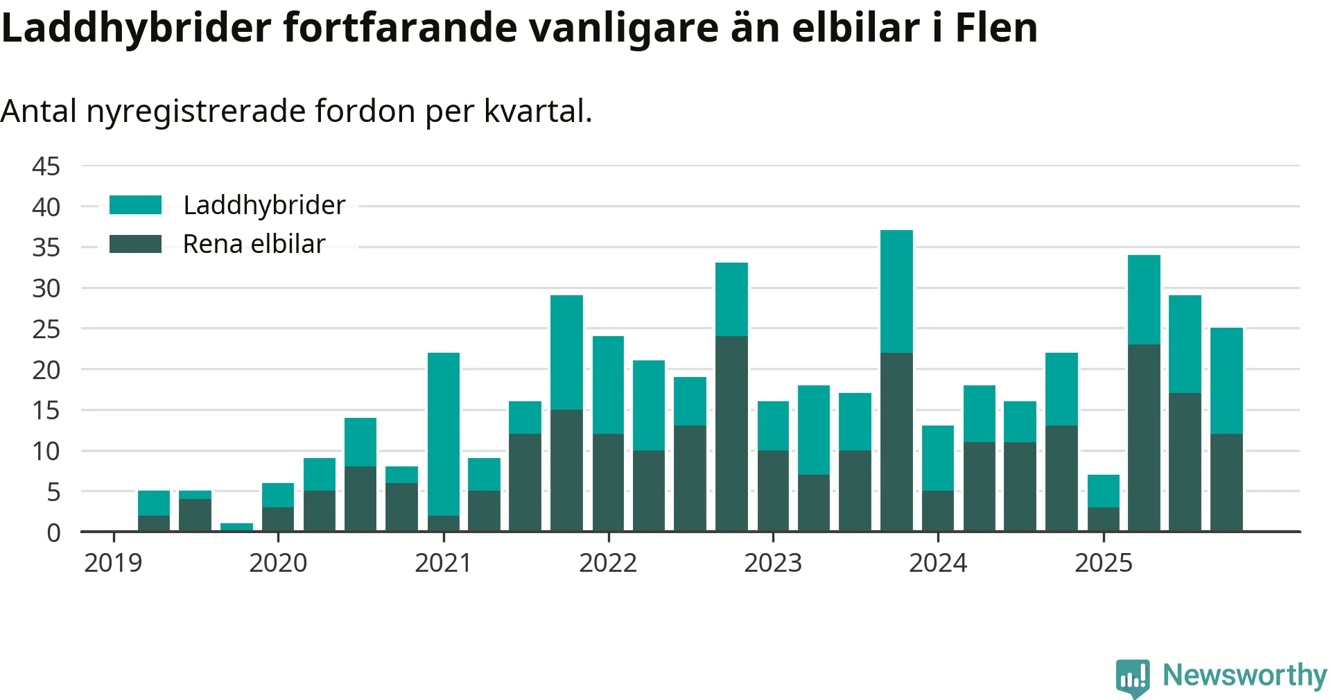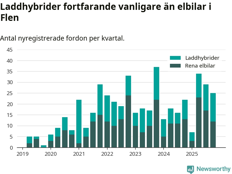 I Flen minskade andelen laddbara bilar under fjärde kvartalet jämfört med kvartalet innan (−9,4 procentenheter). Nyregistreringen peakade under tredje kvartalet 2025 då 60 procent av de nya bilarna var laddbara.