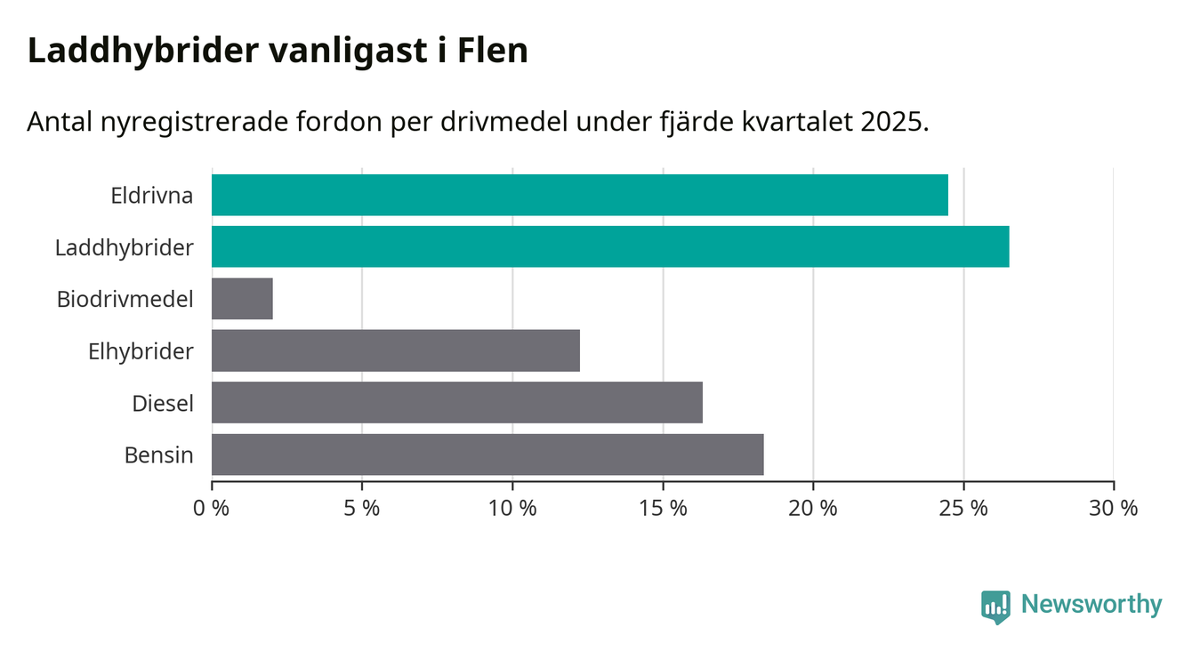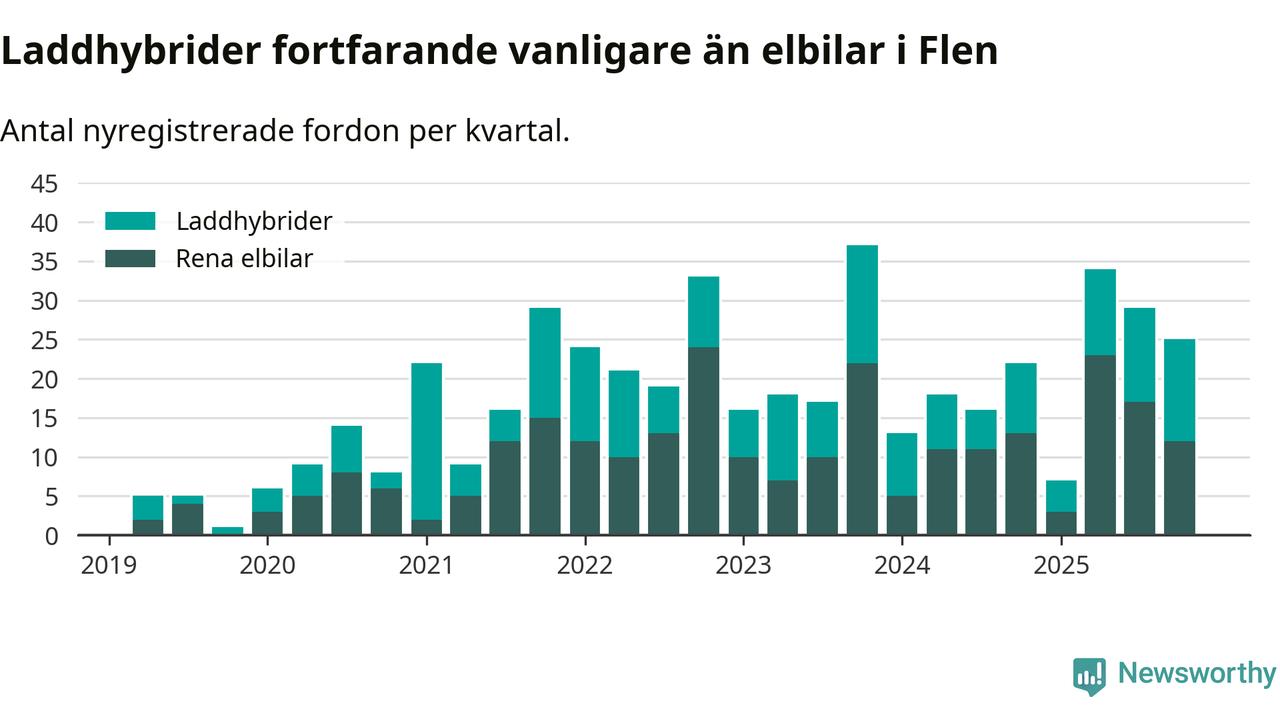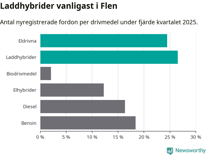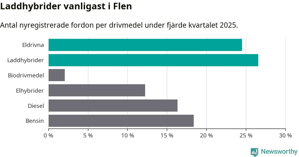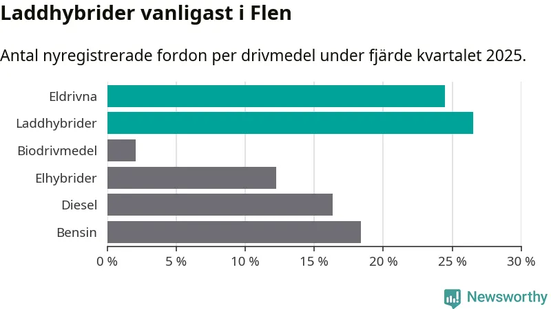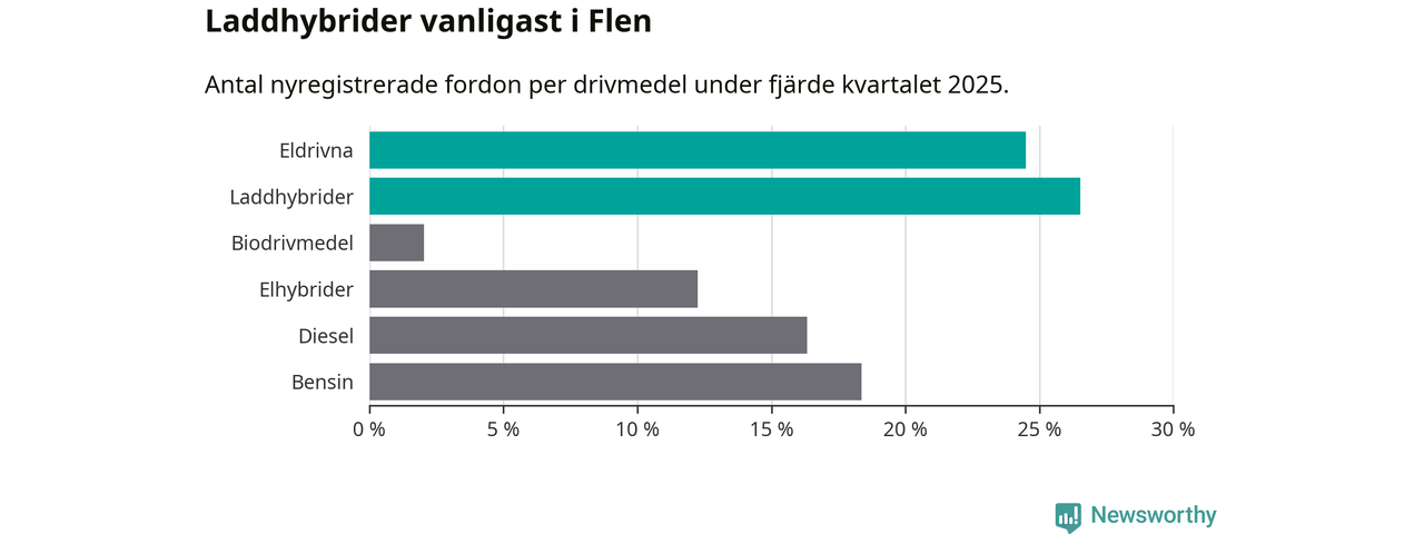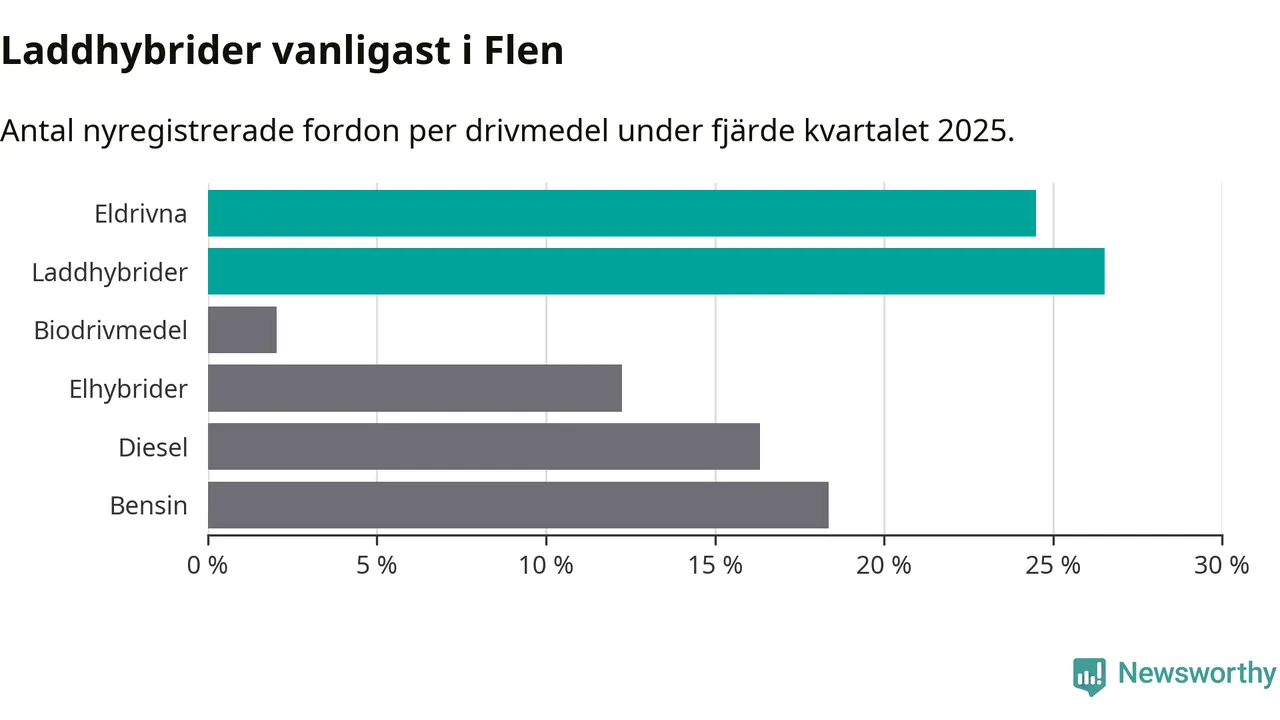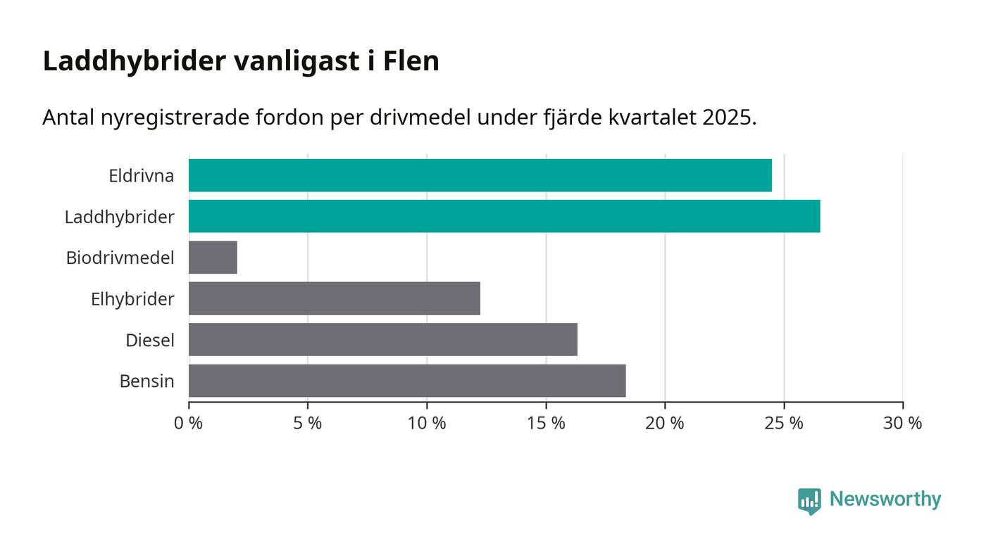 Under fjärde kvartalet 2025 var 51 procent av alla nyregistrerade personbilar i Flen laddbara (sammanlagt registrerades 49 nya bilar). Merparten av de laddbara bilarna var så kallade laddhybrider, det vill säga fordon som går att ladda och köra på el, men som även har en förbränningsmotor. 24 procent av alla nya bilar var rena elbilar.