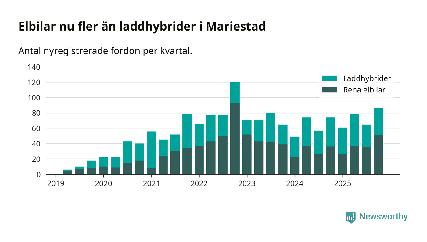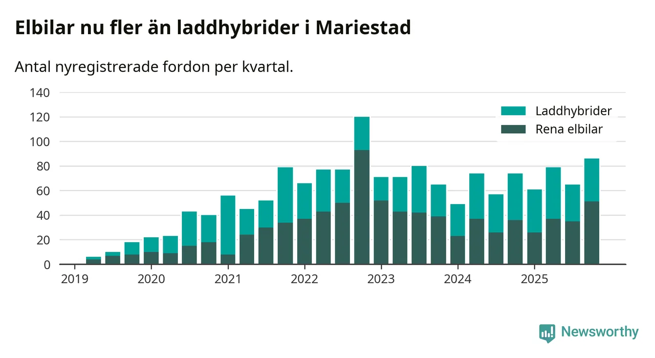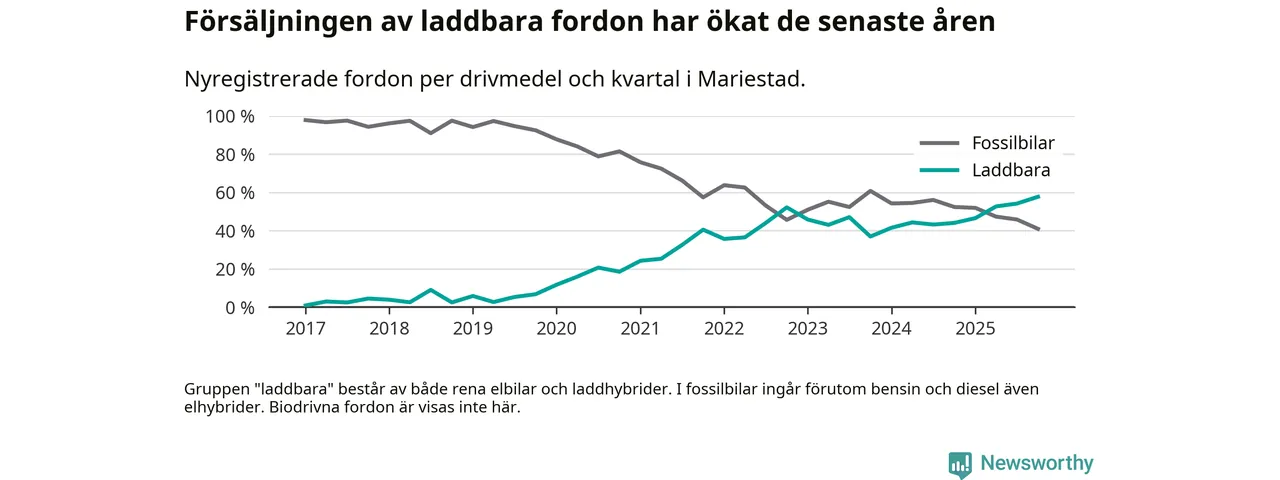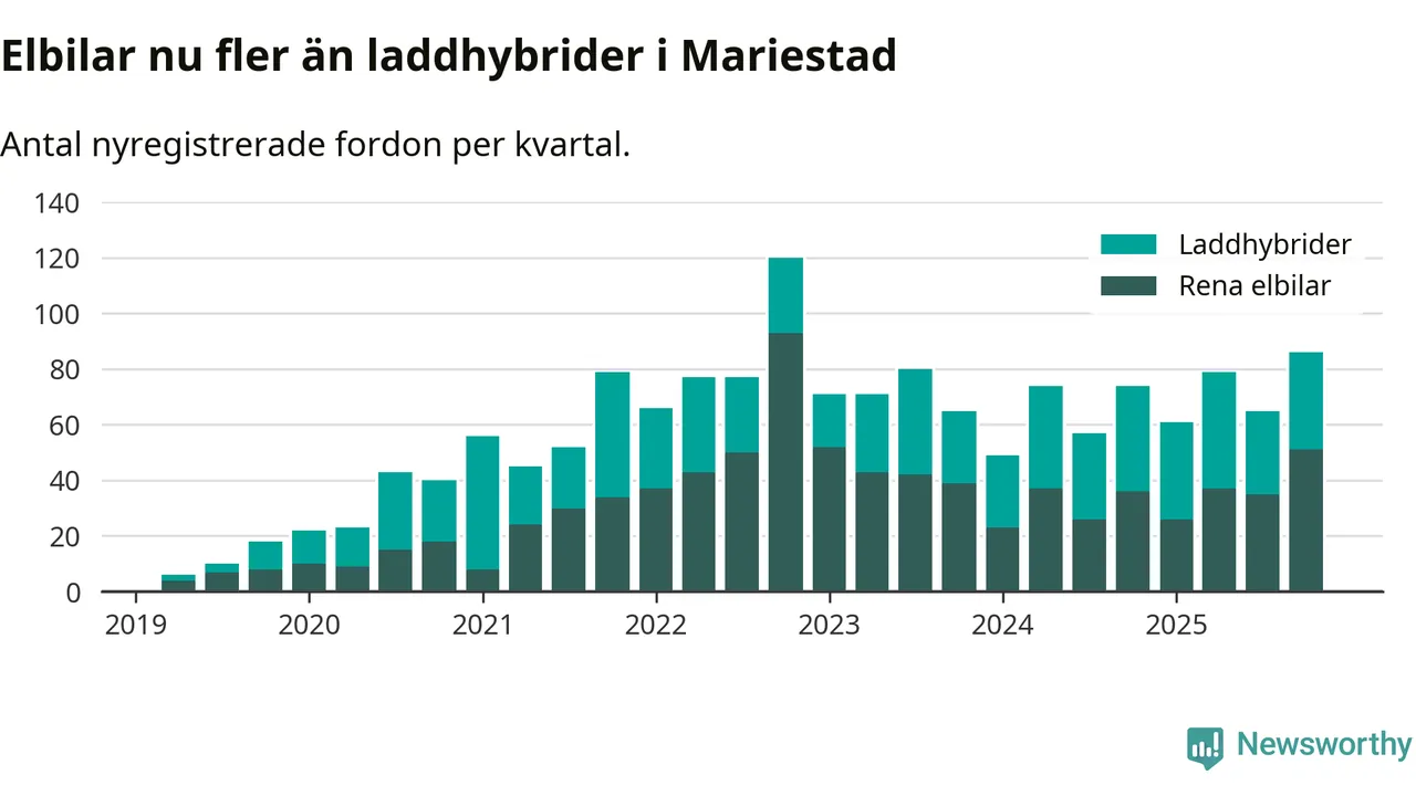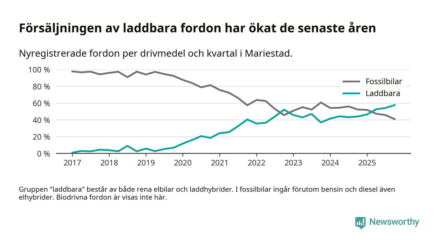 Under fjärde kvartalet 2025 var 58 procent av alla nyregistrerade personbilar i Mariestad laddbara (sammanlagt registrerades 149 nya bilar). Merparten av de laddbara bilarna var rena elbilar (34 procent av alla).