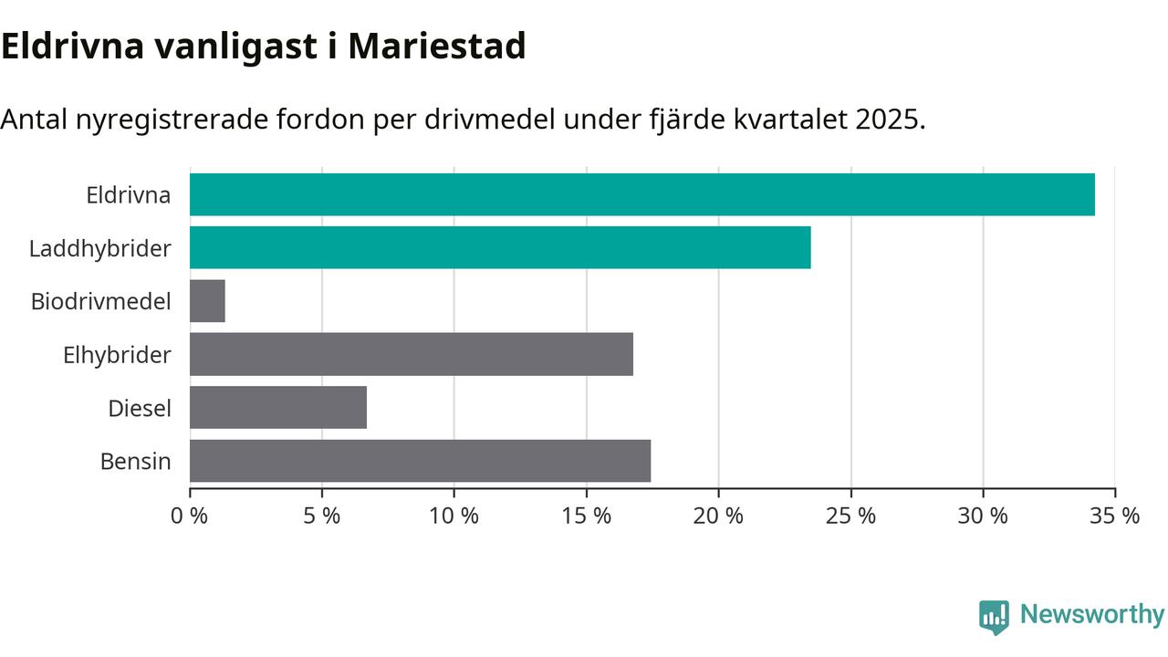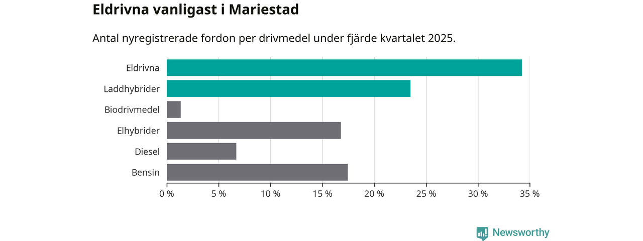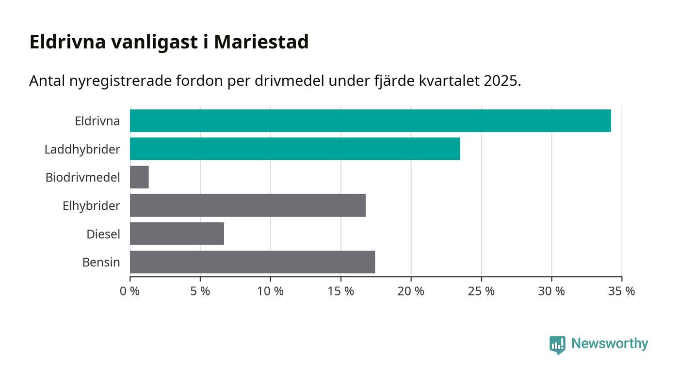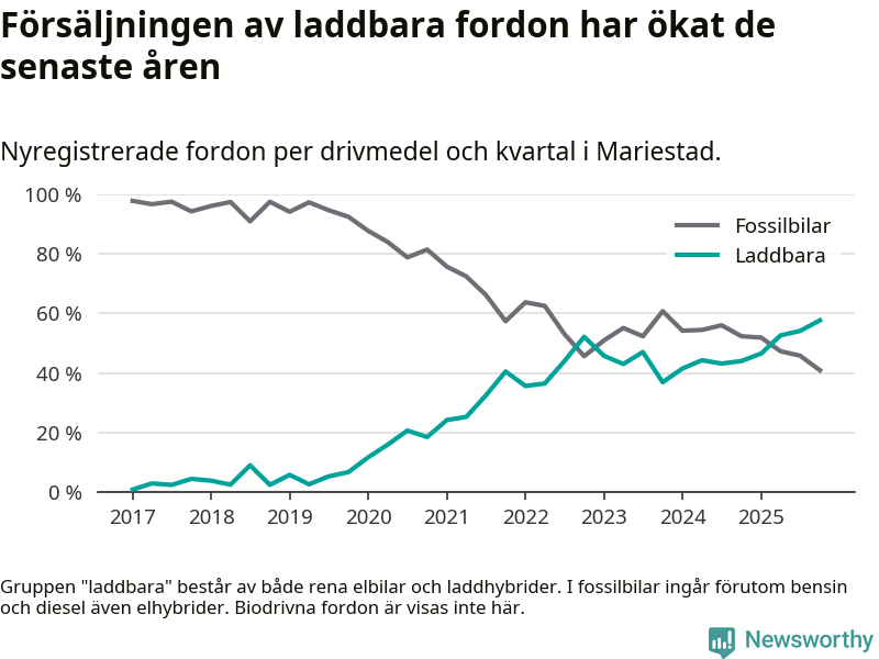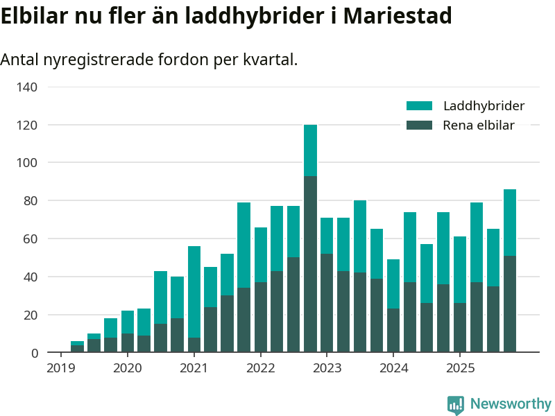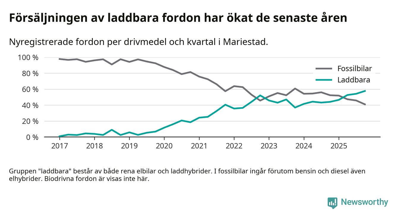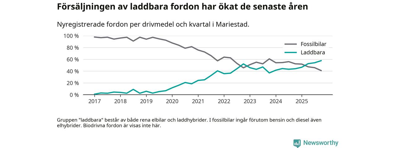 Under fjärde kvartalet 2025 var 58 procent av alla nyregistrerade personbilar i Mariestad laddbara (sammanlagt registrerades 149 nya bilar). Merparten av de laddbara bilarna var rena elbilar (34 procent av alla).