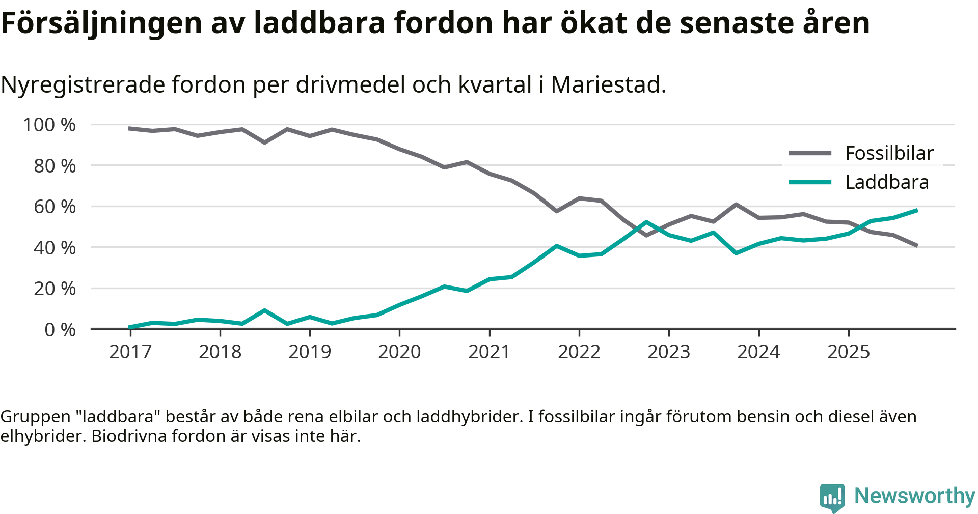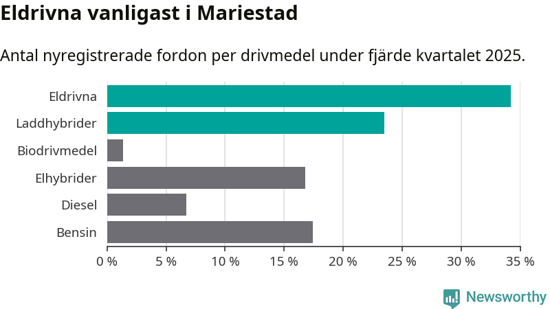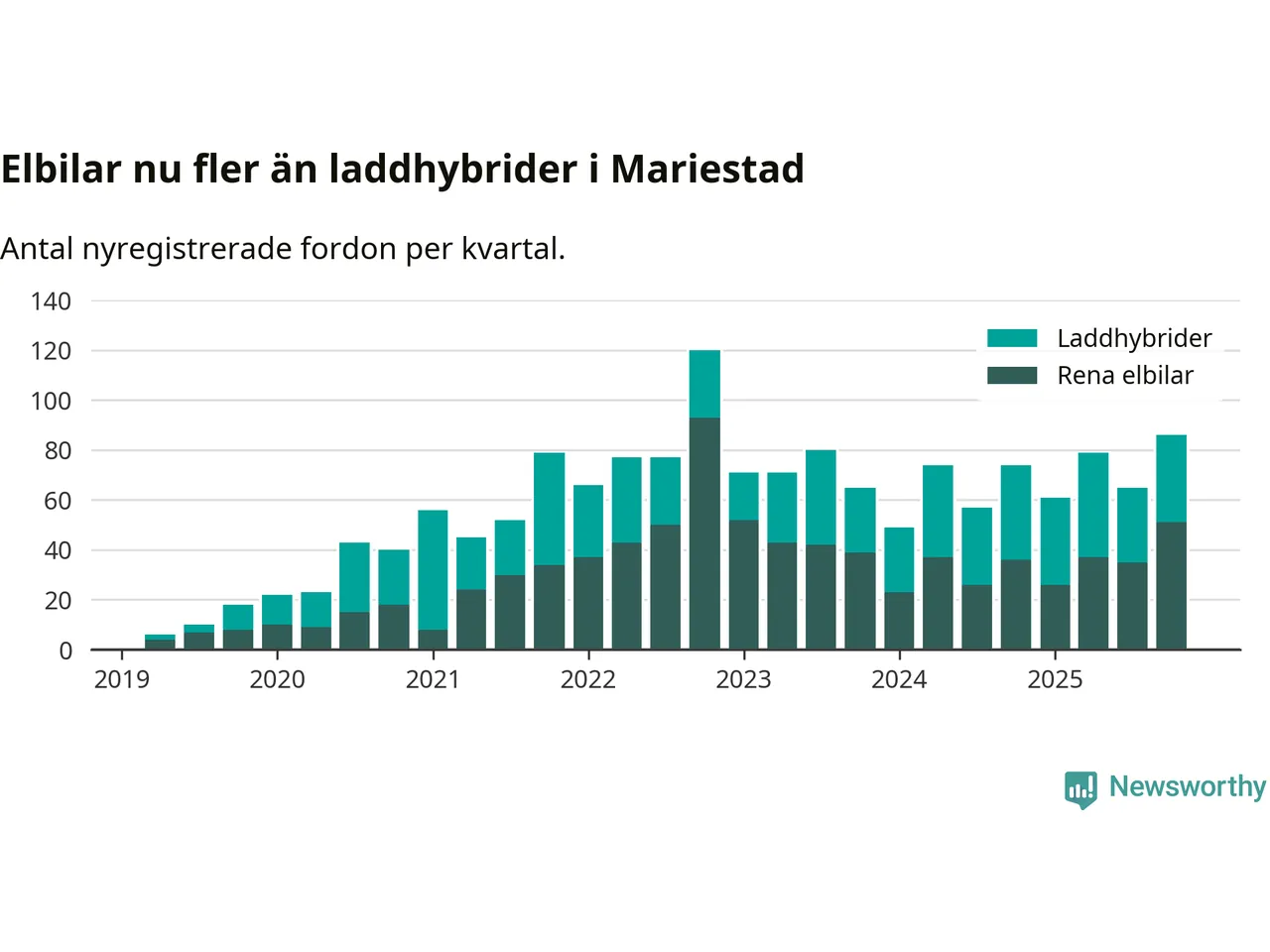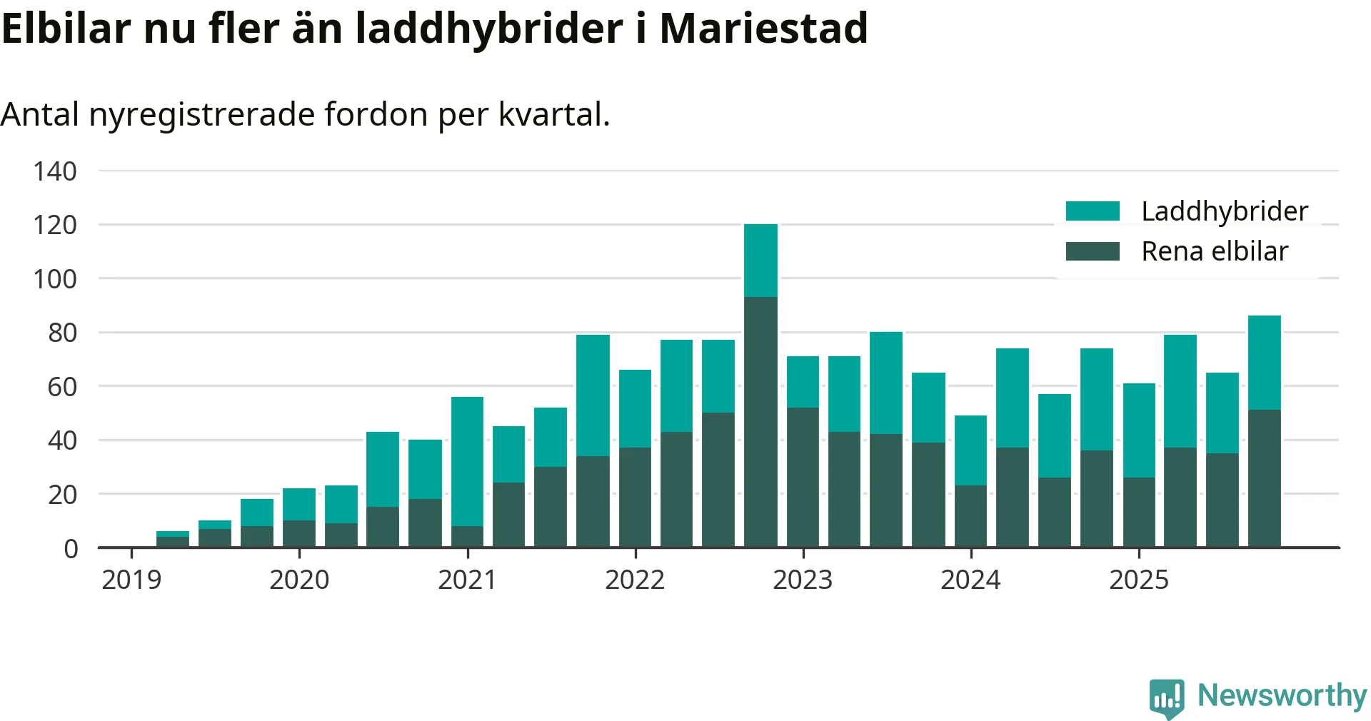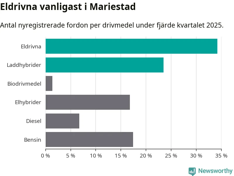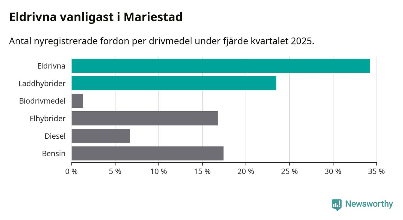 Under fjärde kvartalet 2025 var 58 procent av alla nyregistrerade personbilar i Mariestad laddbara (sammanlagt registrerades 149 nya bilar). Merparten av de laddbara bilarna var rena elbilar (34 procent av alla).