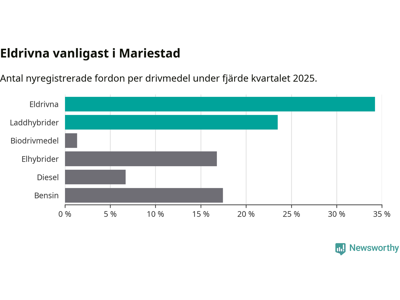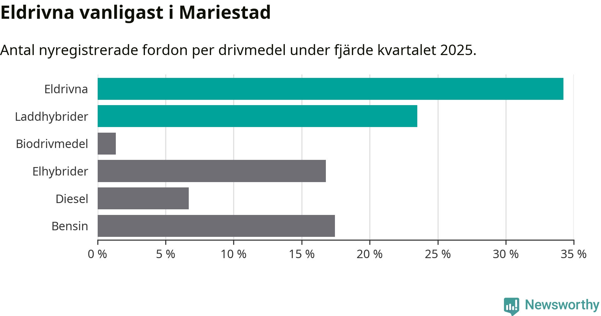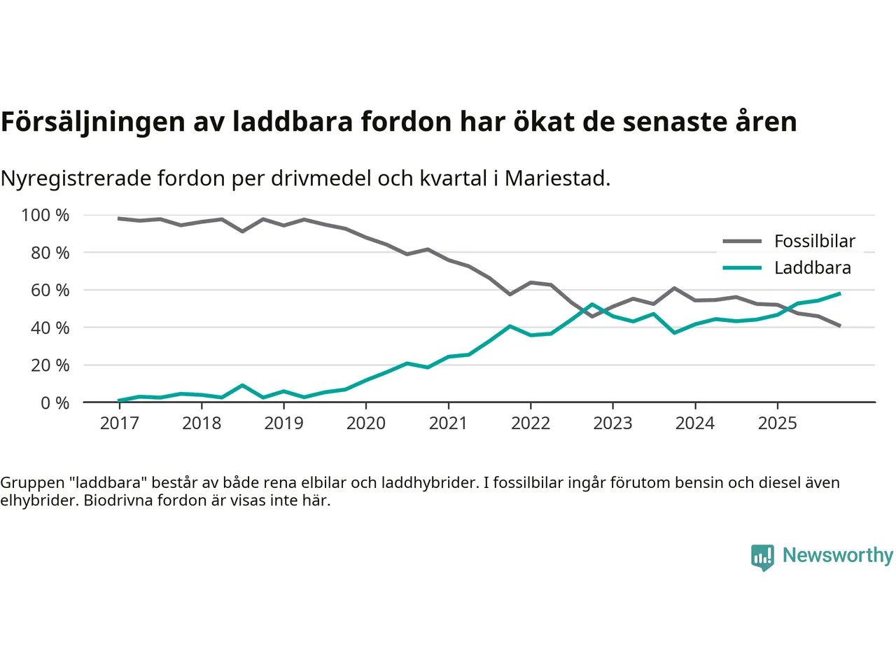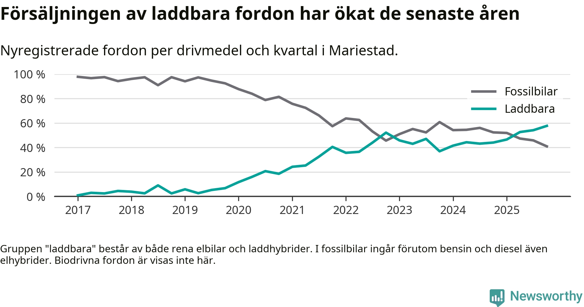 Under fjärde kvartalet 2025 var 58 procent av alla nyregistrerade personbilar i Mariestad laddbara (sammanlagt registrerades 149 nya bilar). Merparten av de laddbara bilarna var rena elbilar (34 procent av alla).