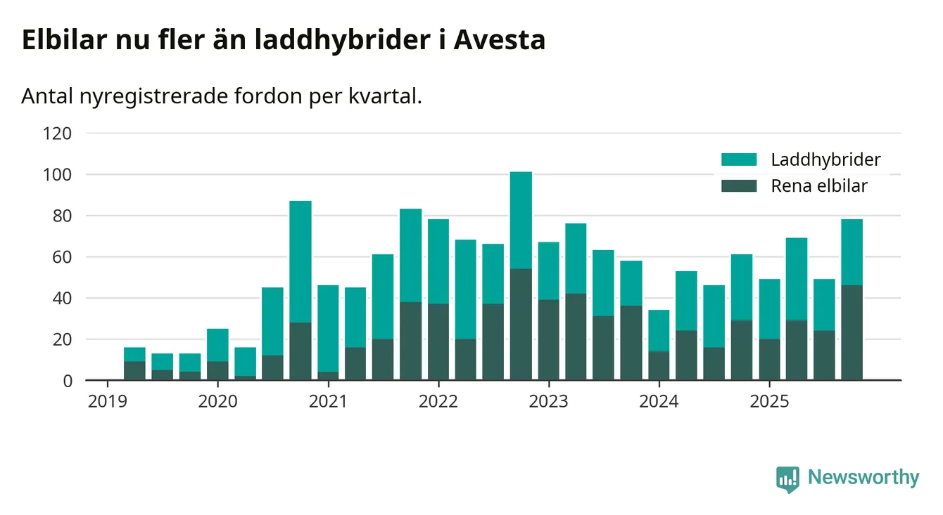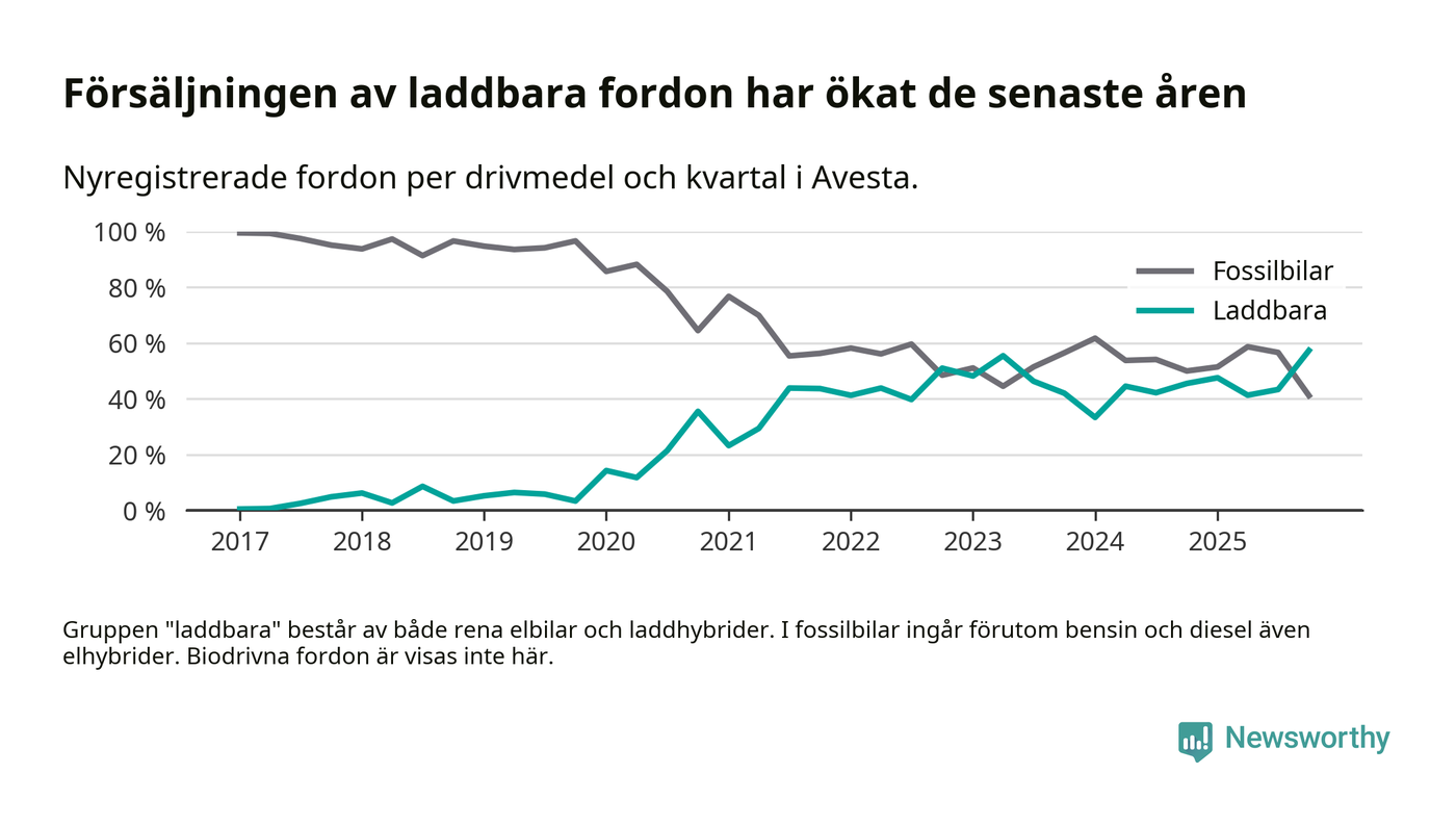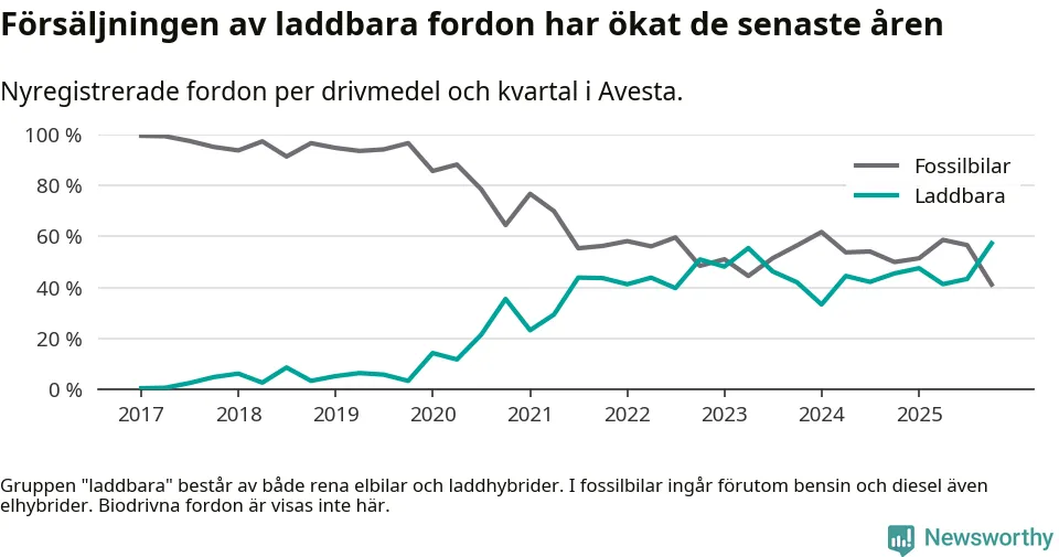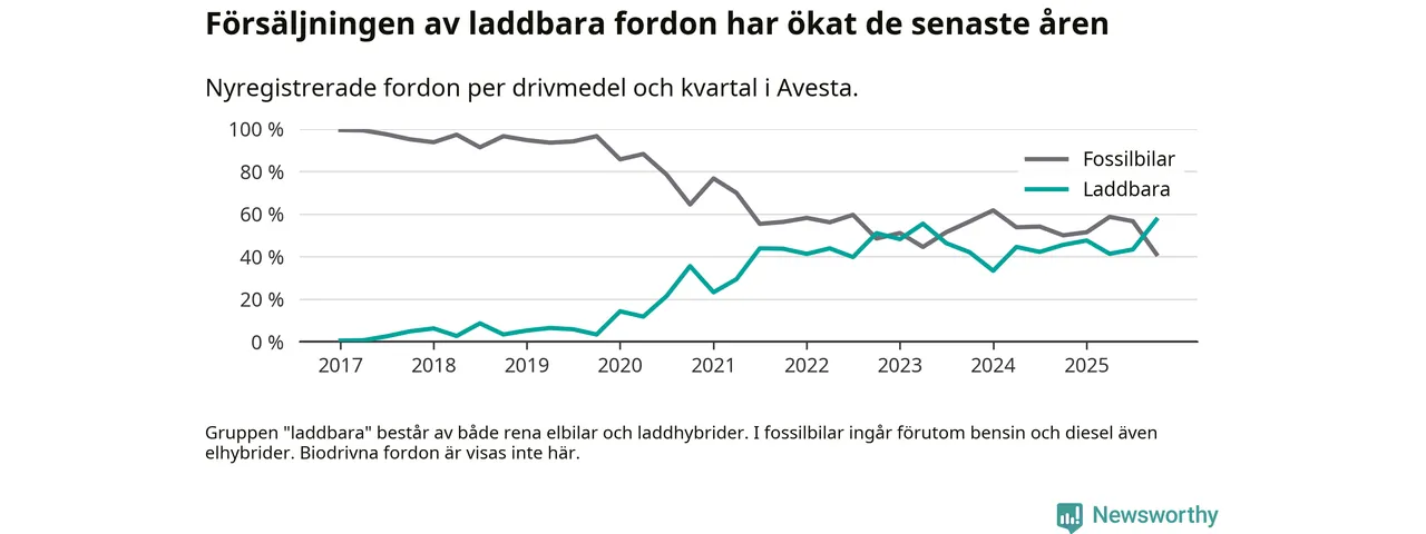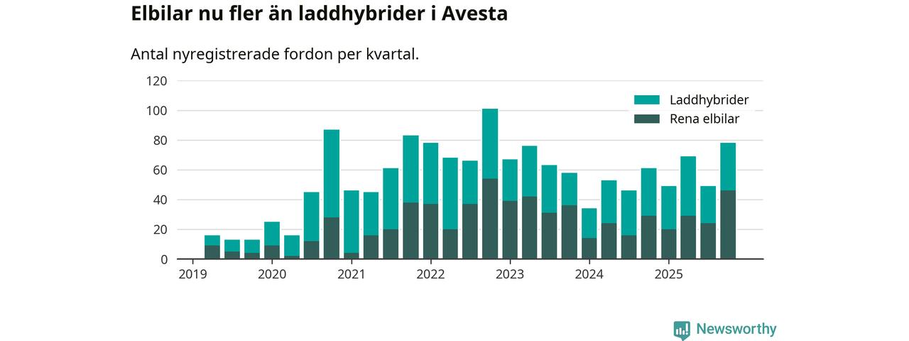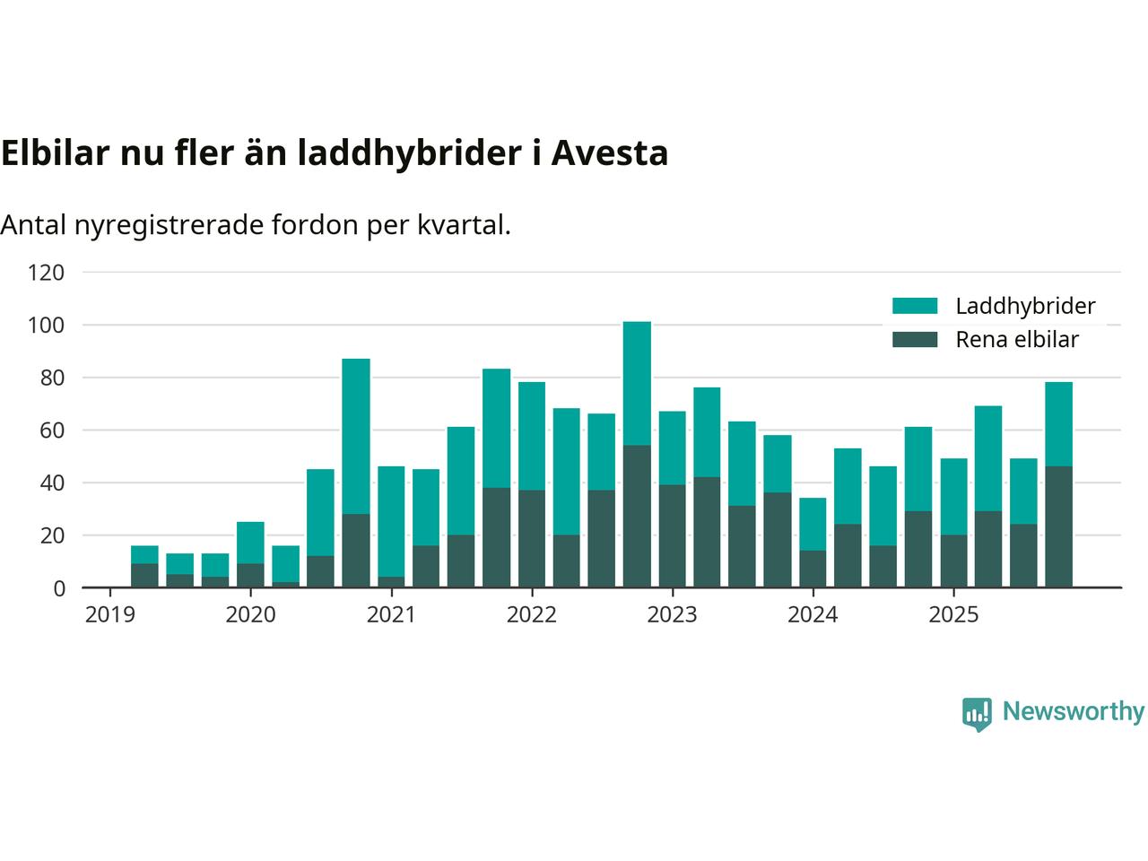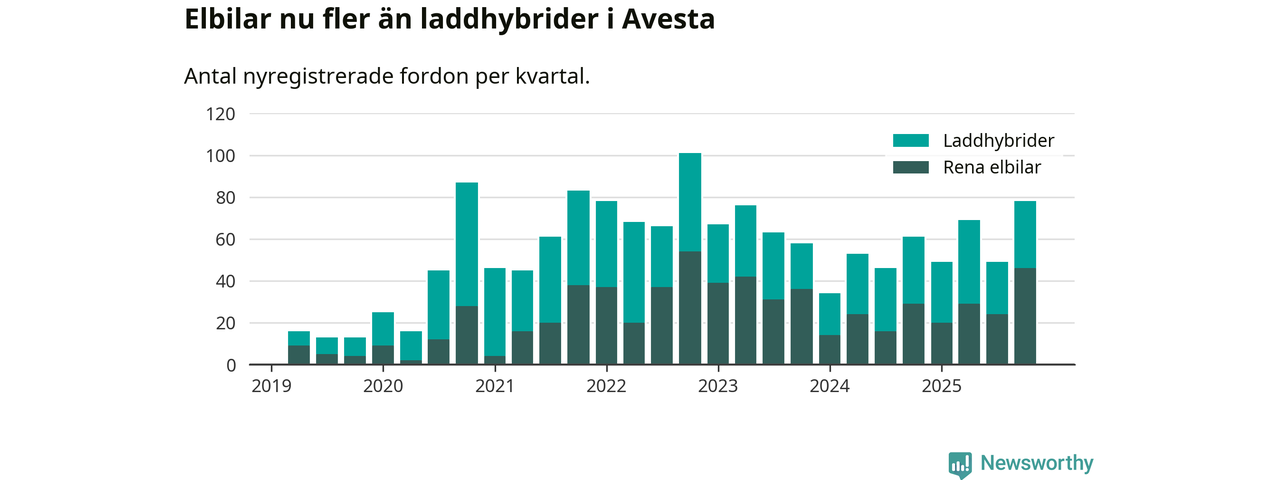 Under fjärde kvartalet 2025 var 57 procent av alla nyregistrerade personbilar i Avesta laddbara (sammanlagt registrerades 136 nya bilar). Merparten av de laddbara bilarna var rena elbilar (34 procent av alla).