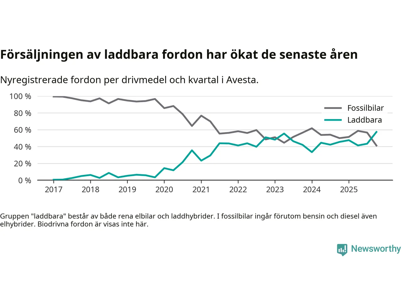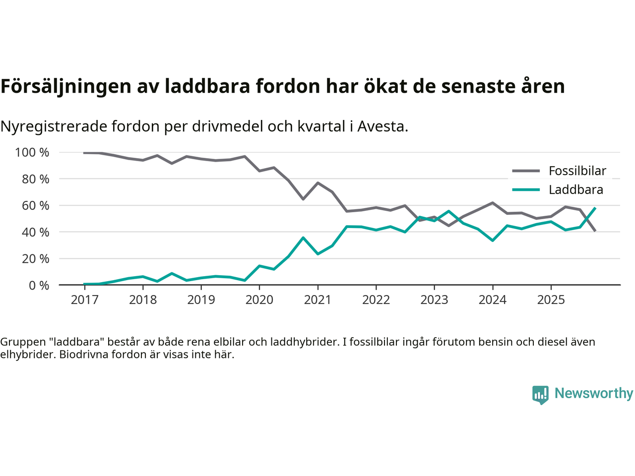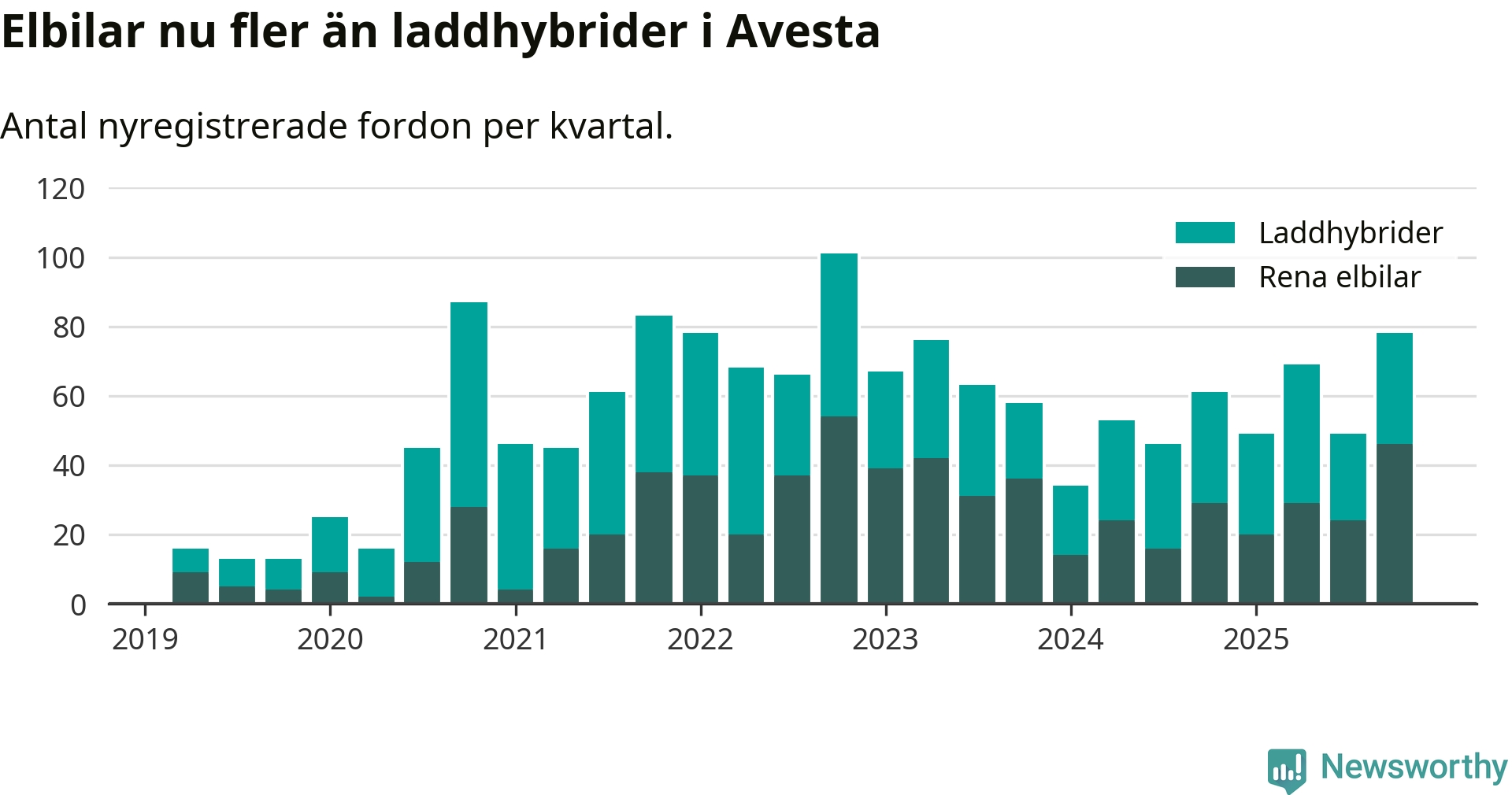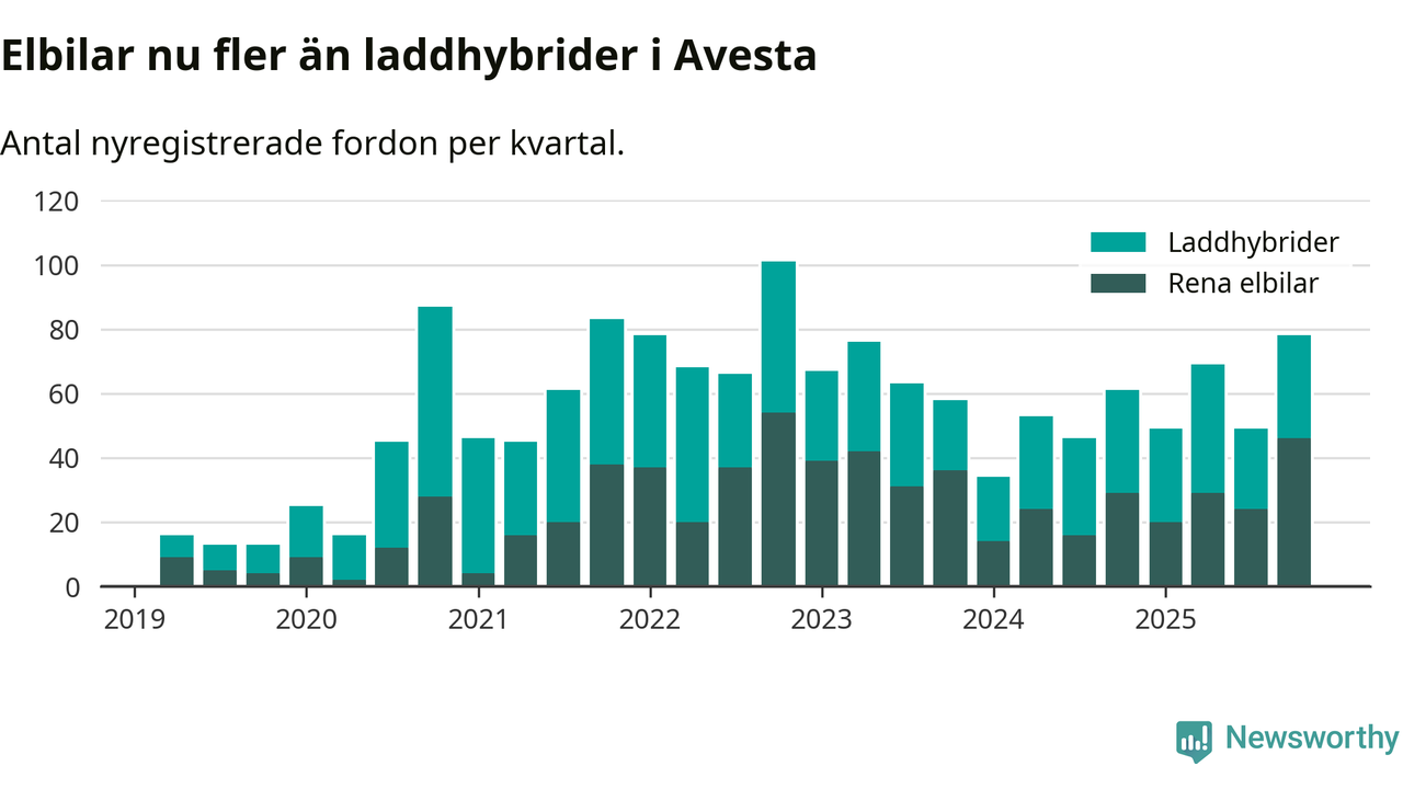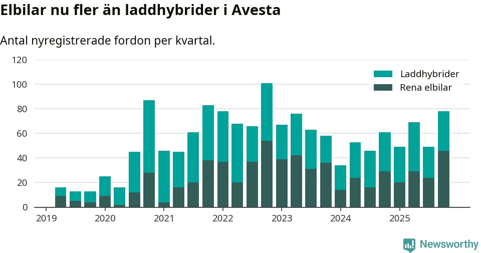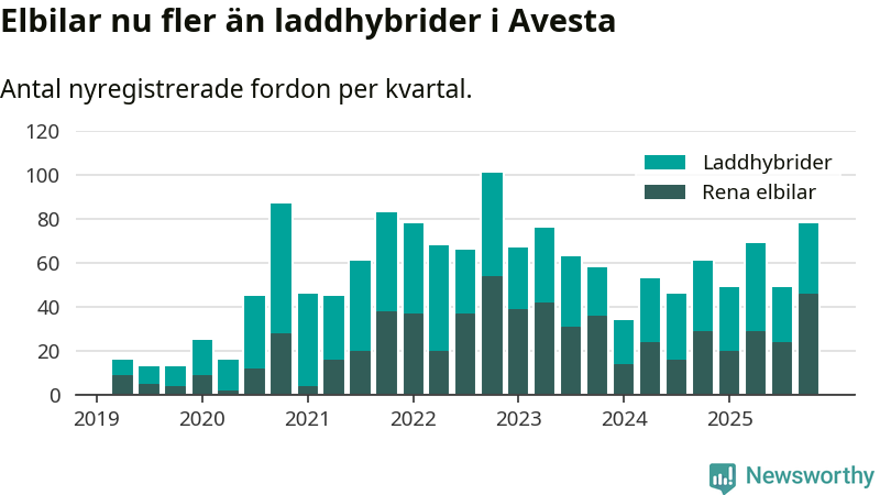 Under fjärde kvartalet 2025 var 57 procent av alla nyregistrerade personbilar i Avesta laddbara (sammanlagt registrerades 136 nya bilar). Merparten av de laddbara bilarna var rena elbilar (34 procent av alla).
