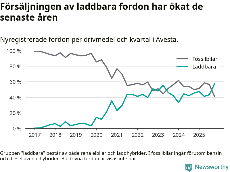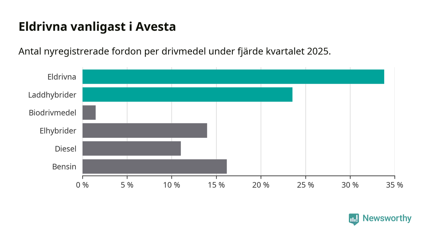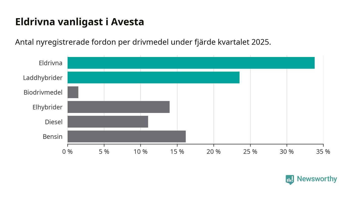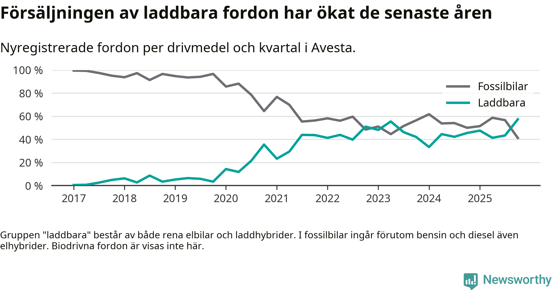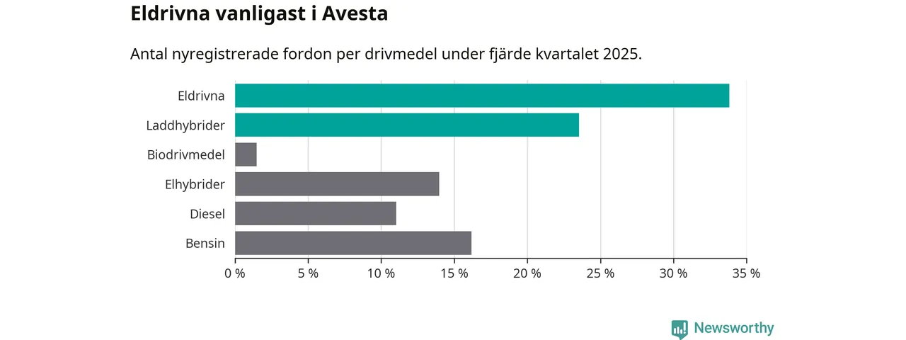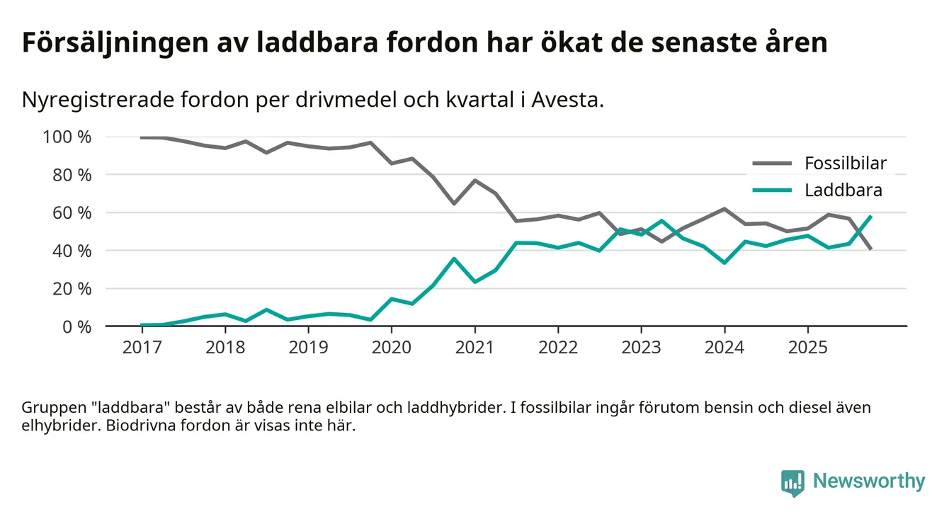 Under fjärde kvartalet 2025 var 57 procent av alla nyregistrerade personbilar i Avesta laddbara (sammanlagt registrerades 136 nya bilar). Merparten av de laddbara bilarna var rena elbilar (34 procent av alla).