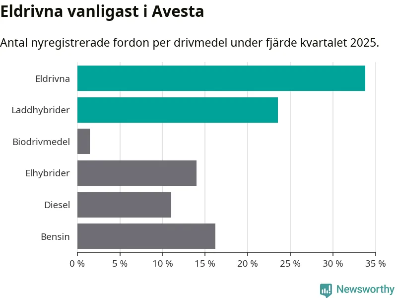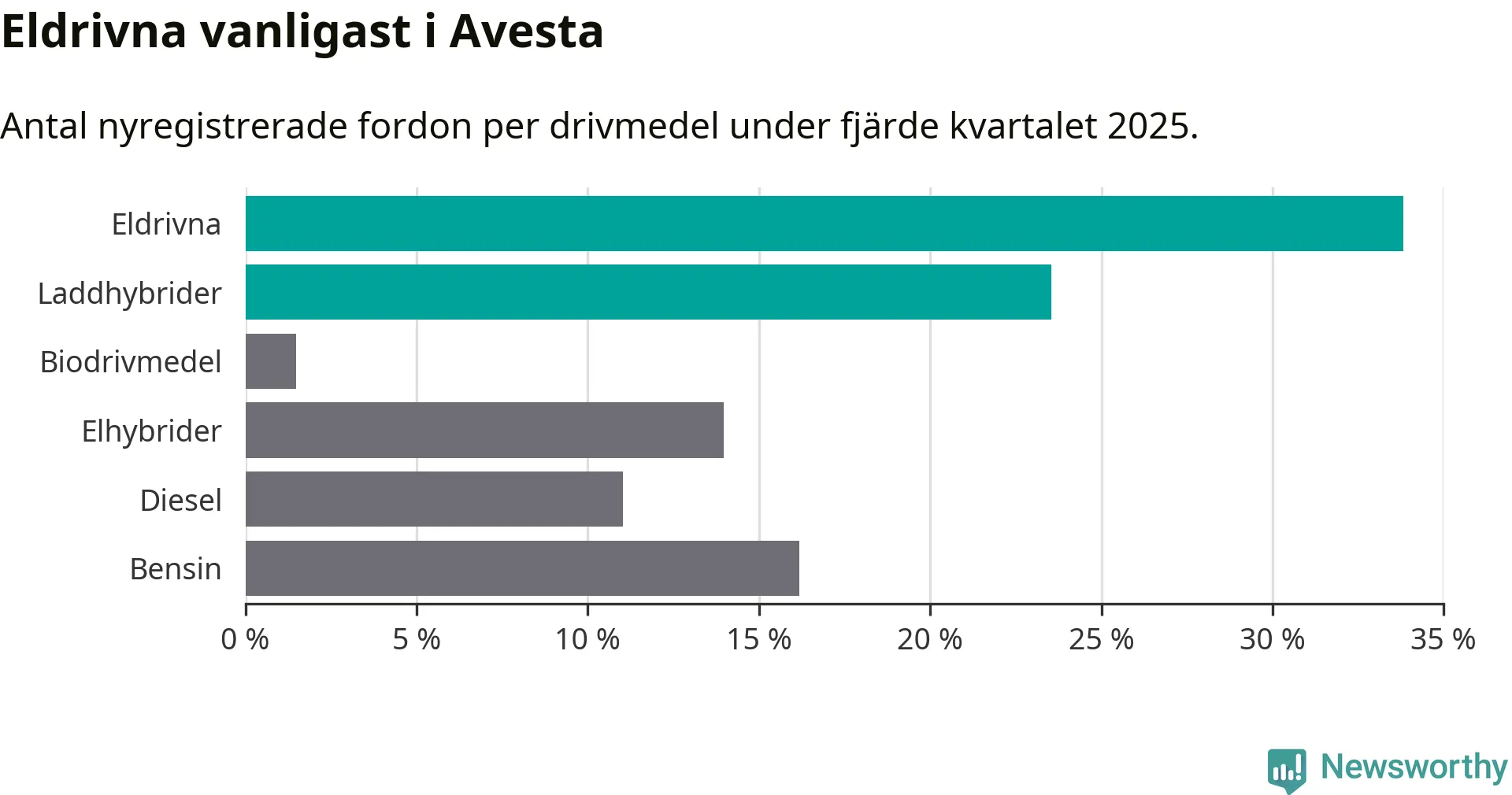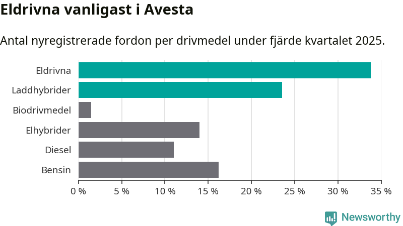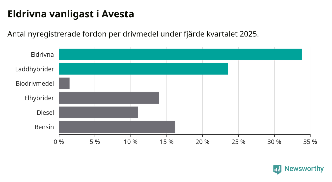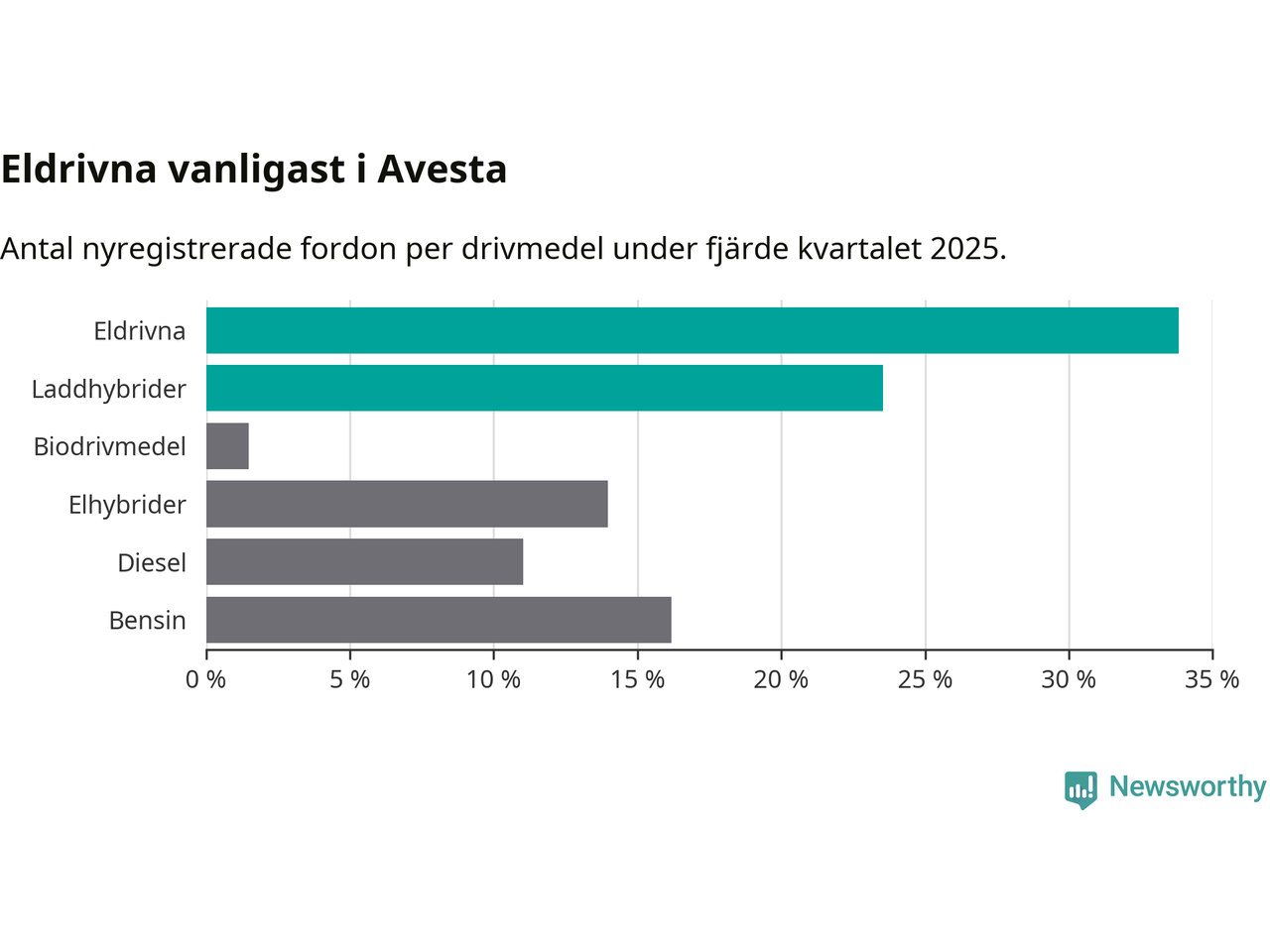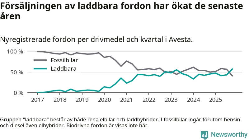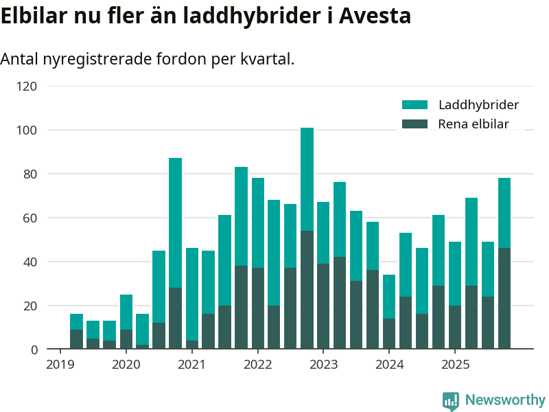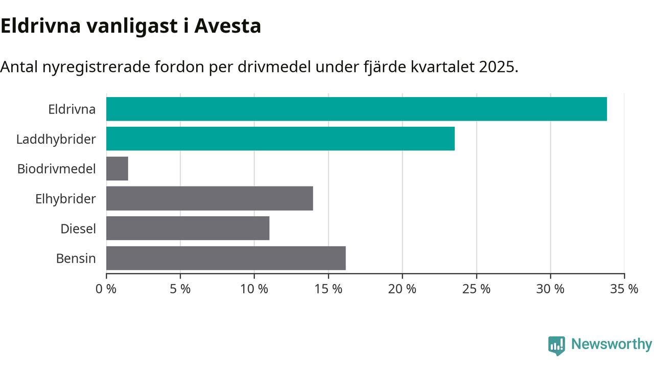 Under fjärde kvartalet 2025 var 57 procent av alla nyregistrerade personbilar i Avesta laddbara (sammanlagt registrerades 136 nya bilar). Merparten av de laddbara bilarna var rena elbilar (34 procent av alla).