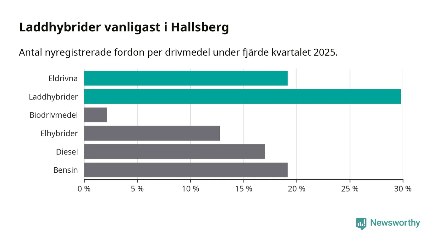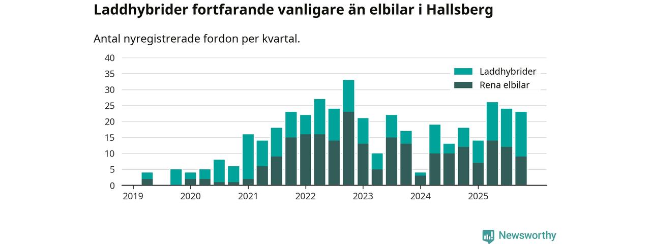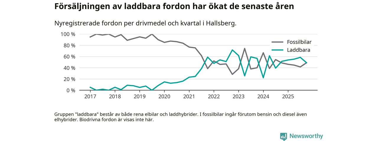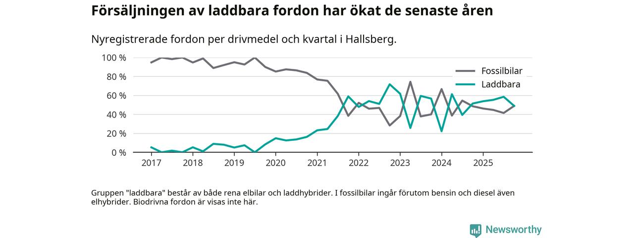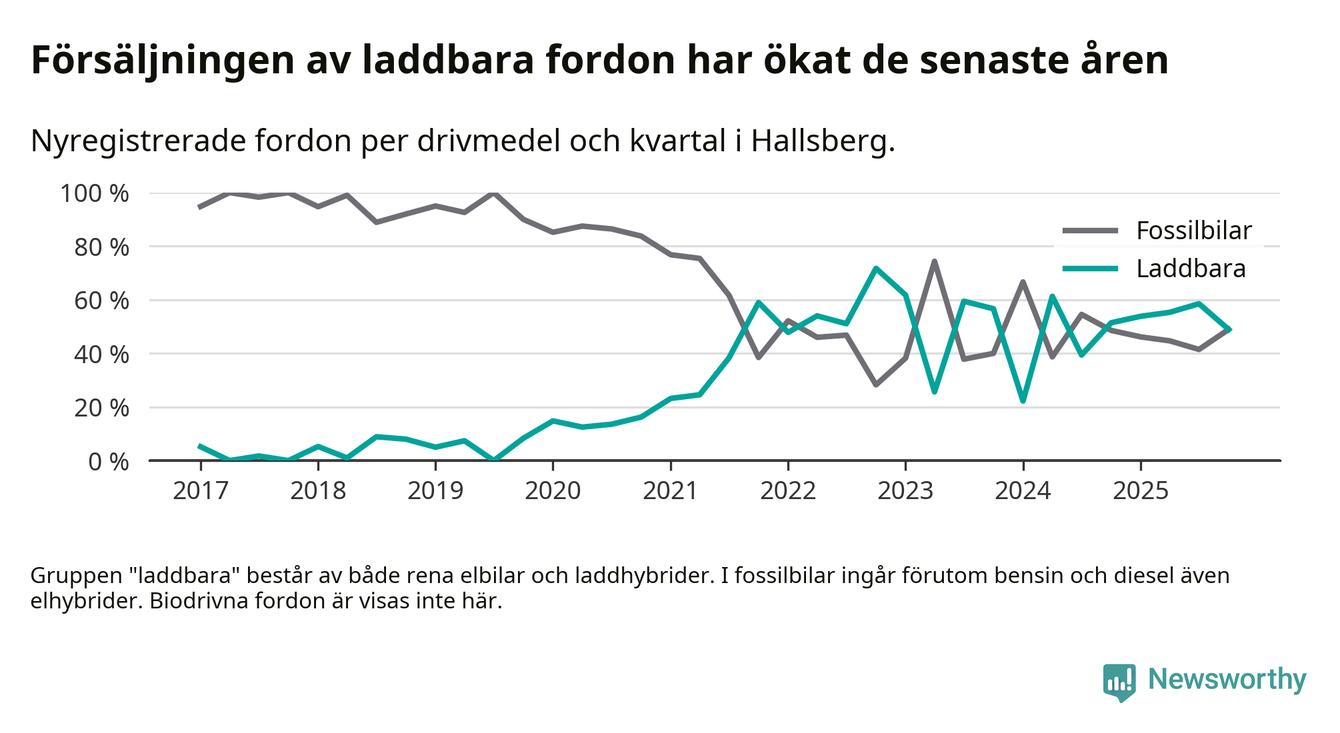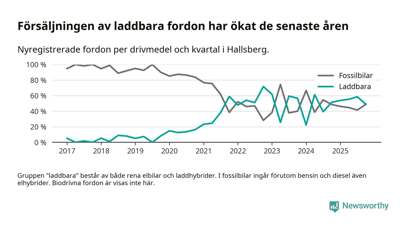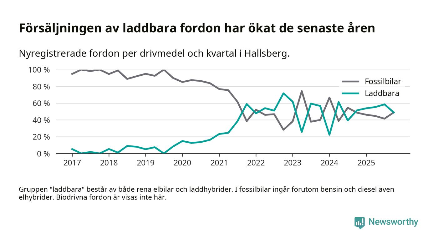 Under fjärde kvartalet 2025 var 49 procent av alla nyregistrerade personbilar i Hallsberg laddbara (sammanlagt registrerades 47 nya bilar). Merparten av de laddbara bilarna var så kallade laddhybrider, det vill säga fordon som går att ladda och köra på el, men som även har en förbränningsmotor. 19 procent av alla nya bilar var rena elbilar.