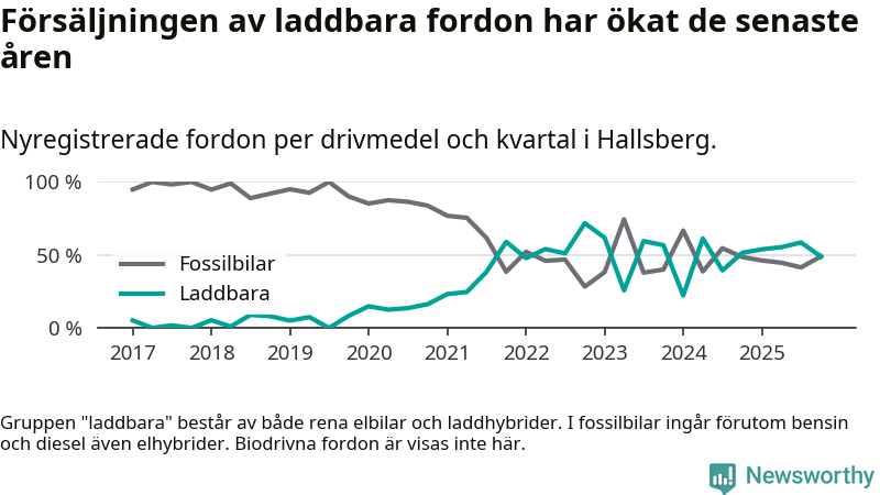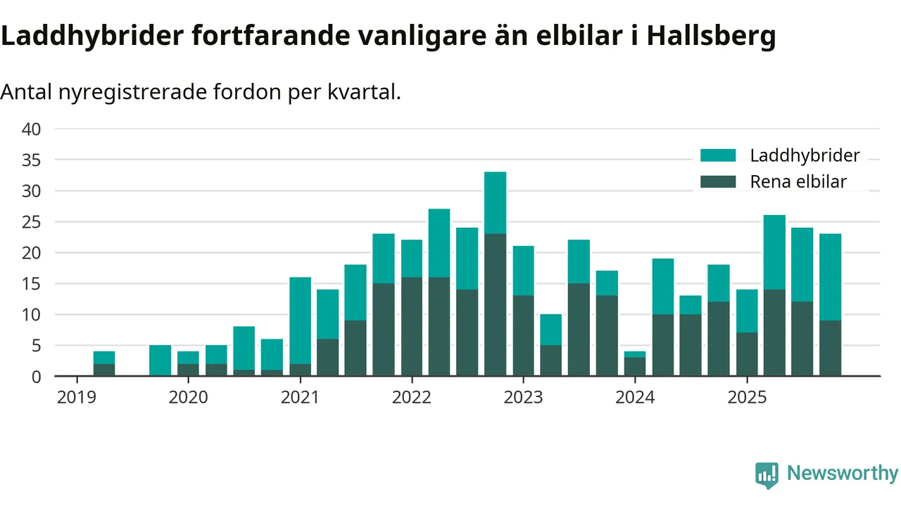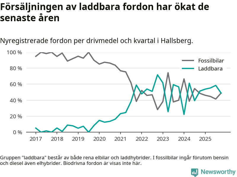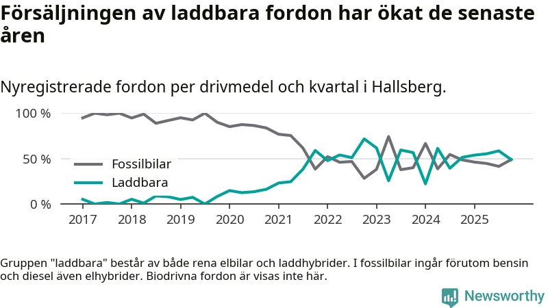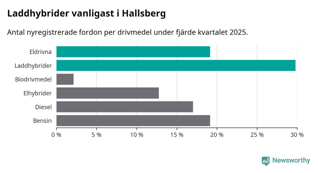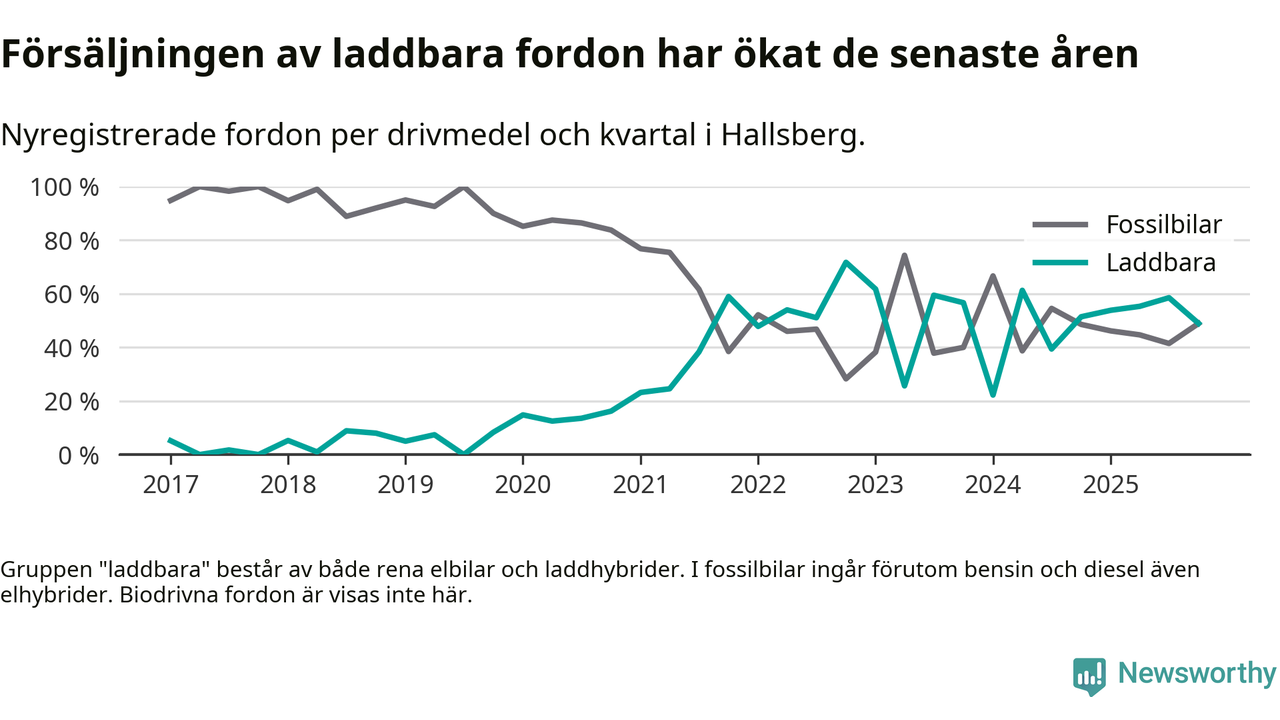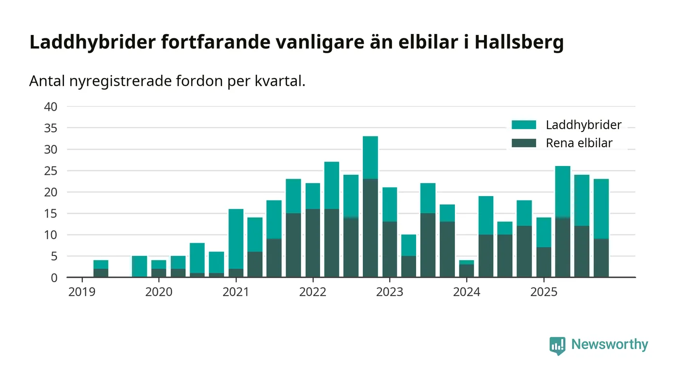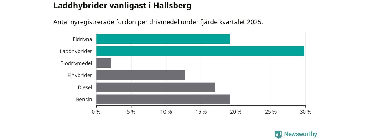Under fjärde kvartalet 2025 var 49 procent av alla nyregistrerade personbilar i Hallsberg laddbara (sammanlagt registrerades 47 nya bilar). Merparten av de laddbara bilarna var så kallade laddhybrider, det vill säga fordon som går att ladda och köra på el, men som även har en förbränningsmotor. 19 procent av alla nya bilar var rena elbilar.