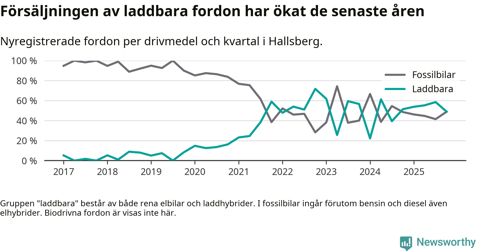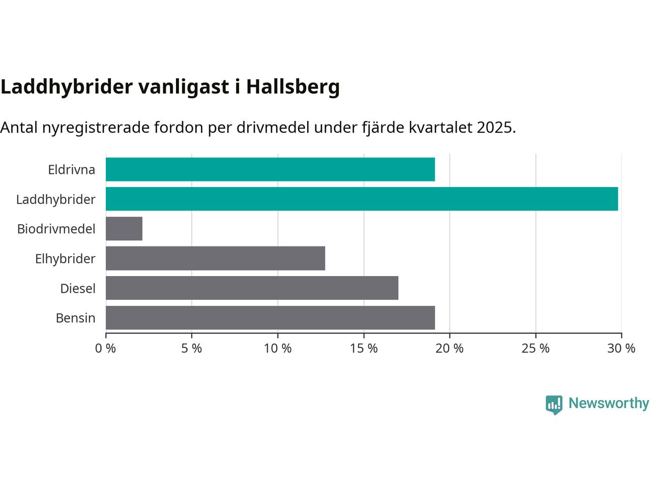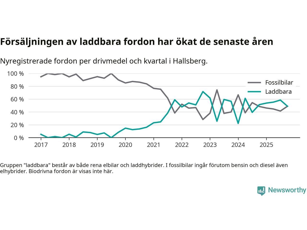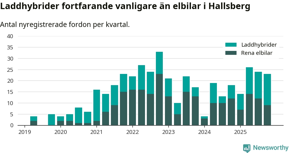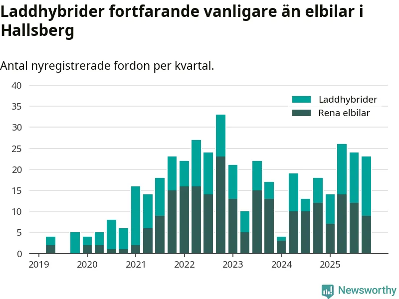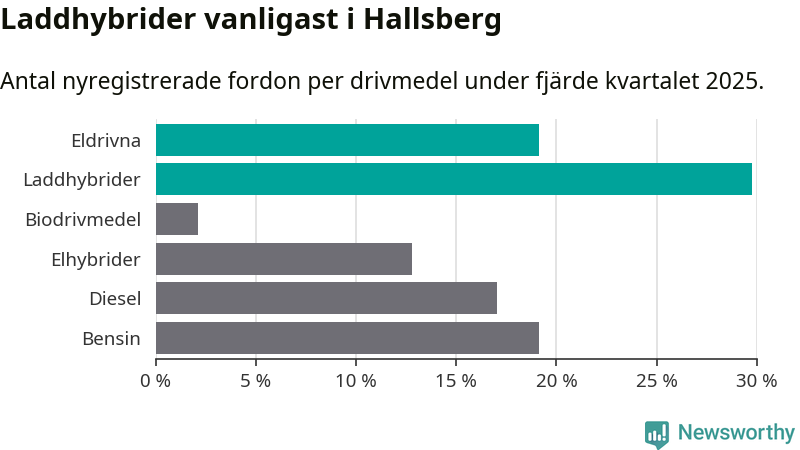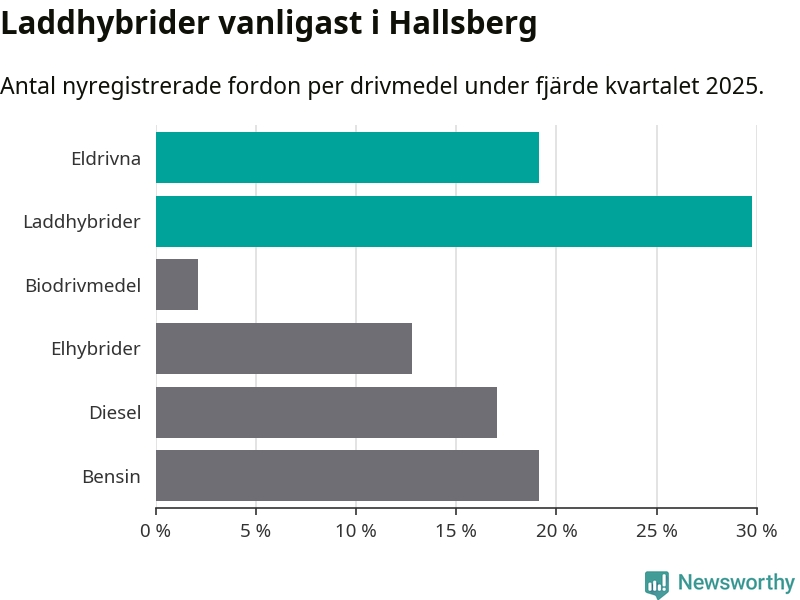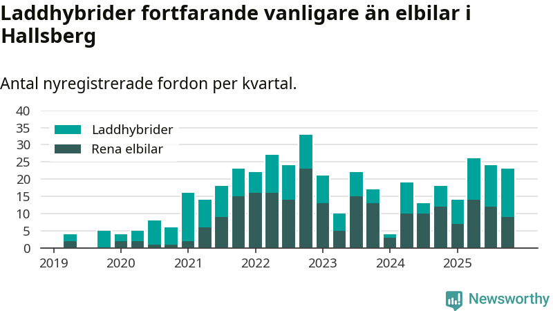 Under fjärde kvartalet 2025 var 49 procent av alla nyregistrerade personbilar i Hallsberg laddbara (sammanlagt registrerades 47 nya bilar). Merparten av de laddbara bilarna var så kallade laddhybrider, det vill säga fordon som går att ladda och köra på el, men som även har en förbränningsmotor. 19 procent av alla nya bilar var rena elbilar.