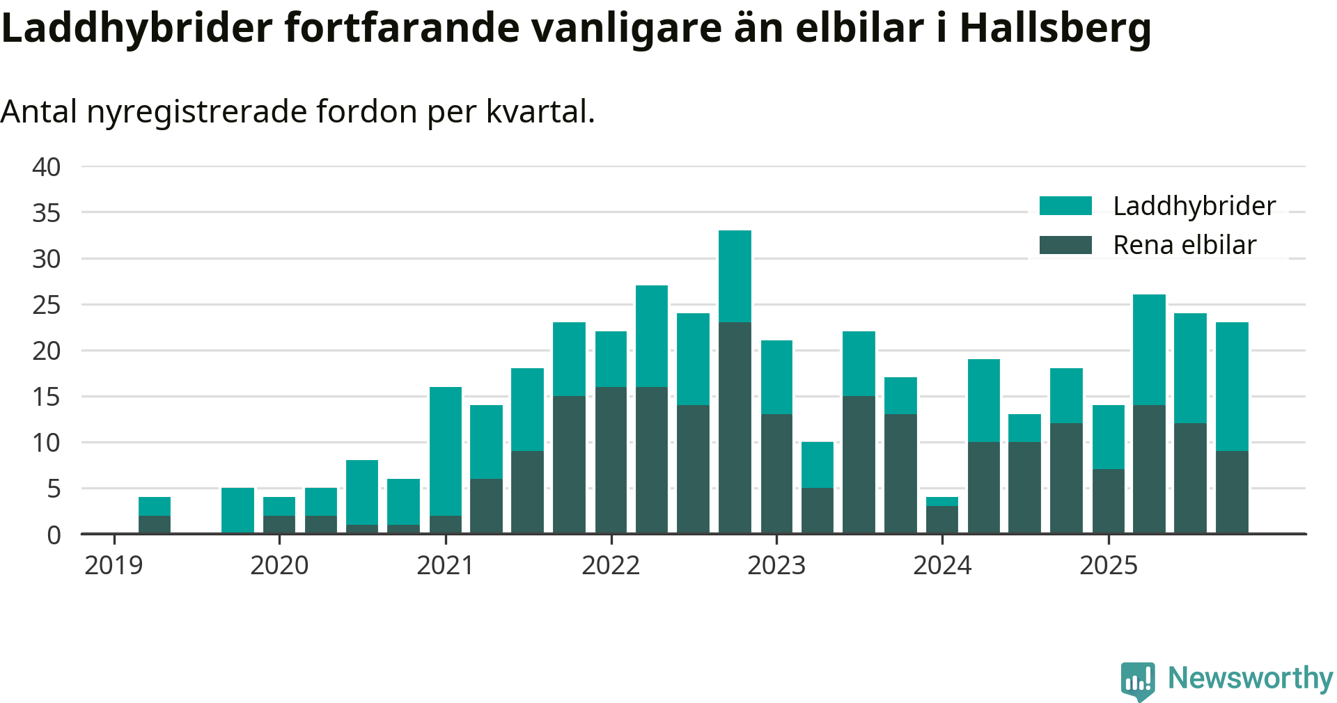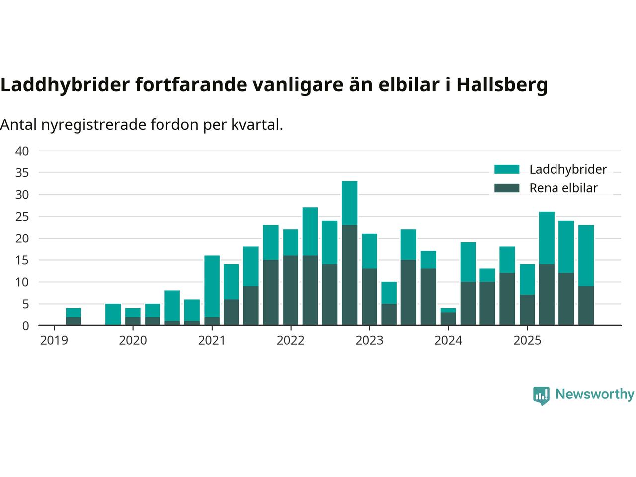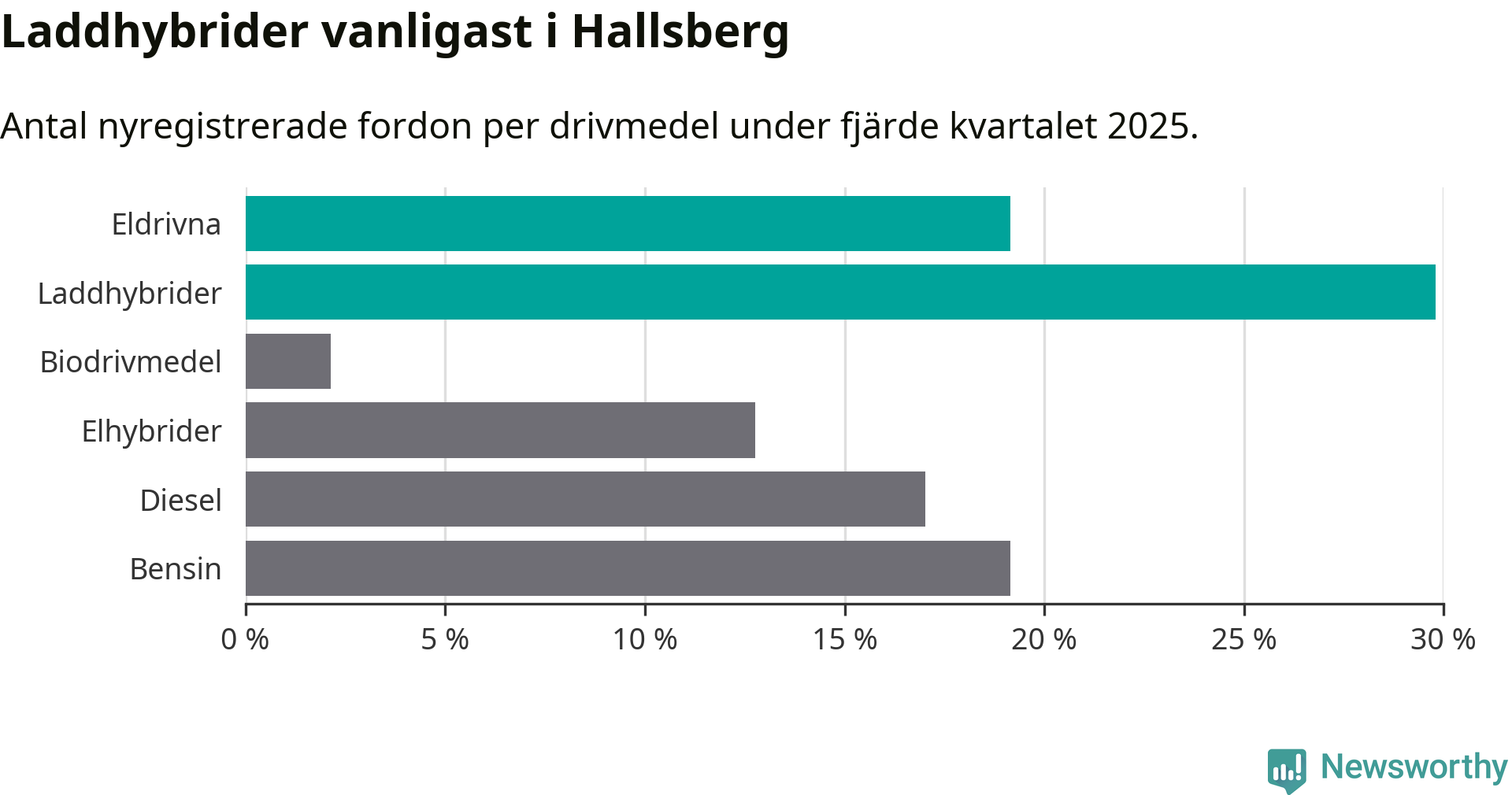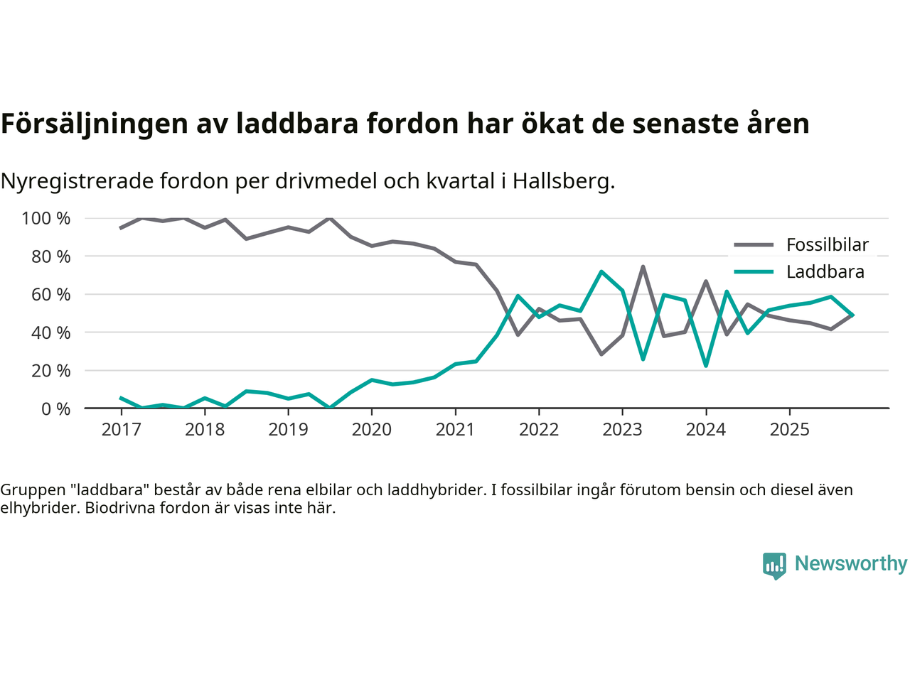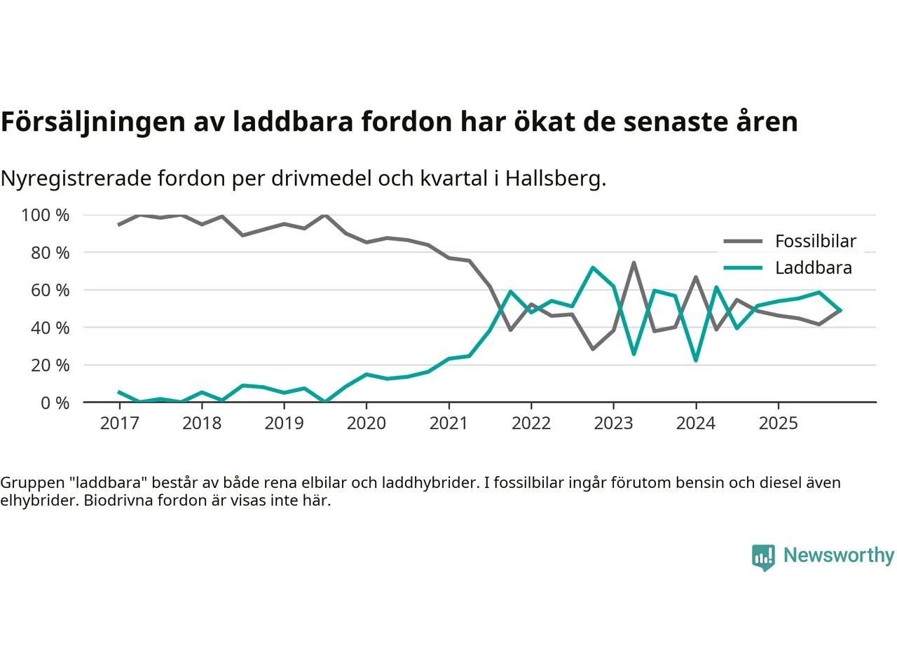 Under fjärde kvartalet 2025 var 49 procent av alla nyregistrerade personbilar i Hallsberg laddbara (sammanlagt registrerades 47 nya bilar). Merparten av de laddbara bilarna var så kallade laddhybrider, det vill säga fordon som går att ladda och köra på el, men som även har en förbränningsmotor. 19 procent av alla nya bilar var rena elbilar.