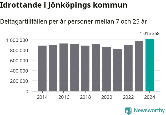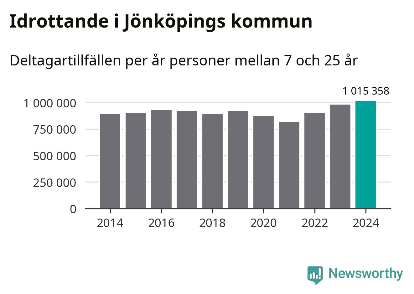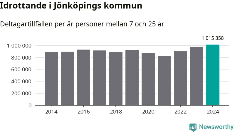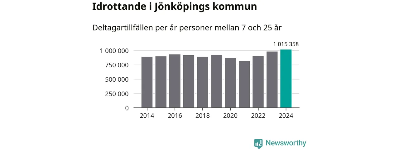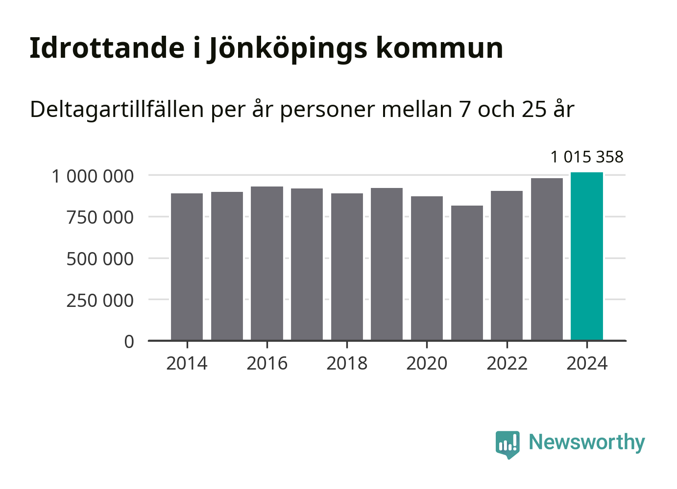 För tredje året i rad ökade aktiviteten inom ungdomsidrotten i Jönköpings kommun under 2024. Det visar nya siffror om utbetalt Lok-stöd, som delas ut till föreningar anslutna till Riksidrottsförbundet specialidrottsförbund. Stödet riktar sig till föreningar som bedriver verksamhet för deltagare i åldern 7-25 år. Under året rapporterade föreningarna i Jönköpings kommun drygt 1 015 000 deltagartillfällen, vilket är en ökning med fyra procent jämfört med 2023, och den högsta siffran i kommunen sedan åtminstone 2014. I riket som helhet ökade antalet deltagartillfällen med fem procent under 2024.