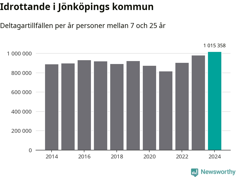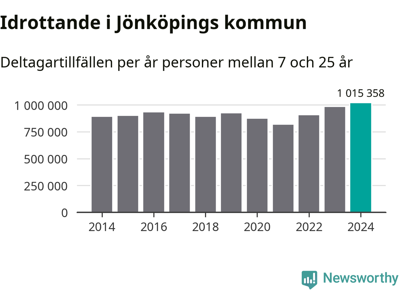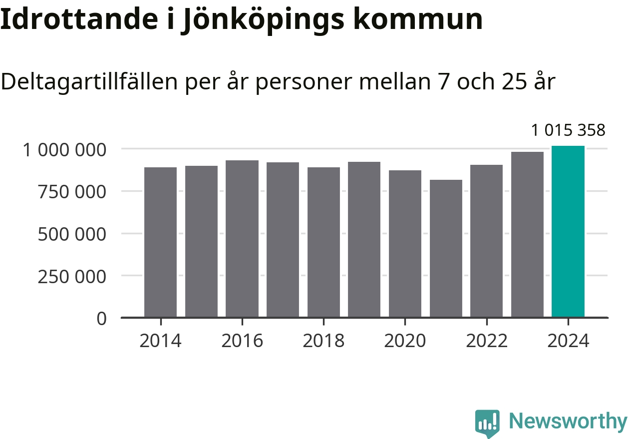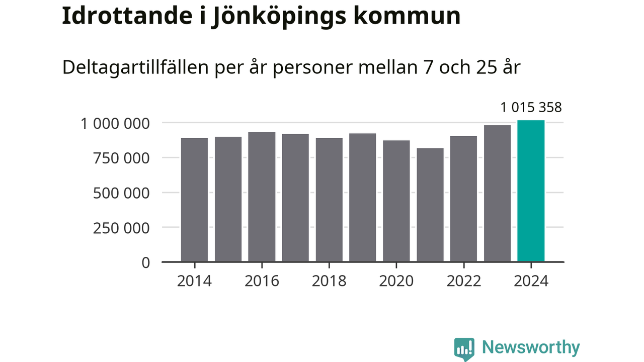 För tredje året i rad ökade aktiviteten inom ungdomsidrotten i Jönköpings kommun under 2024. Det visar nya siffror om utbetalt Lok-stöd, som delas ut till föreningar anslutna till Riksidrottsförbundet specialidrottsförbund. Stödet riktar sig till föreningar som bedriver verksamhet för deltagare i åldern 7-25 år. Under året rapporterade föreningarna i Jönköpings kommun drygt 1 015 000 deltagartillfällen, vilket är en ökning med fyra procent jämfört med 2023, och den högsta siffran i kommunen sedan åtminstone 2014. I riket som helhet ökade antalet deltagartillfällen med fem procent under 2024.