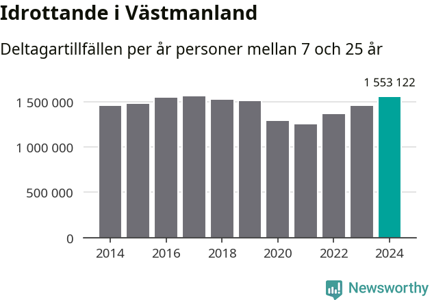De 1 553 000 deltagartillfällen innebär att varje invånare i Västmanland mellan 7 och 25 år i snitt deltog i 25 träningar, matcher eller turneringar under 2024. Flest deltagartillfällen per invånare i Västmanland hade Surahammars kommun med omkring 28 deltagartillfällen per invånare. I andra änden av listan finns Skinnskattebergs kommun, omkring 11 deltagartillfällen per invånare. Värt att nämna är att deltagartillfällena räknas i den kommun föreningen finns, det kan alltså vara ungdomar från en annan kommun som deltar.