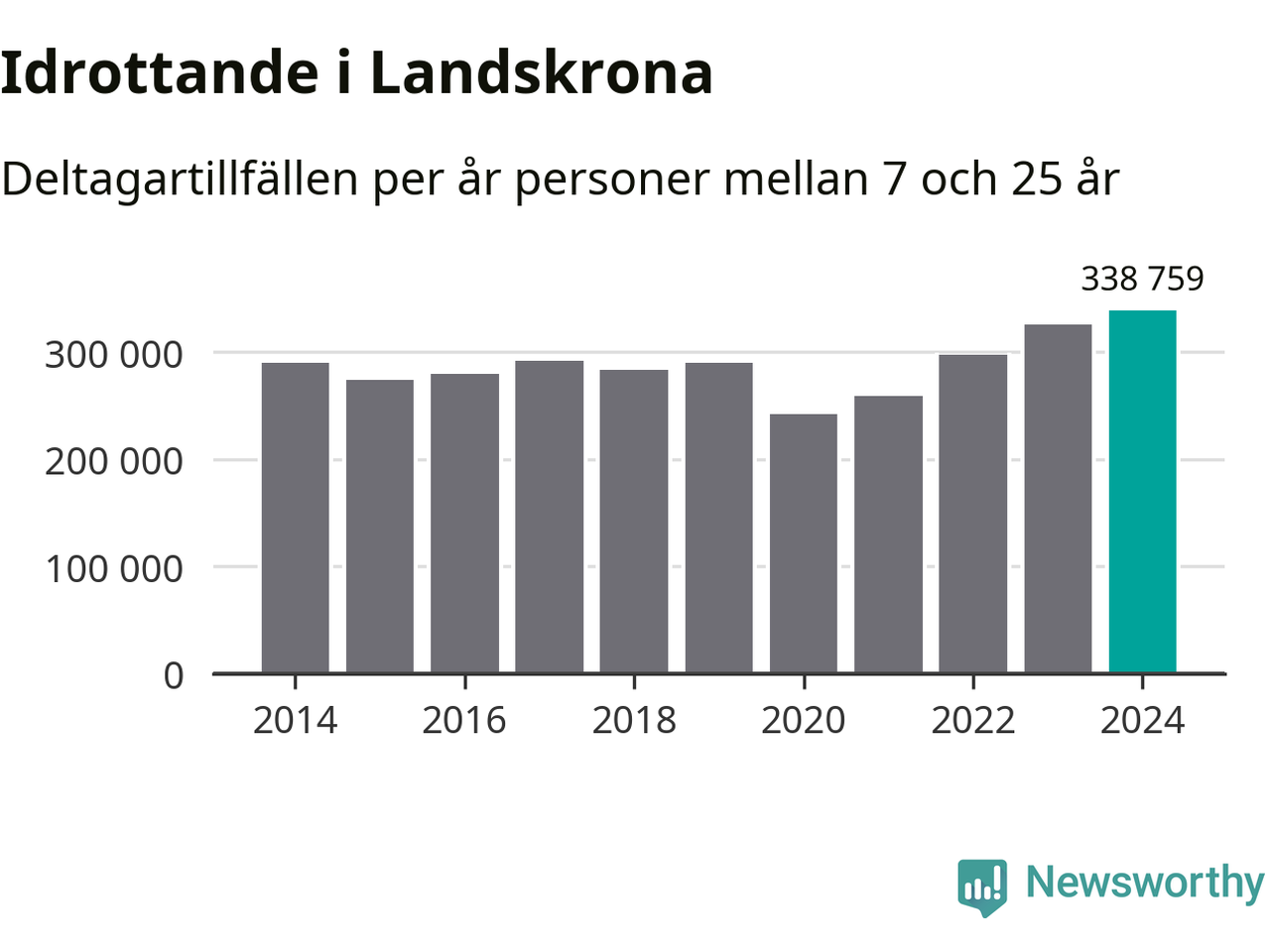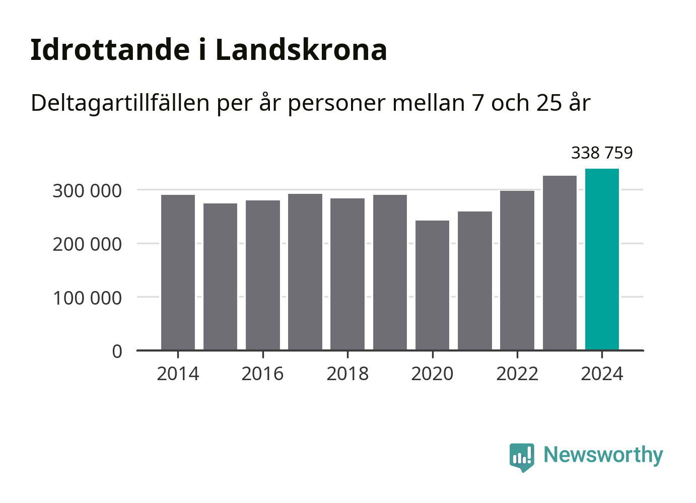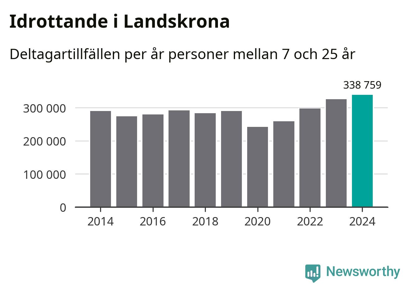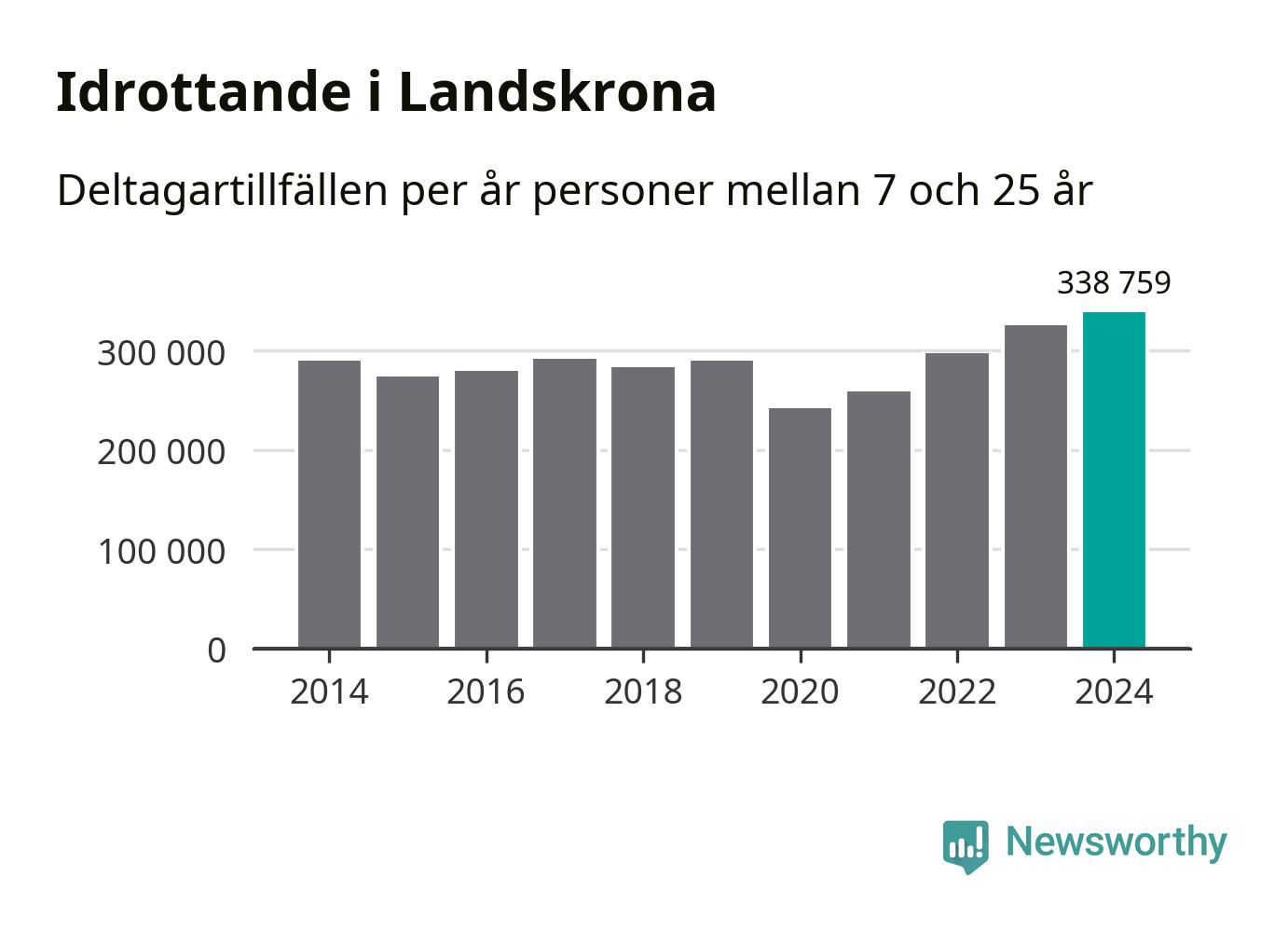 För fjärde året i rad ökade aktiviteten inom ungdomsidrotten i Landskrona under 2024. Det visar nya siffror om utbetalt Lok-stöd, som delas ut till föreningar anslutna till Riksidrottsförbundet specialidrottsförbund. Stödet riktar sig till föreningar som bedriver verksamhet för deltagare i åldern 7-25 år. Under året rapporterade föreningarna i Landskrona runt 339 000 deltagartillfällen, vilket är en ökning med fyra procent jämfört med 2023, och den högsta siffran i kommunen sedan åtminstone 2014. I riket som helhet ökade antalet deltagartillfällen med fem procent under 2024.