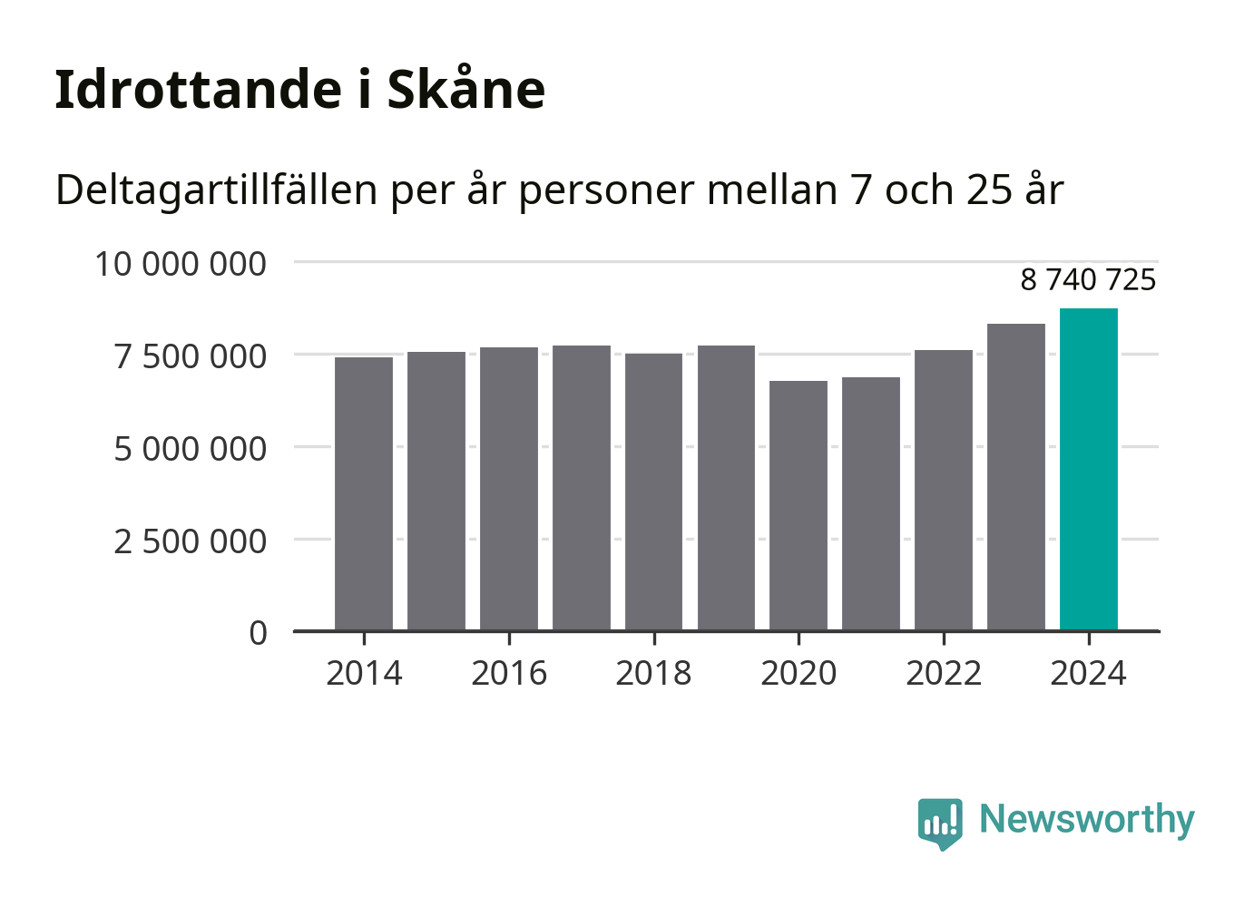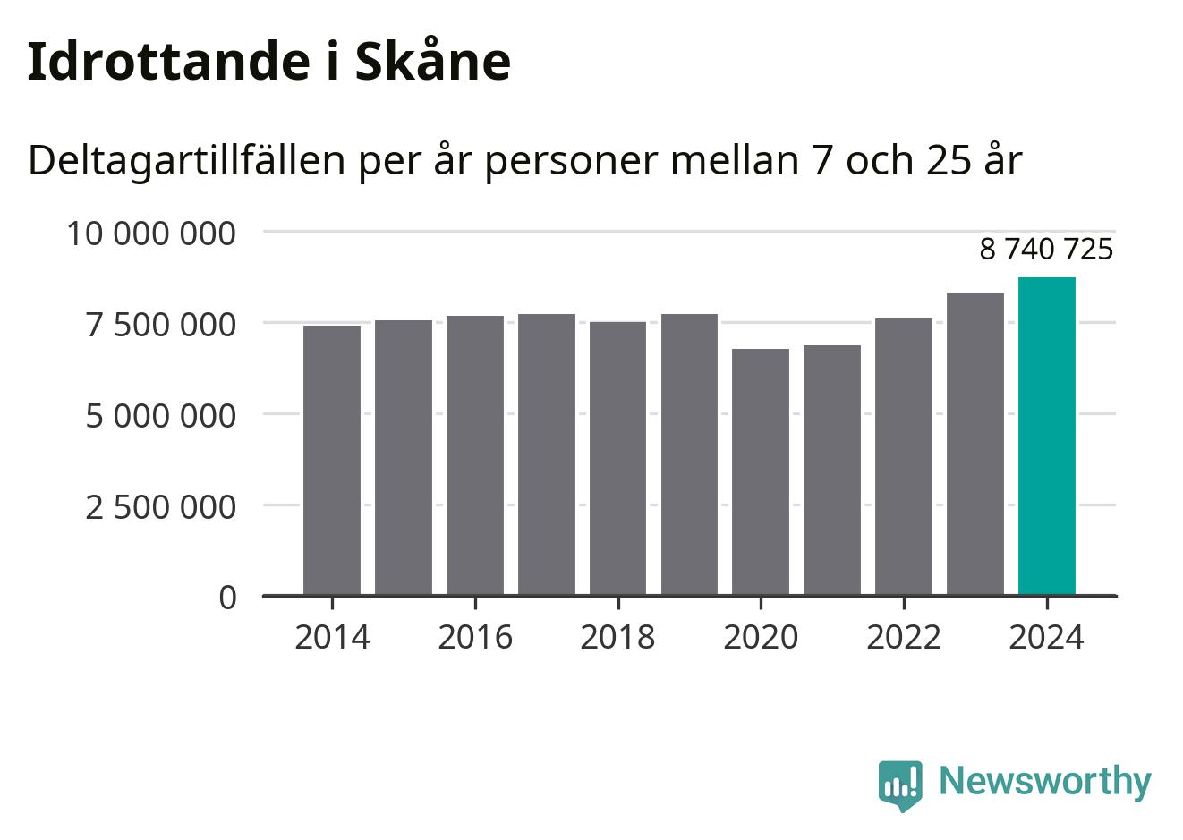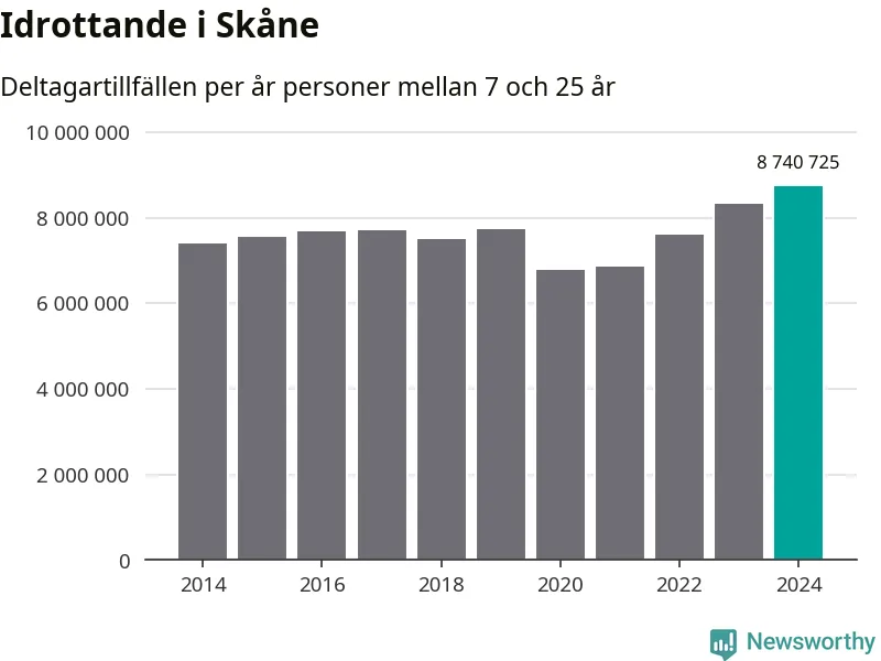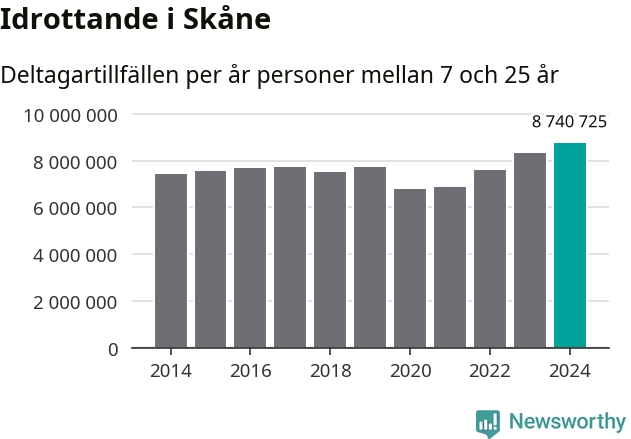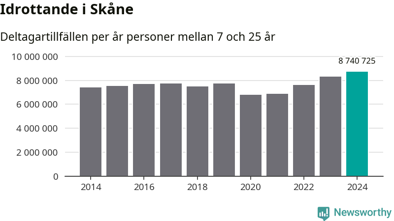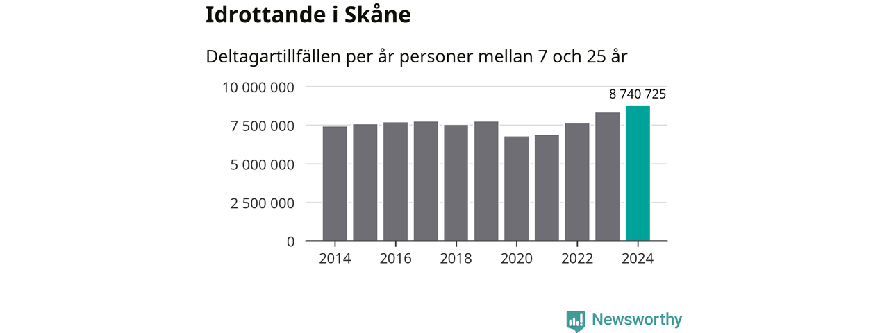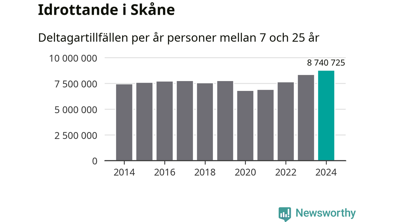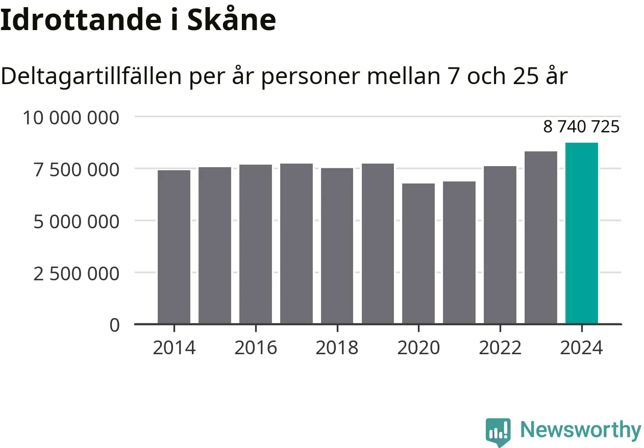 För tredje året i rad ökade aktiviteten inom ungdomsidrotten i Skåne under 2024. Det visar nya siffror om utbetalt Lok-stöd, som delas ut till föreningar anslutna till Riksidrottsförbundet specialidrottsförbund. Stödet riktar sig till föreningar som bedriver verksamhet för deltagare i åldern 7-25 år. Under året rapporterade föreningarna i Skåne runt 8 741 000 deltagartillfällen, vilket är en ökning med fem procent jämfört med 2023, och den högsta siffran i länet sedan åtminstone 2014. I riket som helhet ökade antalet deltagartillfällen med fem procent under 2024.