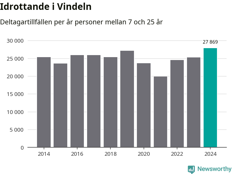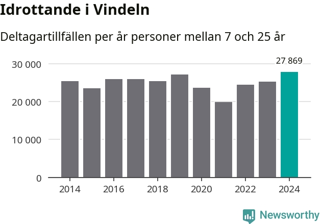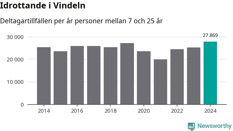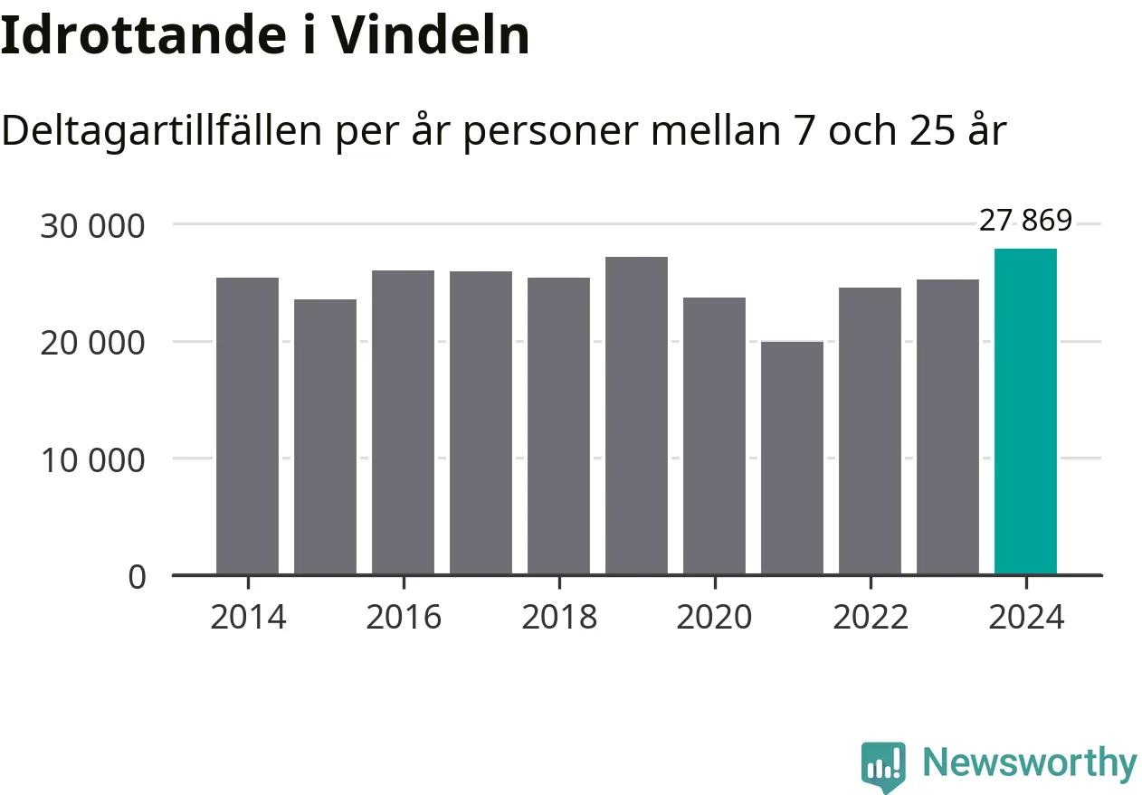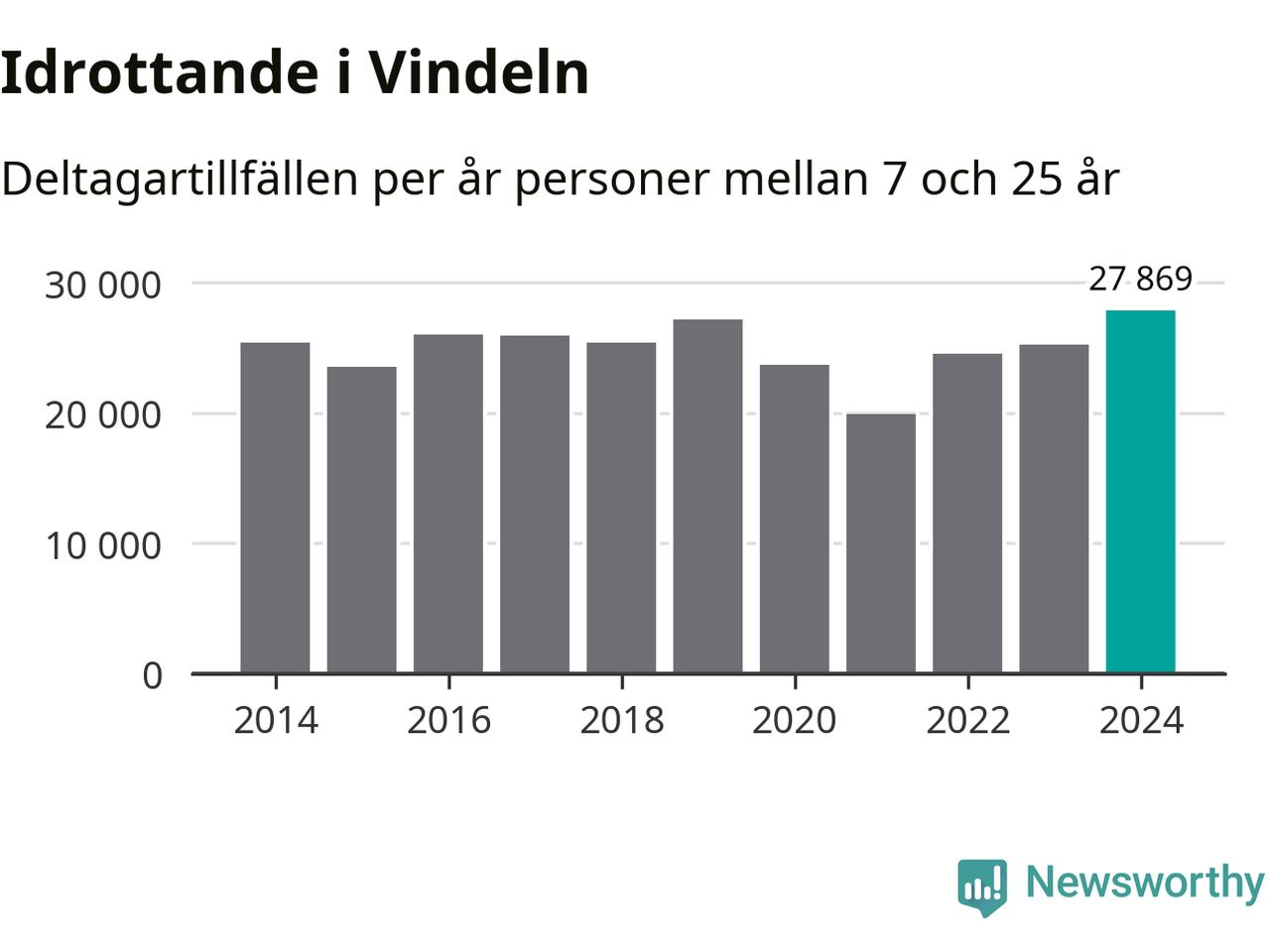 För tredje året i rad ökade aktiviteten inom ungdomsidrotten i Vindeln under 2024. Det visar nya siffror om utbetalt Lok-stöd, som delas ut till föreningar anslutna till Riksidrottsförbundet specialidrottsförbund. Stödet riktar sig till föreningar som bedriver verksamhet för deltagare i åldern 7-25 år. Under året rapporterade föreningarna i Vindeln runt 28 000 deltagartillfällen, vilket är en ökning med tio procent jämfört med 2023, och den högsta siffran i kommunen sedan åtminstone 2014. I riket som helhet ökade antalet deltagartillfällen med fem procent under 2024.