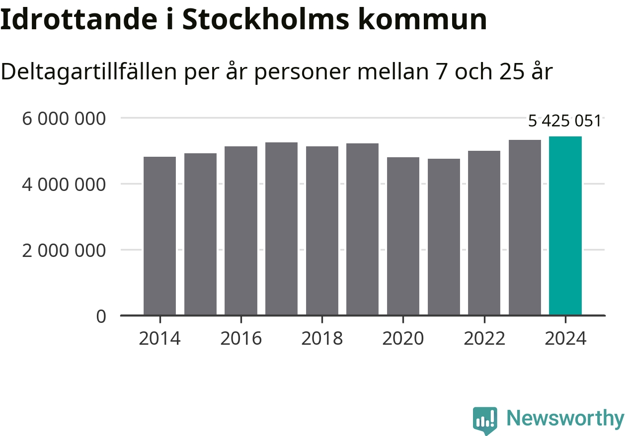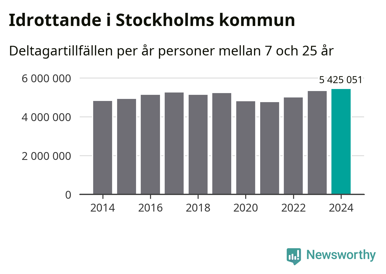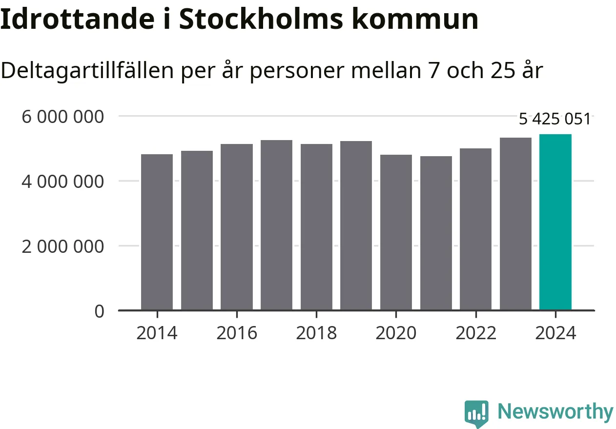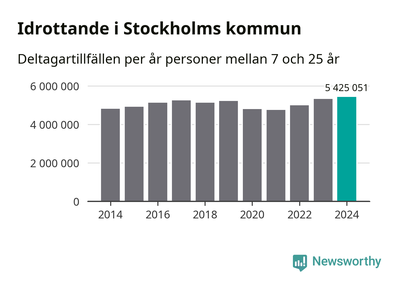 Idrottande ungdomar i Stockholms kommun registrerades för omkring 5 425 000 deltagartillfällen under 2024. Det är något fler än året innan och den högsta siffran i kommunen sedan åtminstone 2014. Det visar nya siffror om utbetalt Lok-stöd, som delas ut till föreningar anslutna till Riksidrottsförbundet specialidrottsförbund. Stödet riktar sig till föreningar som bedriver verksamhet för deltagare i åldern 7-25 år. I riket som helhet ökade antalet deltagartillfällen med fem procent under 2024.